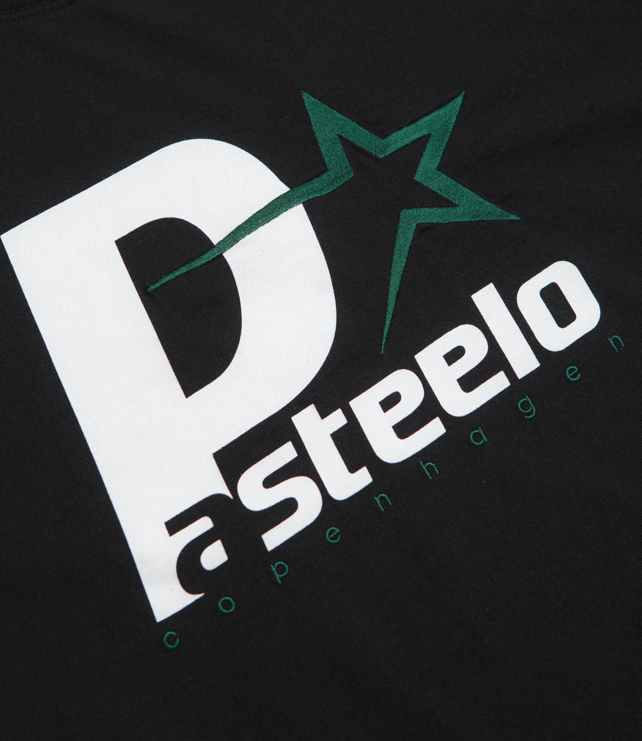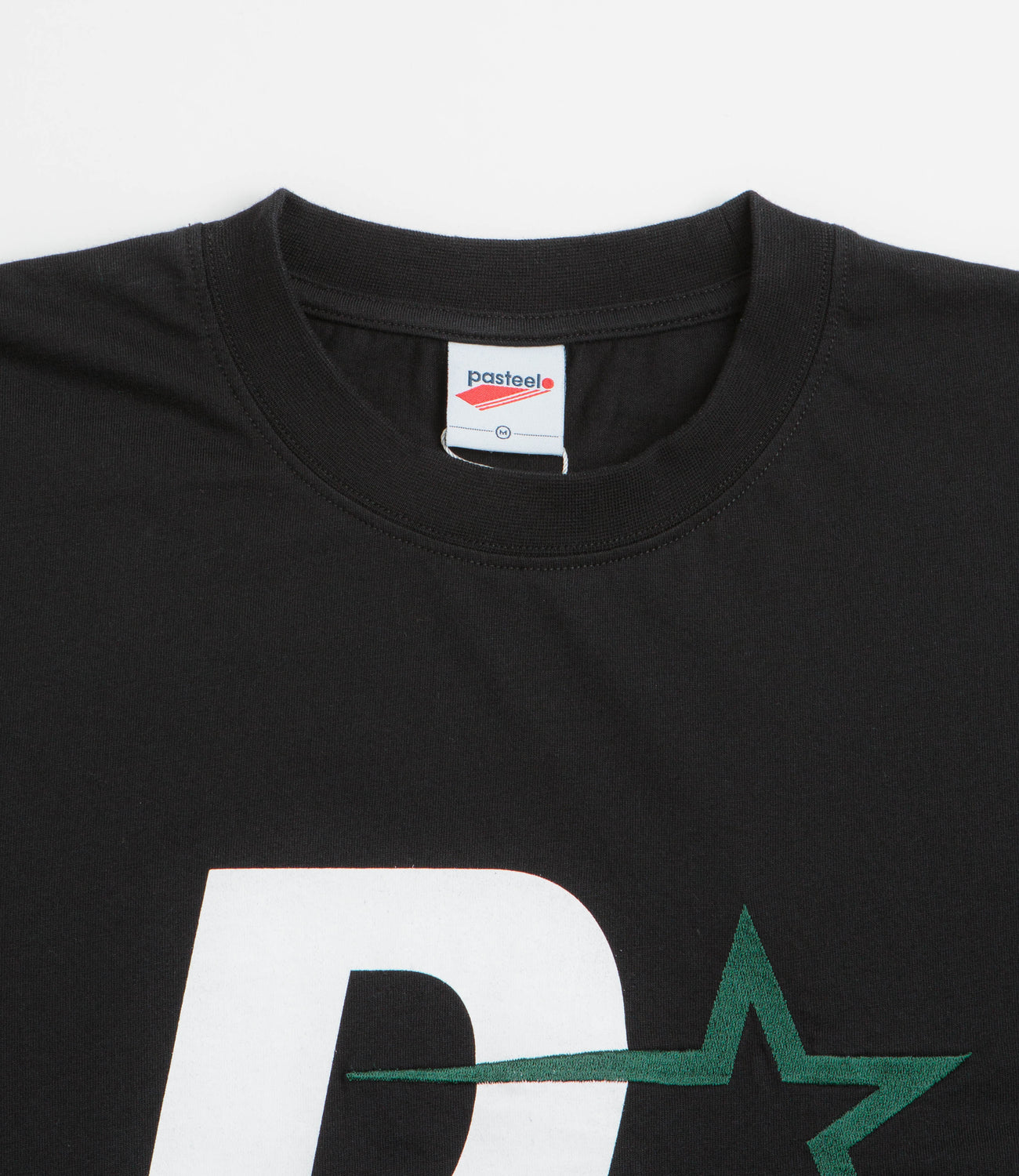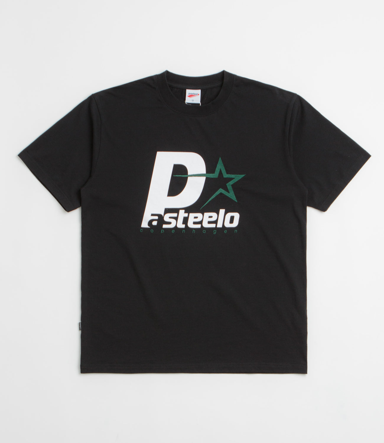 Pasteelo P Steelo T-Shirt in Black and White. Regular fitting and made from a cotton-polyester blend, this block tone Pasteelo t-shirt is designed with a classic crew collar. Finished in black with an embroidered and screen printed graphic.