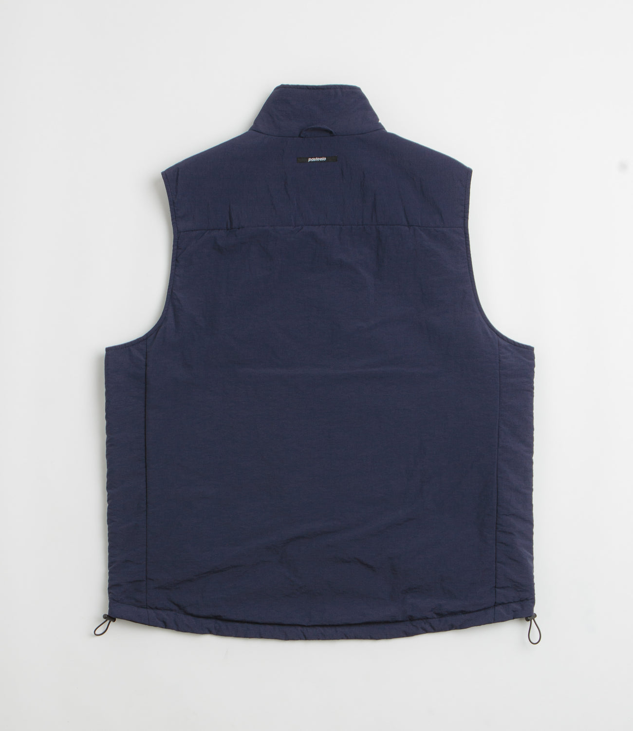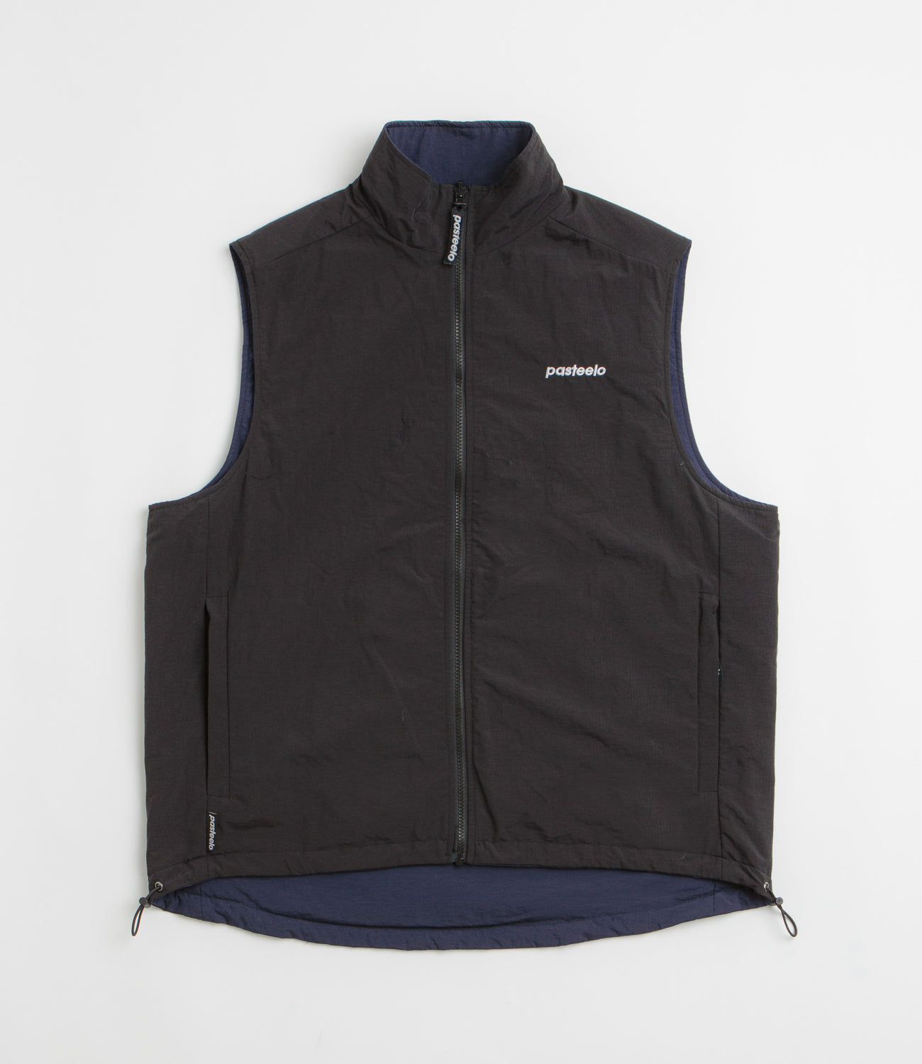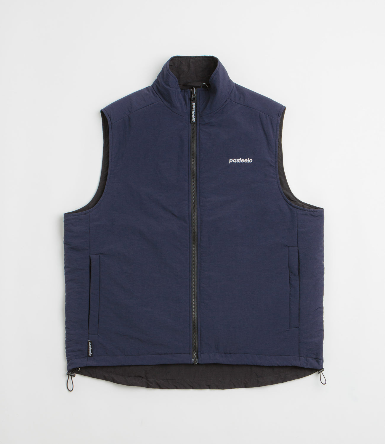 Pasteelo Reversible Vest in Navy and Black. Reversible with 60g insulation, this regular fitting Pasteelo vest is made from 100% ripstop nylon. Featuring a full length zipper fastening, this navy black Pasteelo vest is finished with zippered pockets, flag label detailing, an embroidered logo and a toggle-cord adjustable hem.