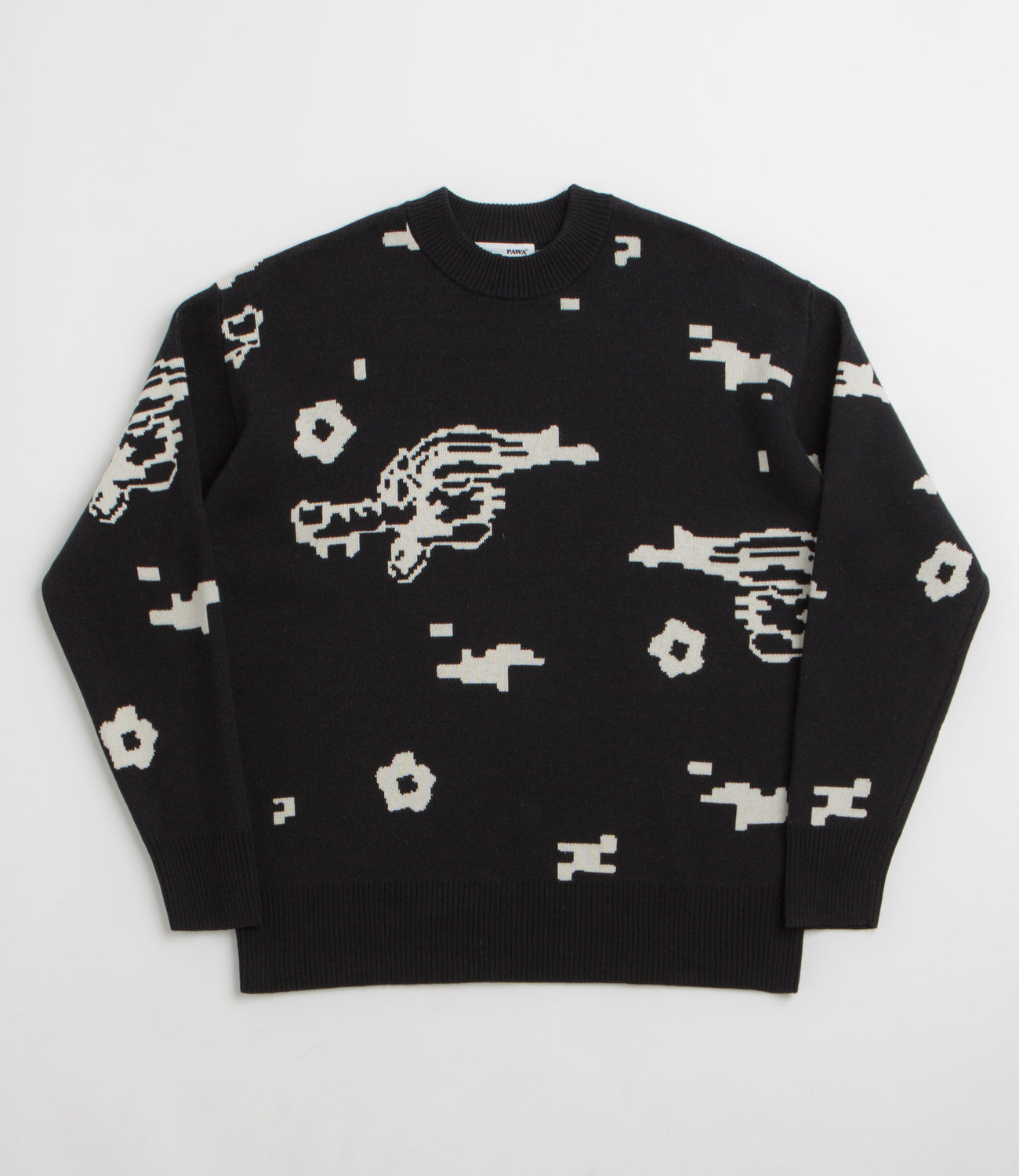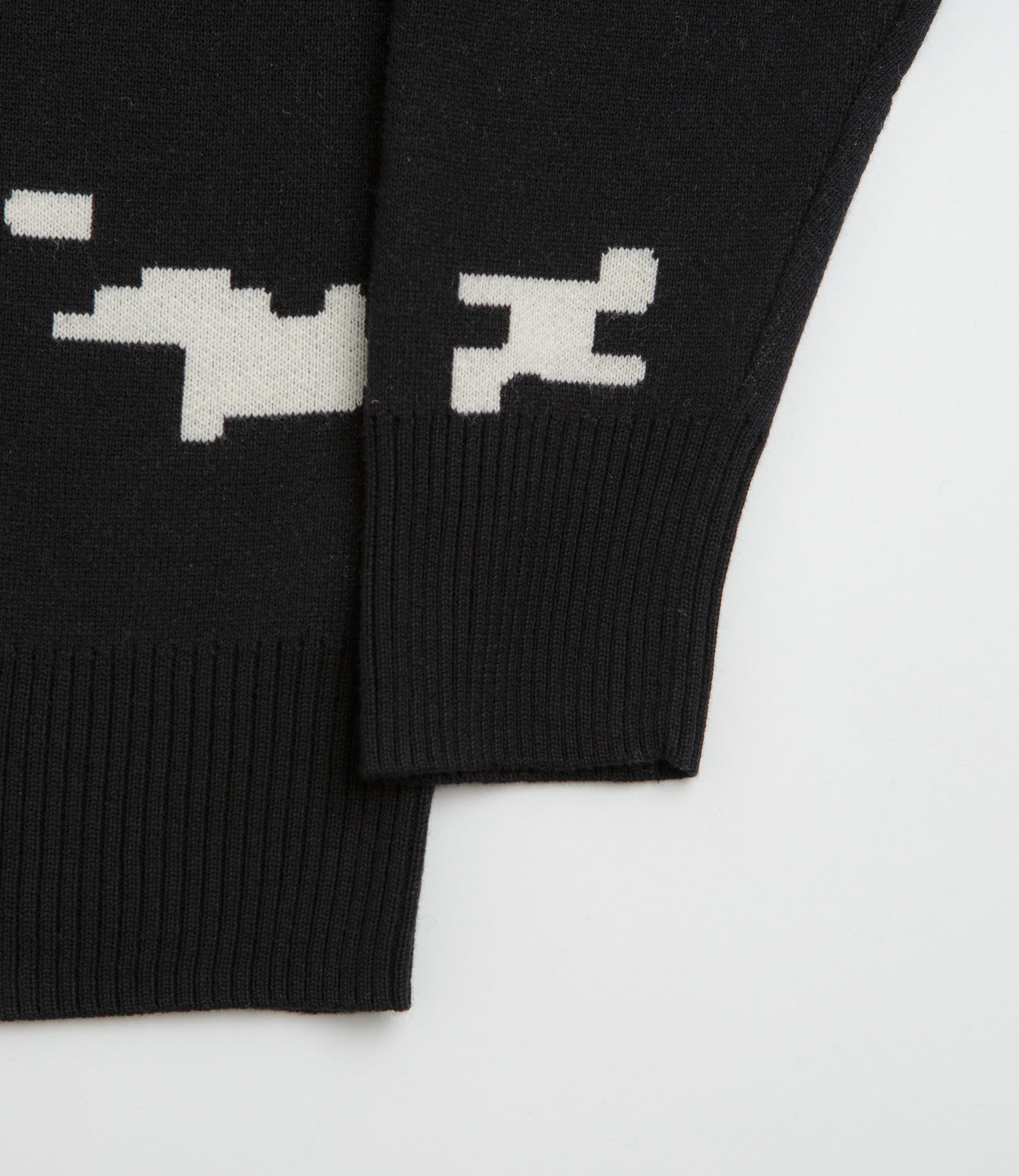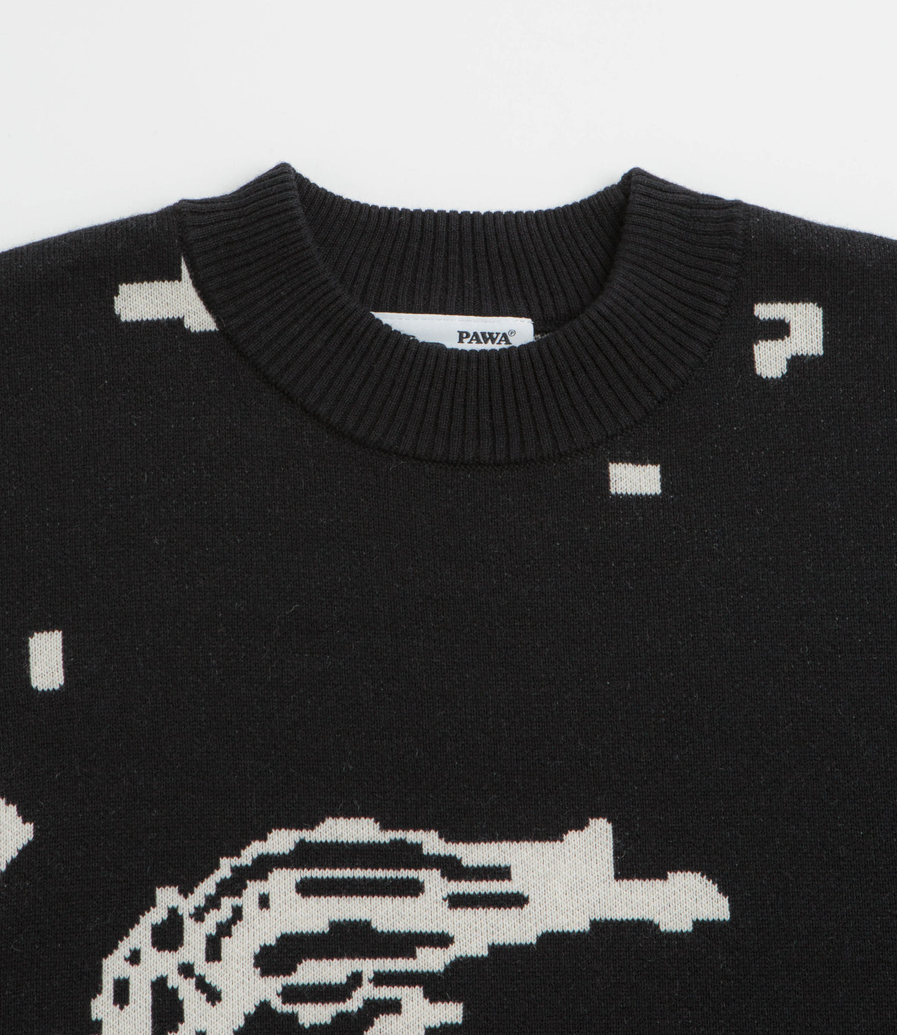 Pawa Speed Sports Digi Doggo Knit Sweatshirt in Black. Designed with all-over jacquard artwork, this regular fitting Pawa sweatshirt is made from a cotton-wool blend. Finished in black with a rib knit collar, ribbed cuffs and a woven elastic hem.