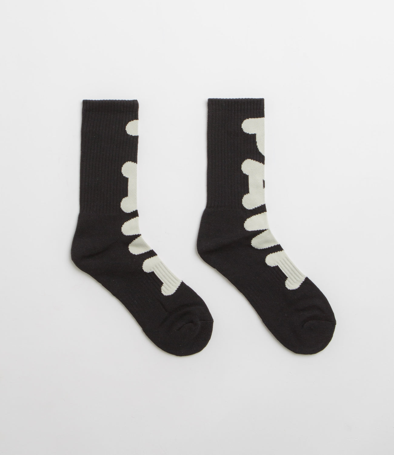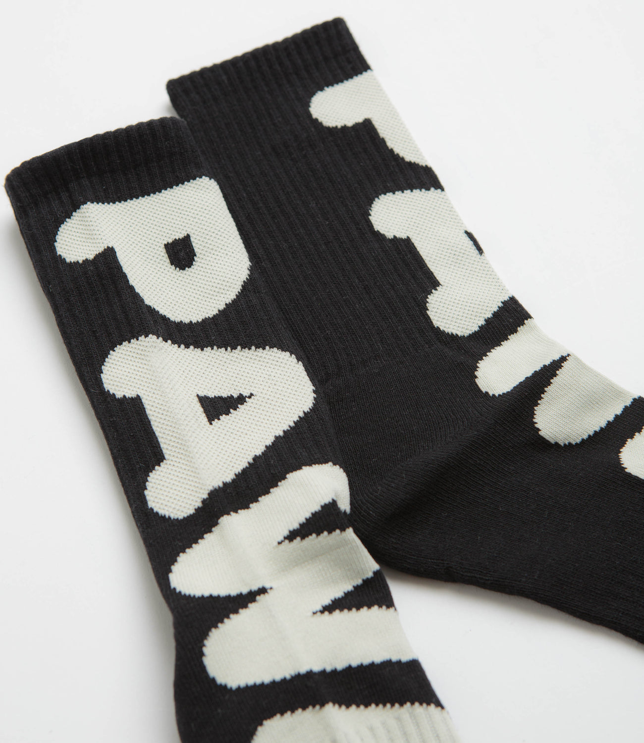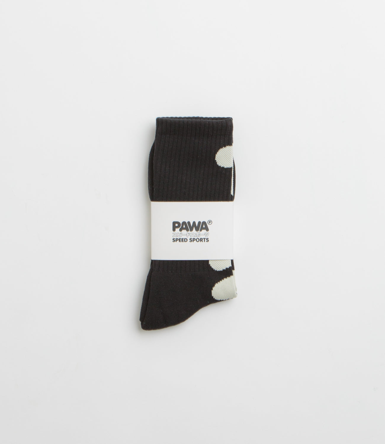 Pawa Speed Sports Speed Socks in Black. Cut to crew length with ribbed cuffs, these Pawa socks are made from a cotton blend. Finished in white with jacquard knit Pawa artwork.