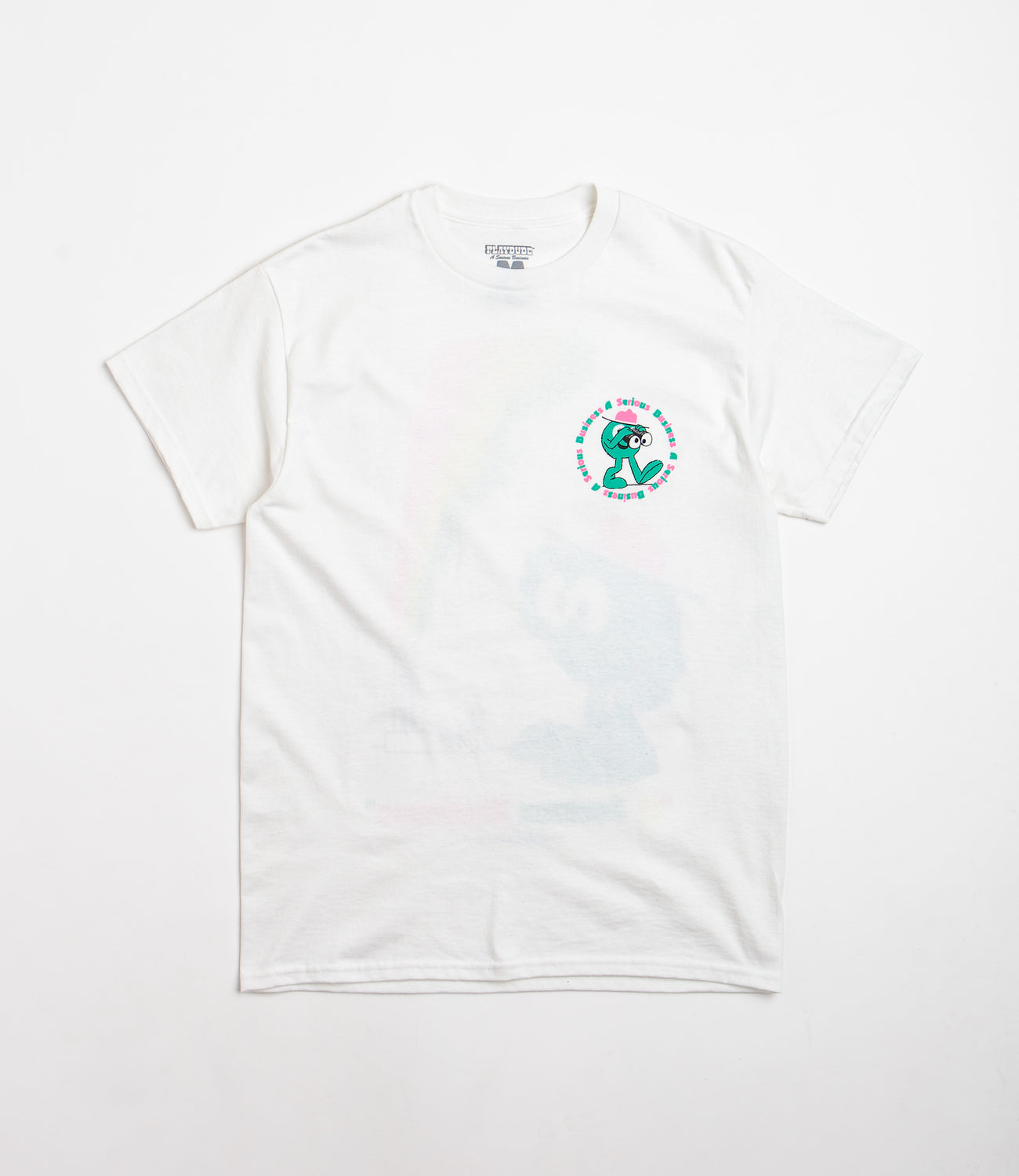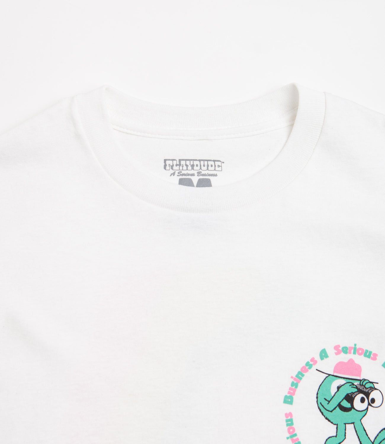 Playdude Factory T-Shirt in White. Tailored to a regular fitting from 100% cotton, this new season Playdude t-shirt is styled with a casual crew collar and a reinforced hem. Finished in a shade of white with screen printed artwork displayed across both the left chest and reverse.