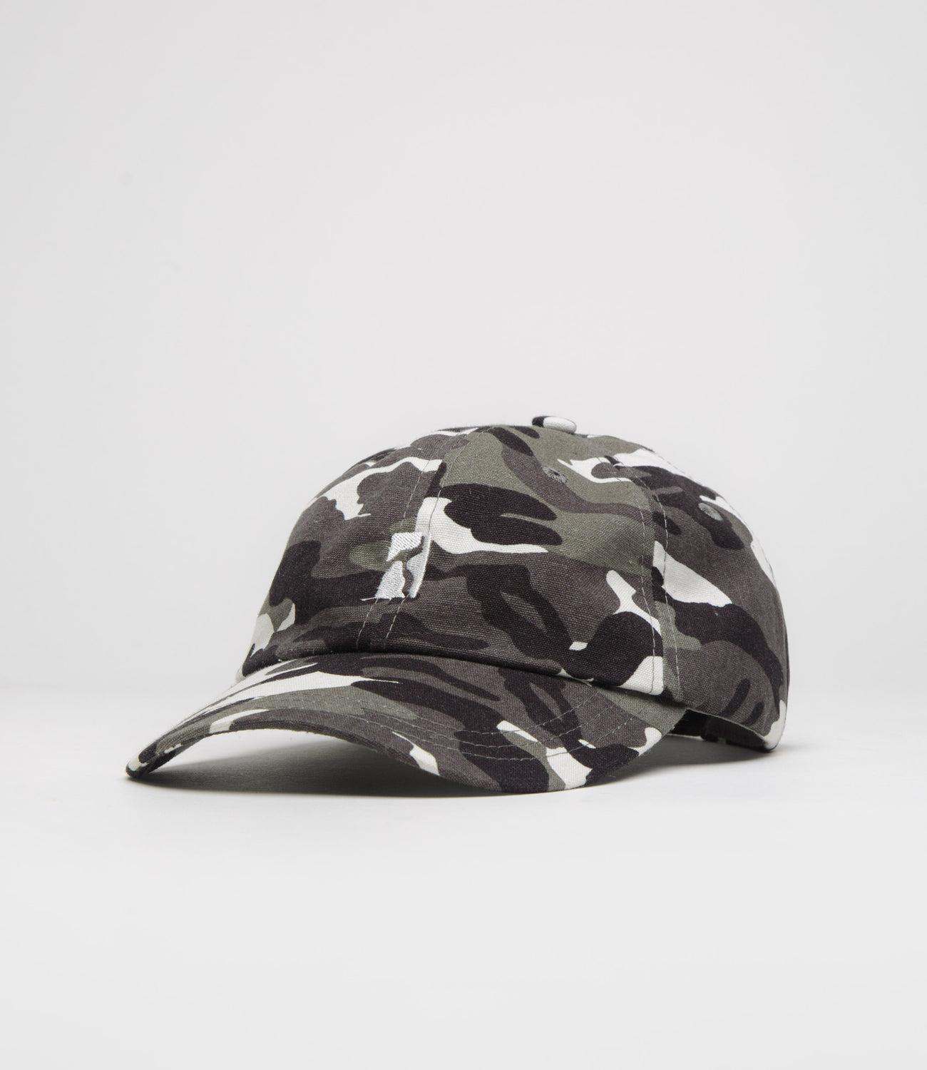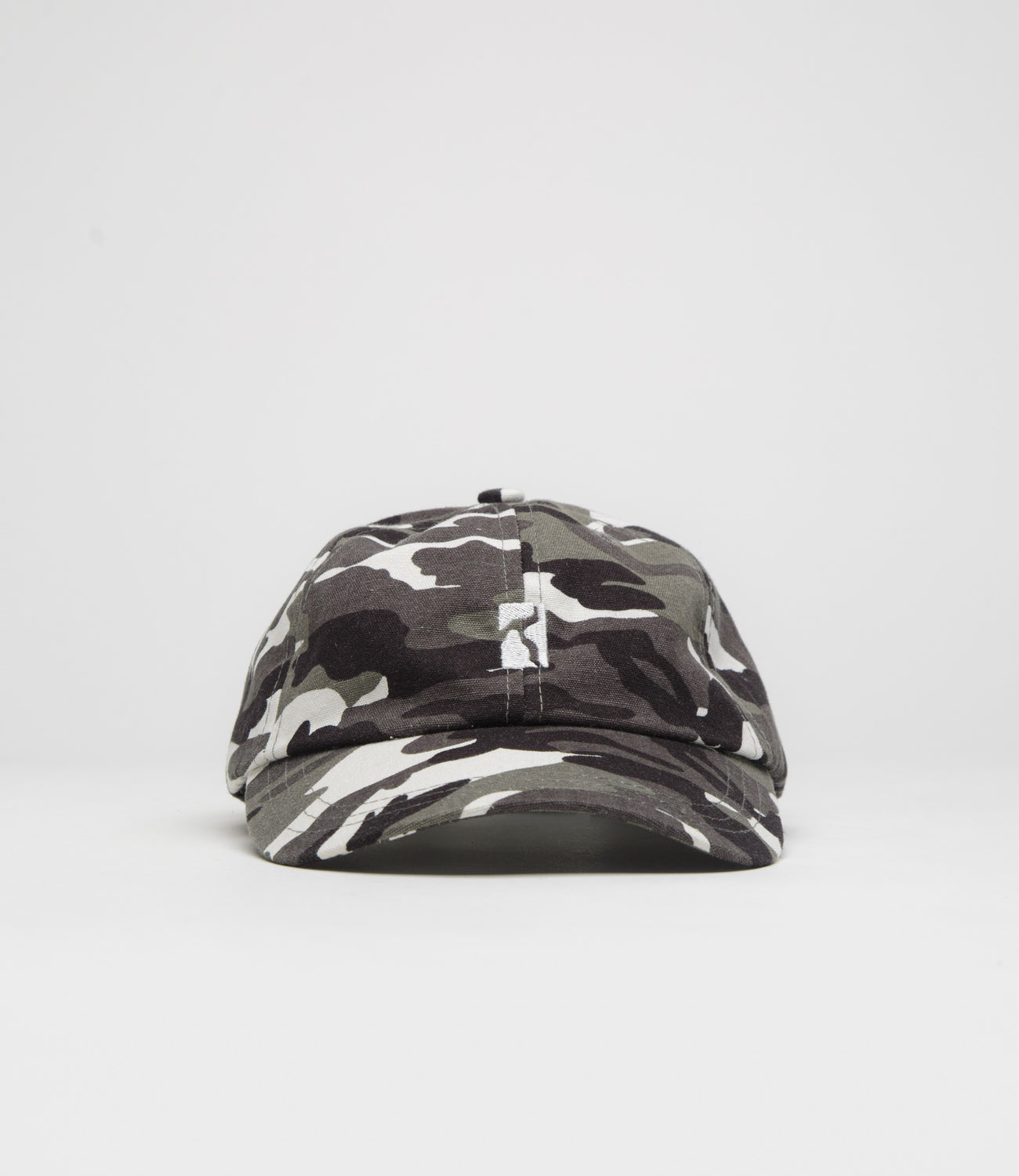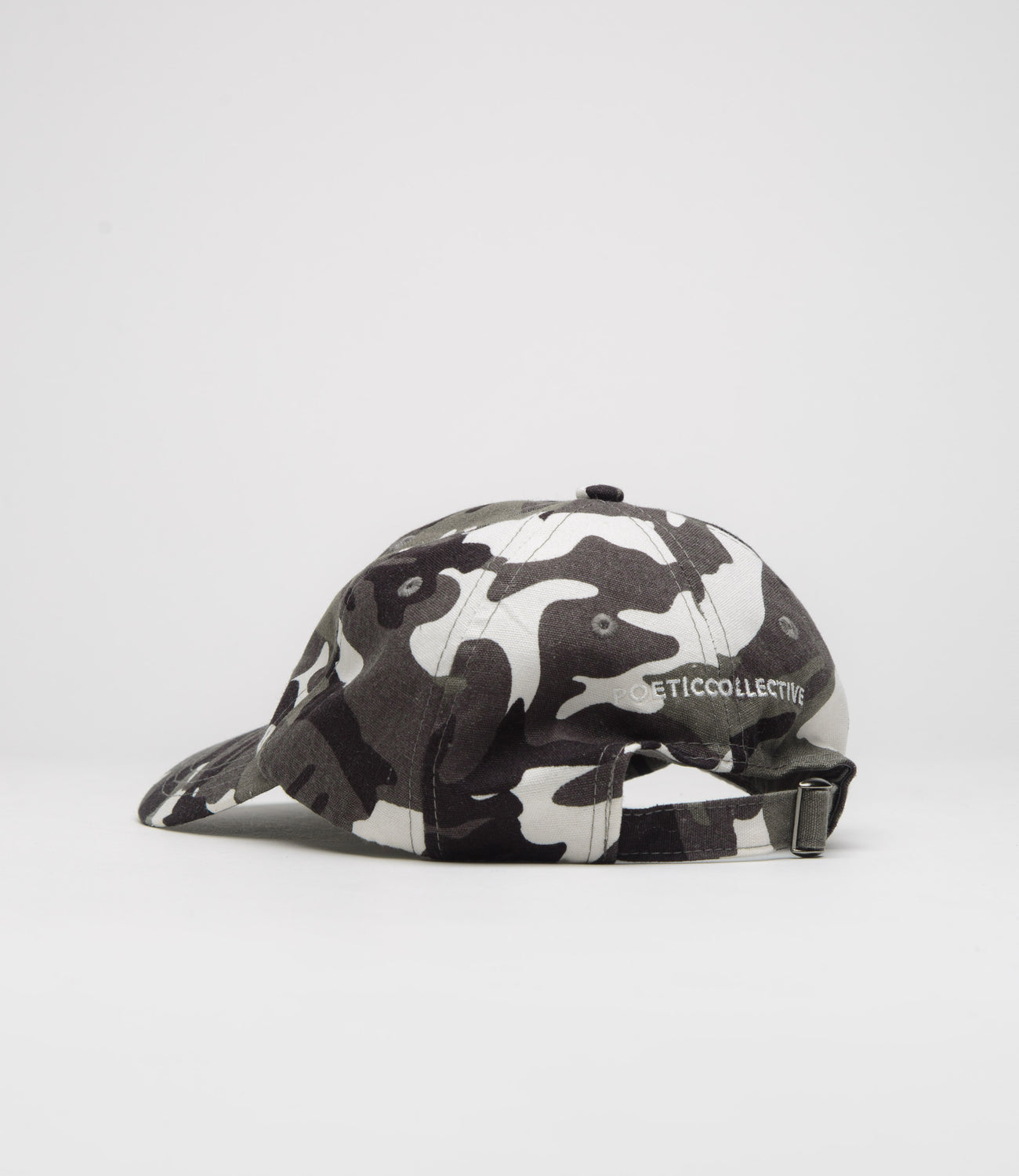 Poetic Collective Classic Cap in Black Camo. Designed with an all-over camouflage pattern, this Poetic Collective cap is made from 100% cotton. Featuring embroidered eyelets and a curved peak, this black camo Poetic Collective cap is finished with an adjustable rear fastening and an embroidered logo.