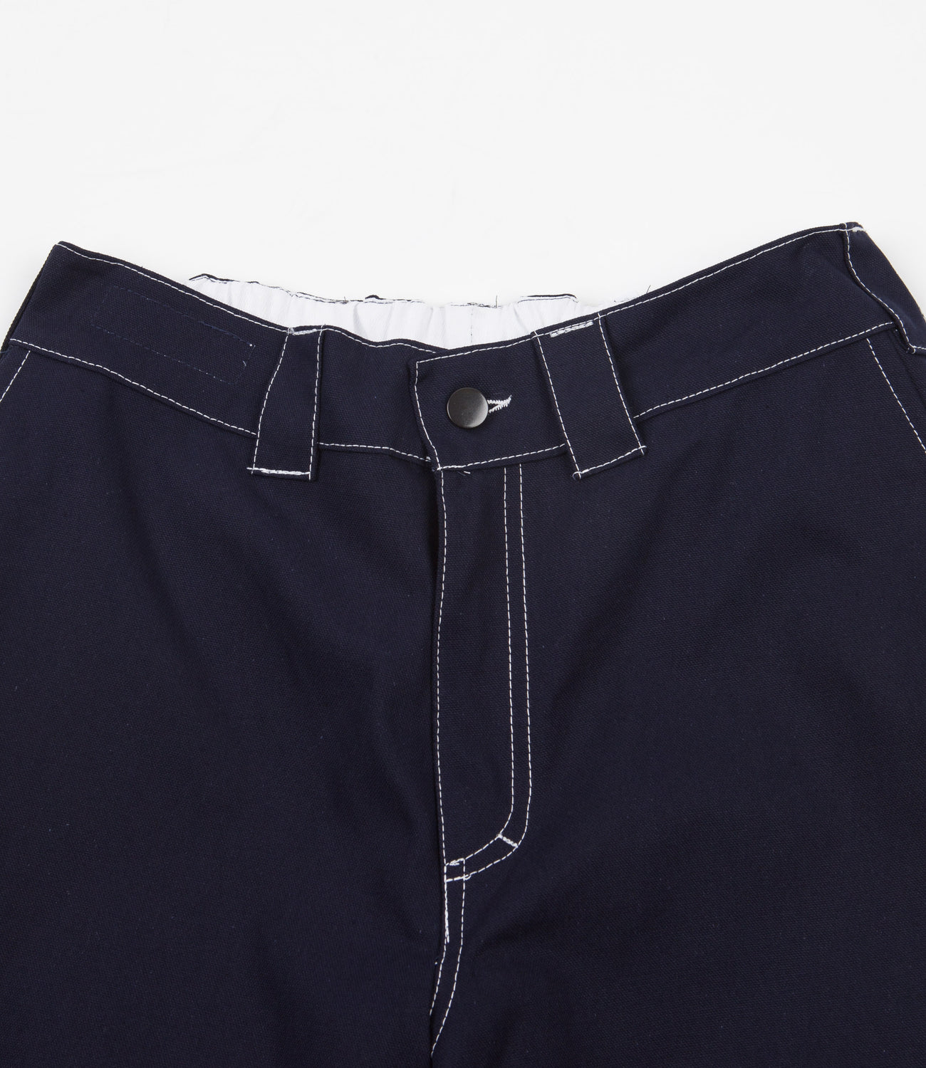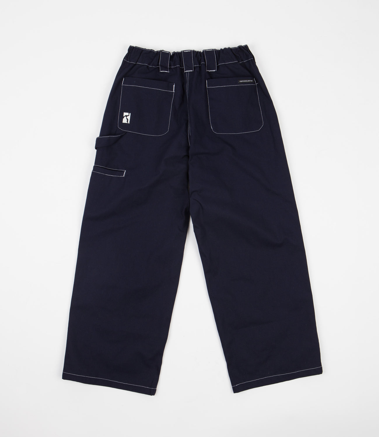 Poetic Collective Sculptor Pants in Navy and White. Workwear inspired and arriving as part of the brand’s latest W21 collection, these straight legged Poetic Collective pants are crafted from 100% premium cotton canvas and designed with a heavyweight composure for elevated longevity regardless of setting. Tailored to a relaxed fitting, these dark navy sculptor pants feature a woven elastic waist, integrated belt loop fastenings, a single button secured YKK zipper fly and double layer knee panel reinforcements for further structural support. Two side entry pockets are mirrored by two patch pockets on the reverse, whilst the woven hammer loop and utility stash are styled with the design’s utilitarian undertone in mind. Signed off with colour contrasting crisp white stitched seams and with a tonal embroidered cracked logo sewn across the corner of the rear left pocket.