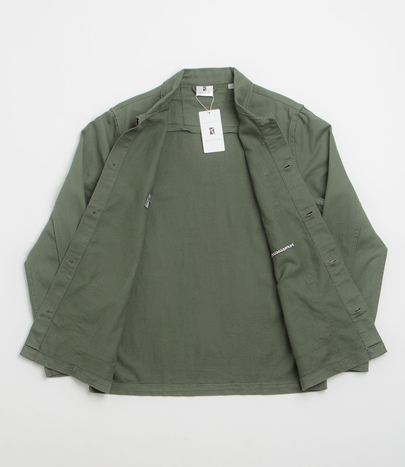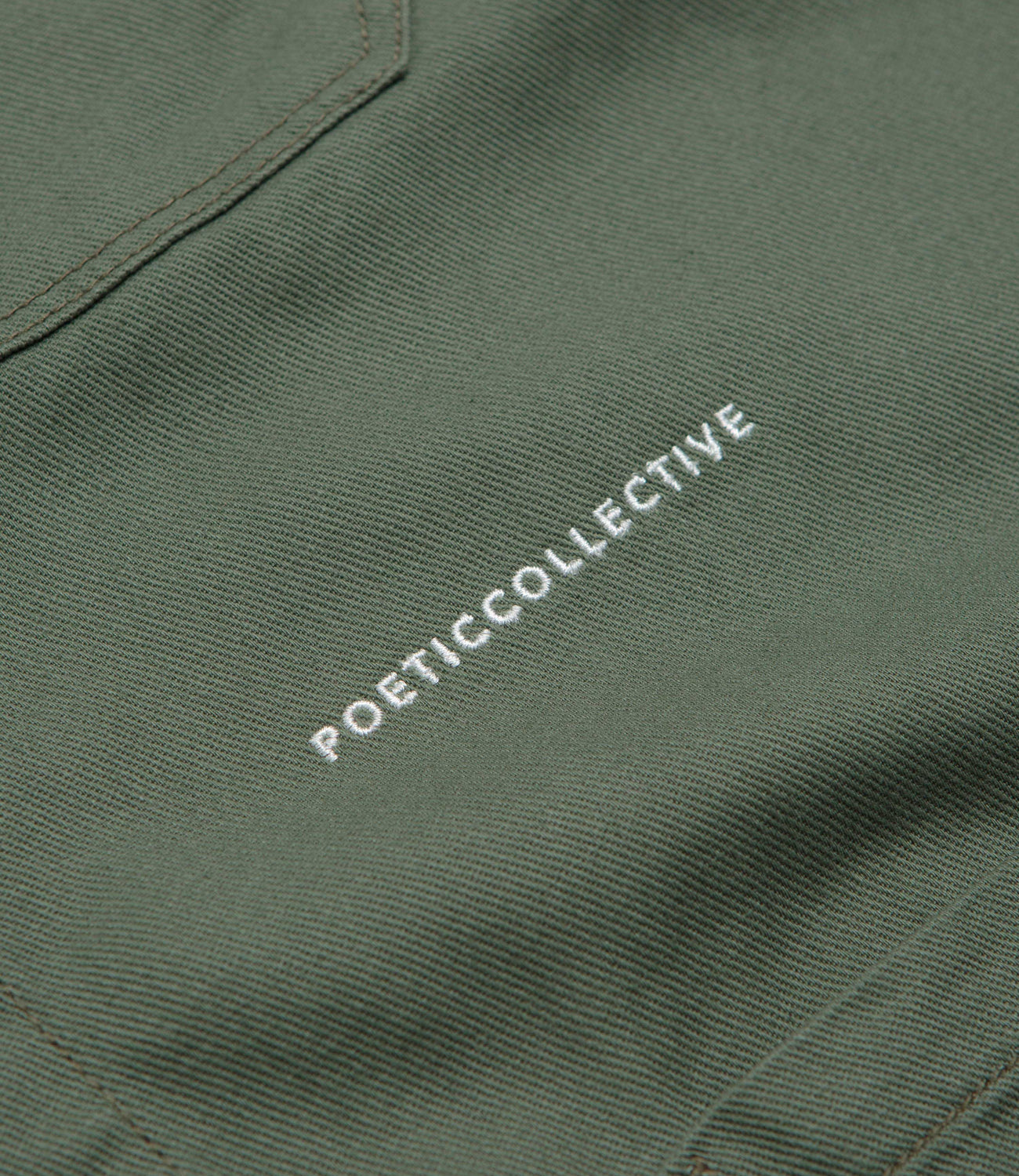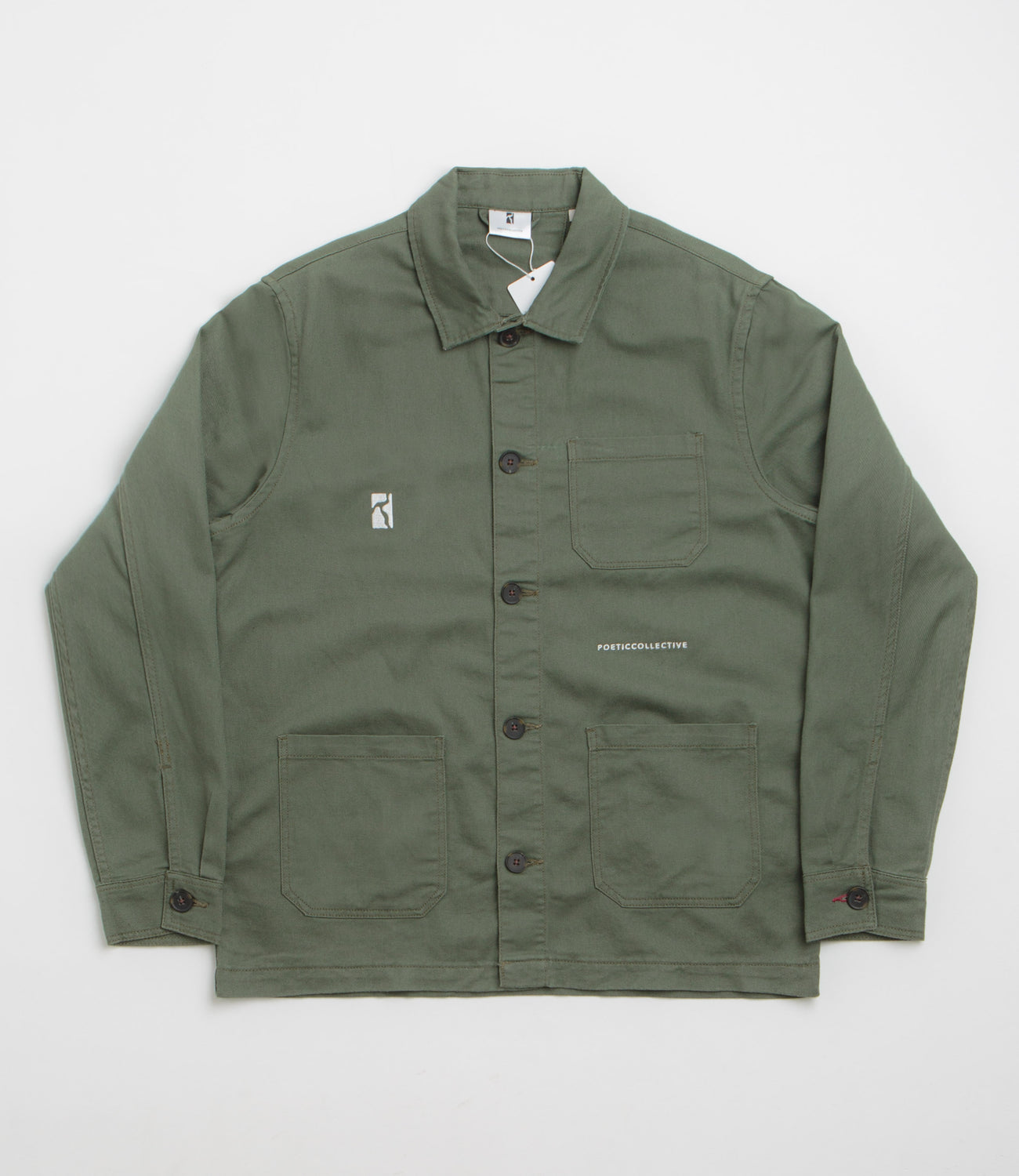 Poetic Collective Worker Jacket in Green. Workwear inspired and tailored to a regular fitting, this Poetic Collective jacket is made from an organic cotton and linen blend. Featuring a full length button fastening, a classic stand collar and reinforced cuffs, this green Poetic Collective jacket is finished with two waist pockets, a single chest pocket and embroidered logo branding.