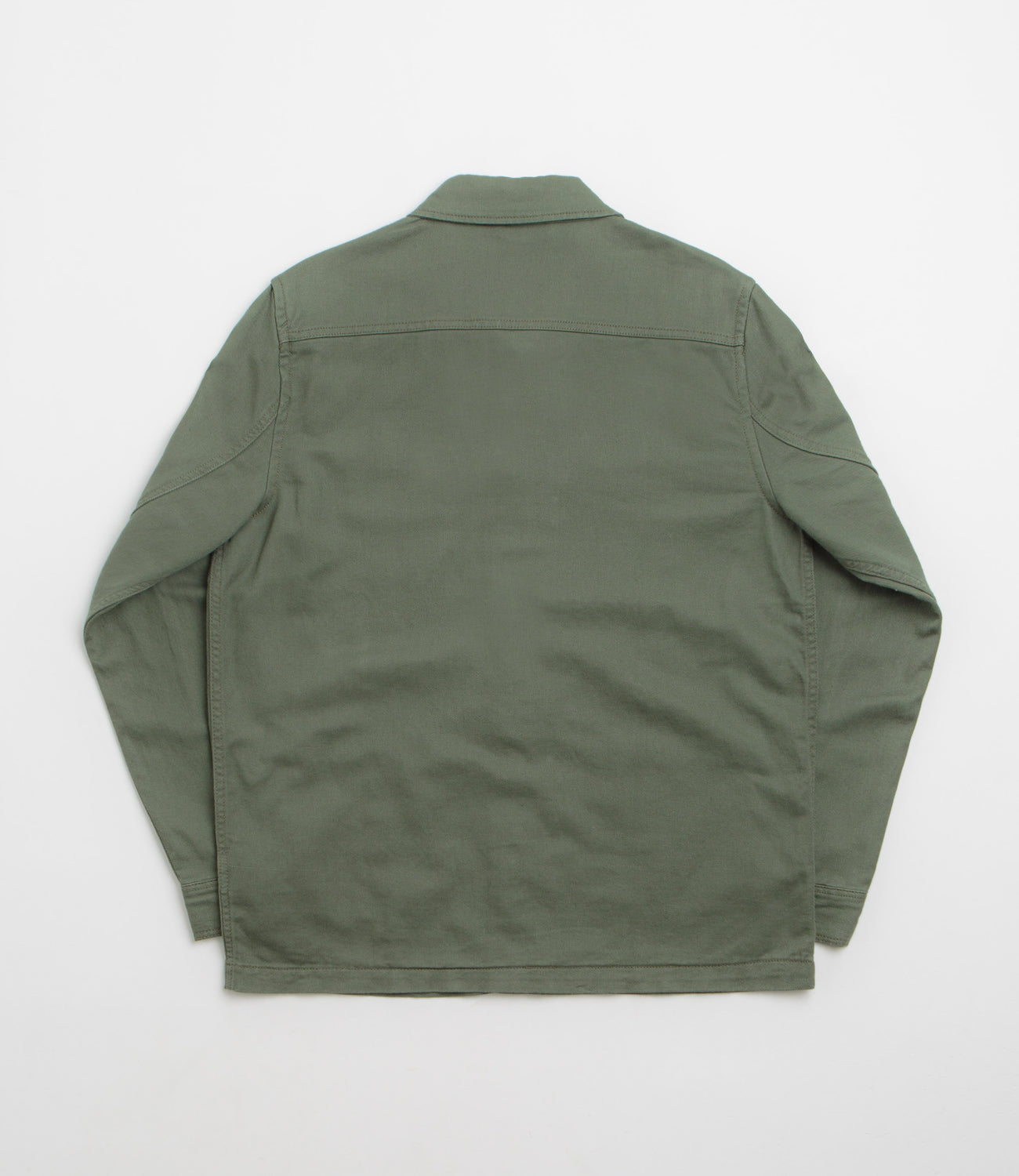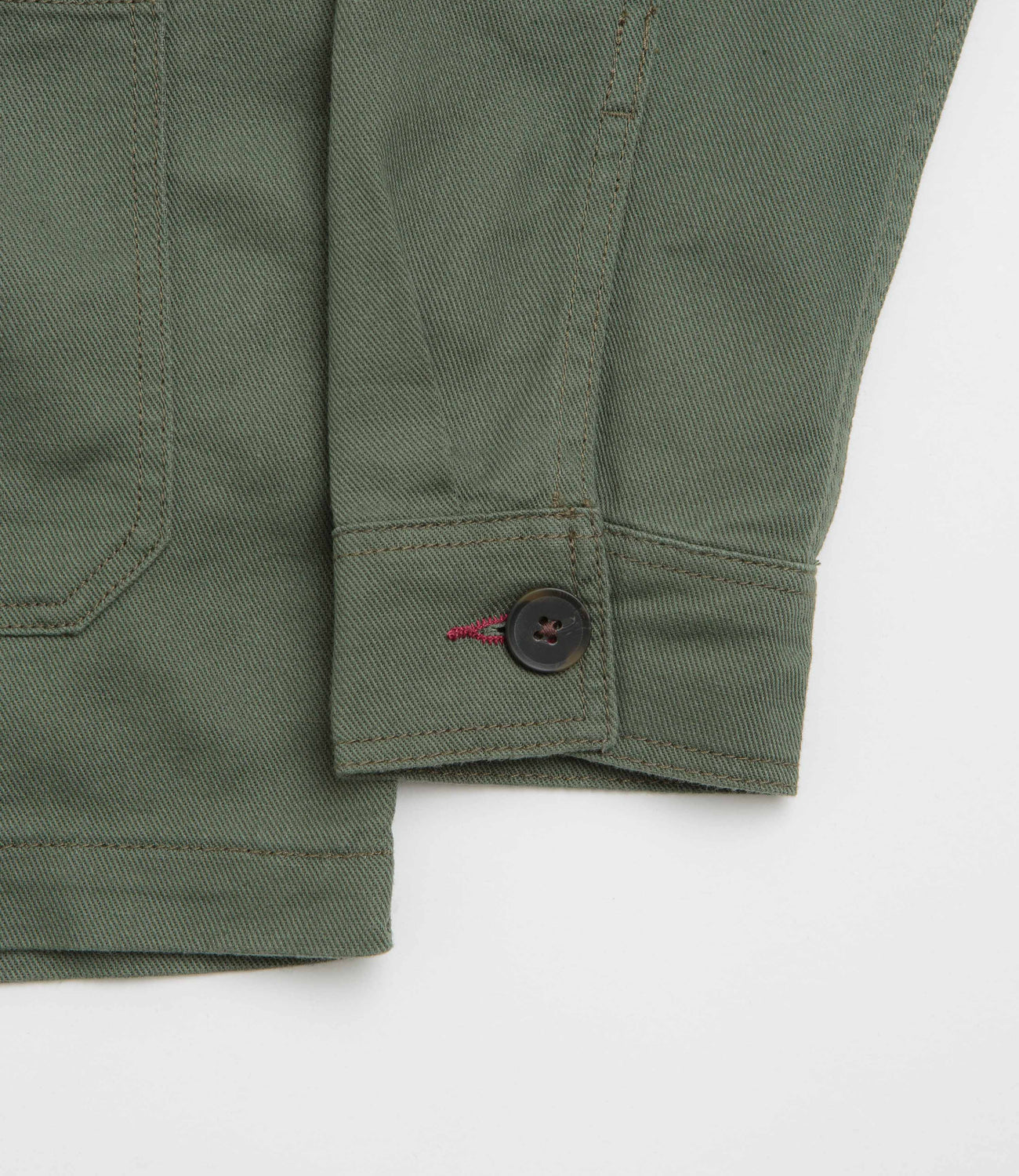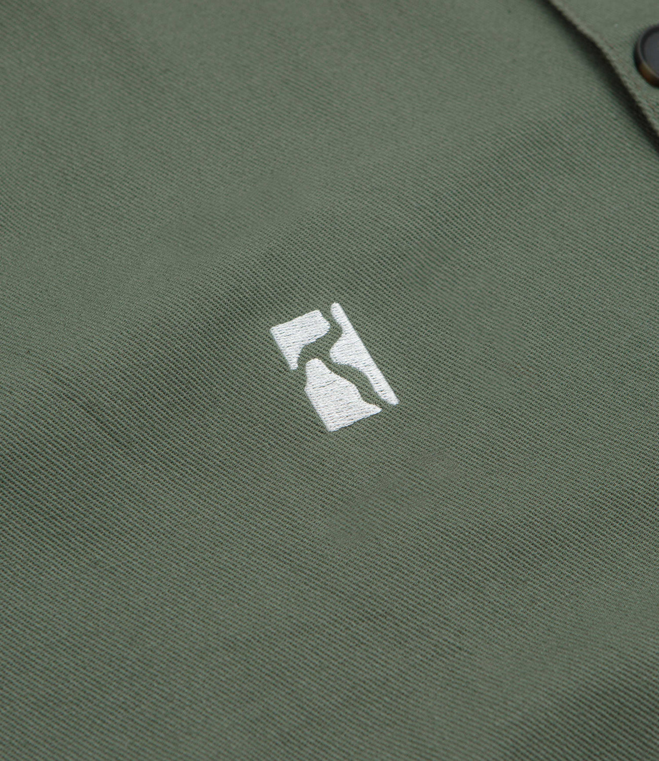 Poetic Collective Worker Jacket in Green. Workwear inspired and tailored to a regular fitting, this Poetic Collective jacket is made from an organic cotton and linen blend. Featuring a full length button fastening, a classic stand collar and reinforced cuffs, this green Poetic Collective jacket is finished with two waist pockets, a single chest pocket and embroidered logo branding.