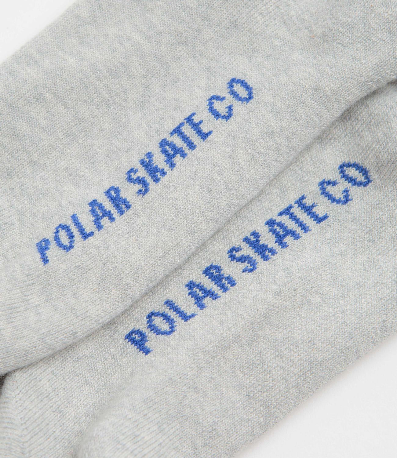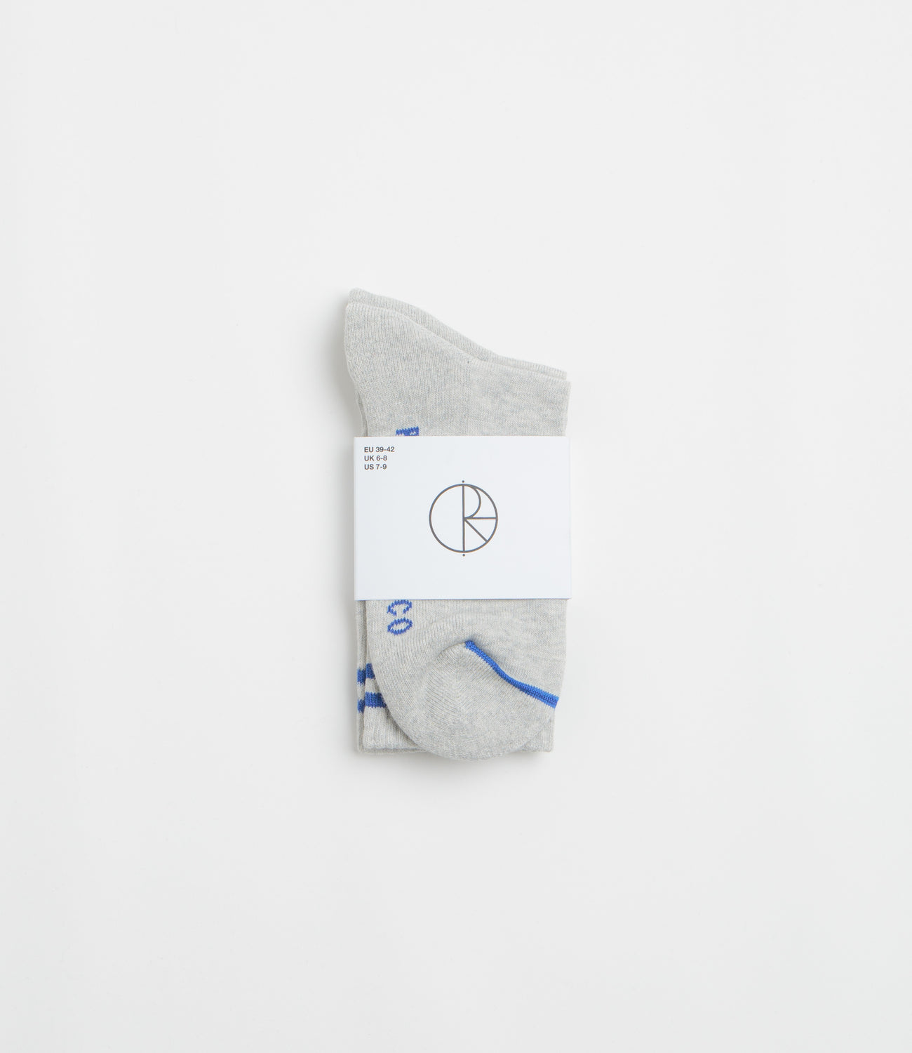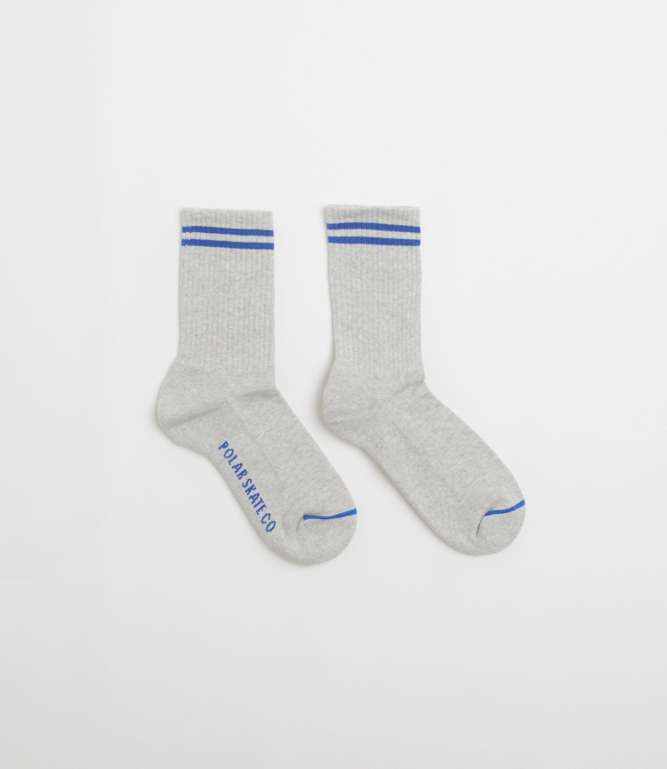 Polar 2 Stripe Socks in Heather Grey and Blue. Made from a cotton-polyester blend, these crew length Polar socks are designed with ribbed cuffs and jacquard stripes. Finished in heather grey with contrast ankle, toe box and sole details.