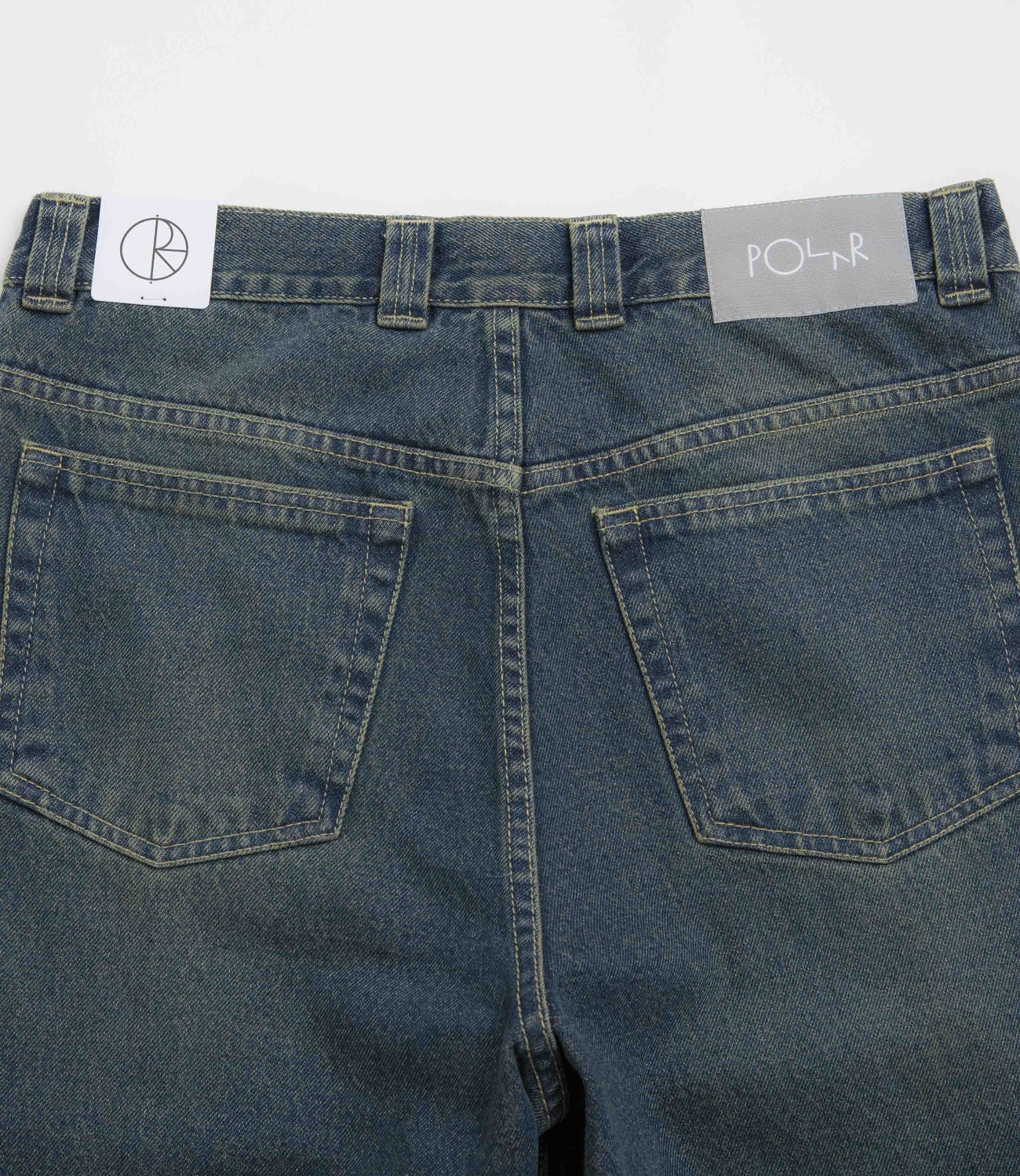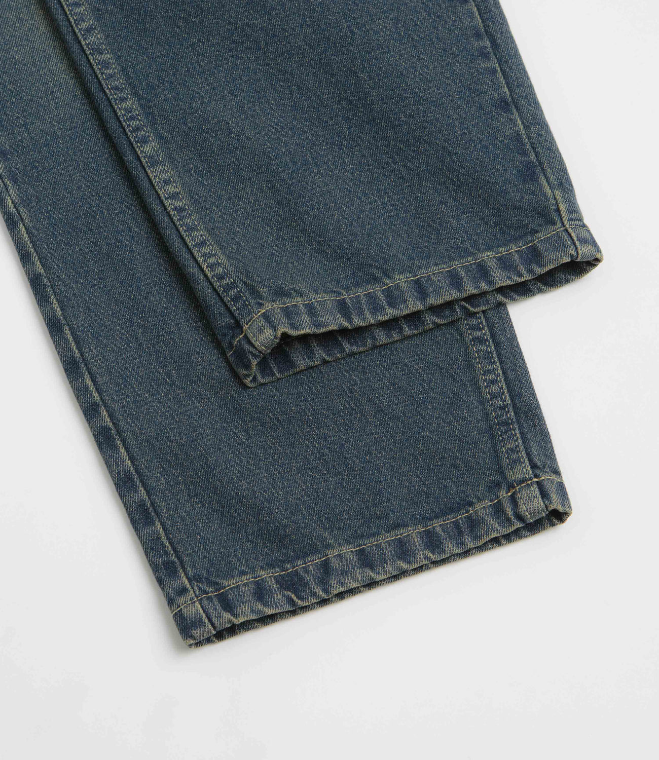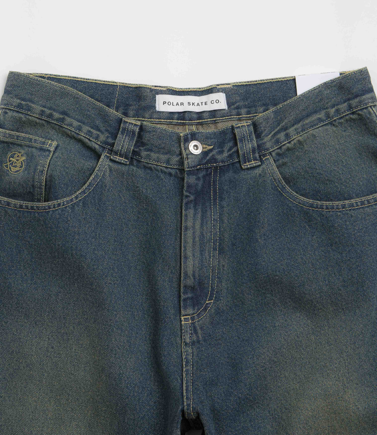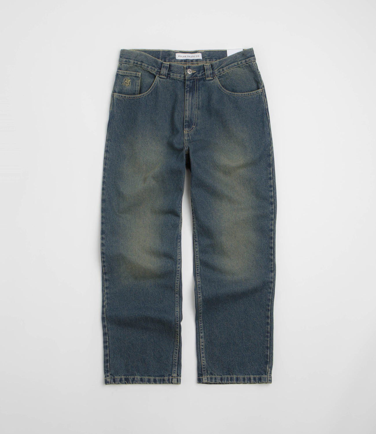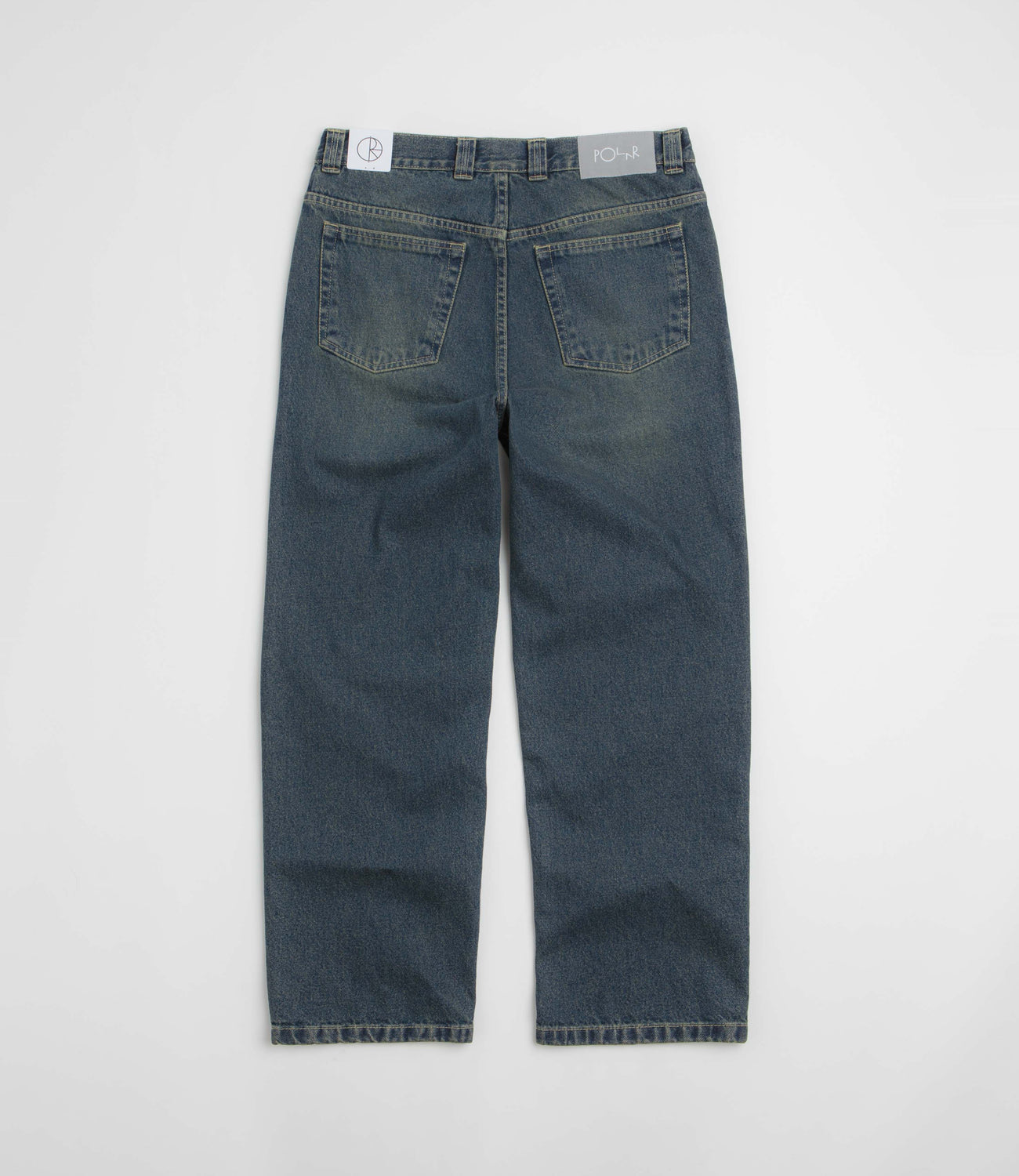 Polar 93 Jeans in Dirty Blue. Detailed with a vintage wash, these oversized Polar jeans are made from 100% cotton denim. Featuring a belt loop waist, a zippered fly, a low waist and a dropped crotch, these washed blue Polar 93 pants are finished with four pockets, an embroidered coin pocket and a woven rear belt patch.