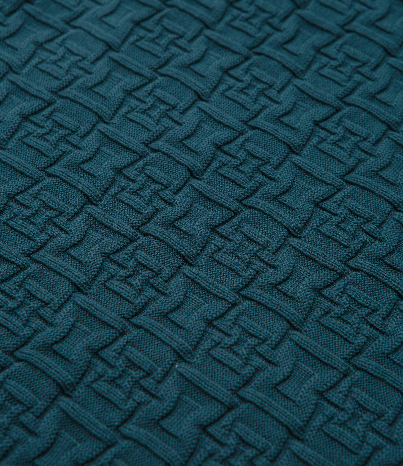 Polar Alex Sweatshirt in Petrol Blue. Designed with a structured jacquard knit, this loose fitting Polar sweatshirt is made from 100% cotton. Featuring a ribbed crew collar and dropped shoulders, this teal blue Polar sweater is finished with ribbed cuffs and a woven elastic hem.