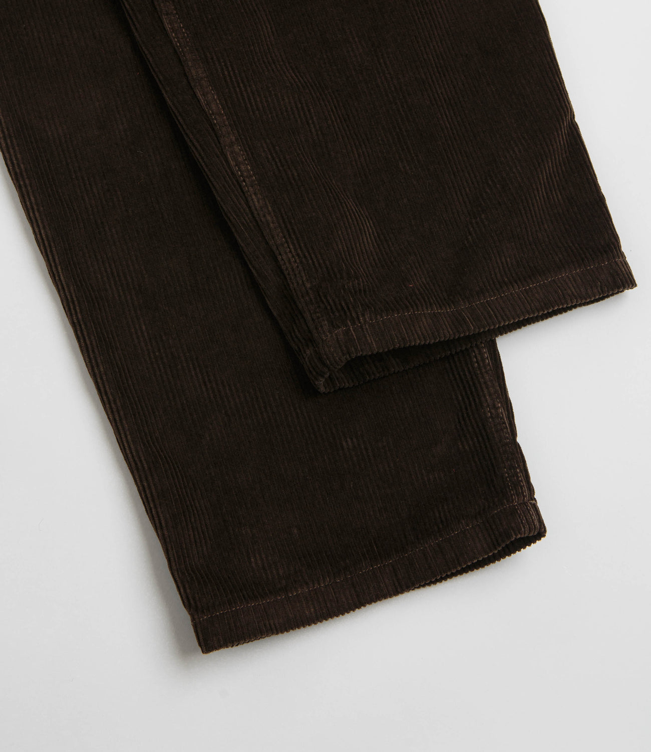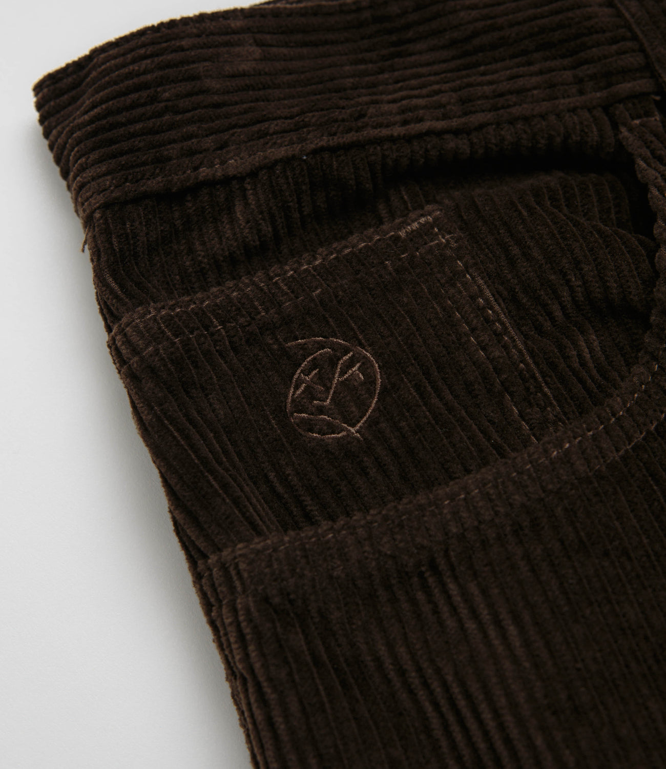 Polar Big Boy Cord Pants in Chocolate. Oversized fitting with a tapered leg and a low waist, these Polar pants are made from 100% cotton corduroy. Featuring an 8-wale construction, a belt loop waist, a single button secured zipper fly and contrast stitched seams, these brown Polar pants are finished with four classic pockets, an embroidered coin pocket and a woven Big Boy rear belt patch.