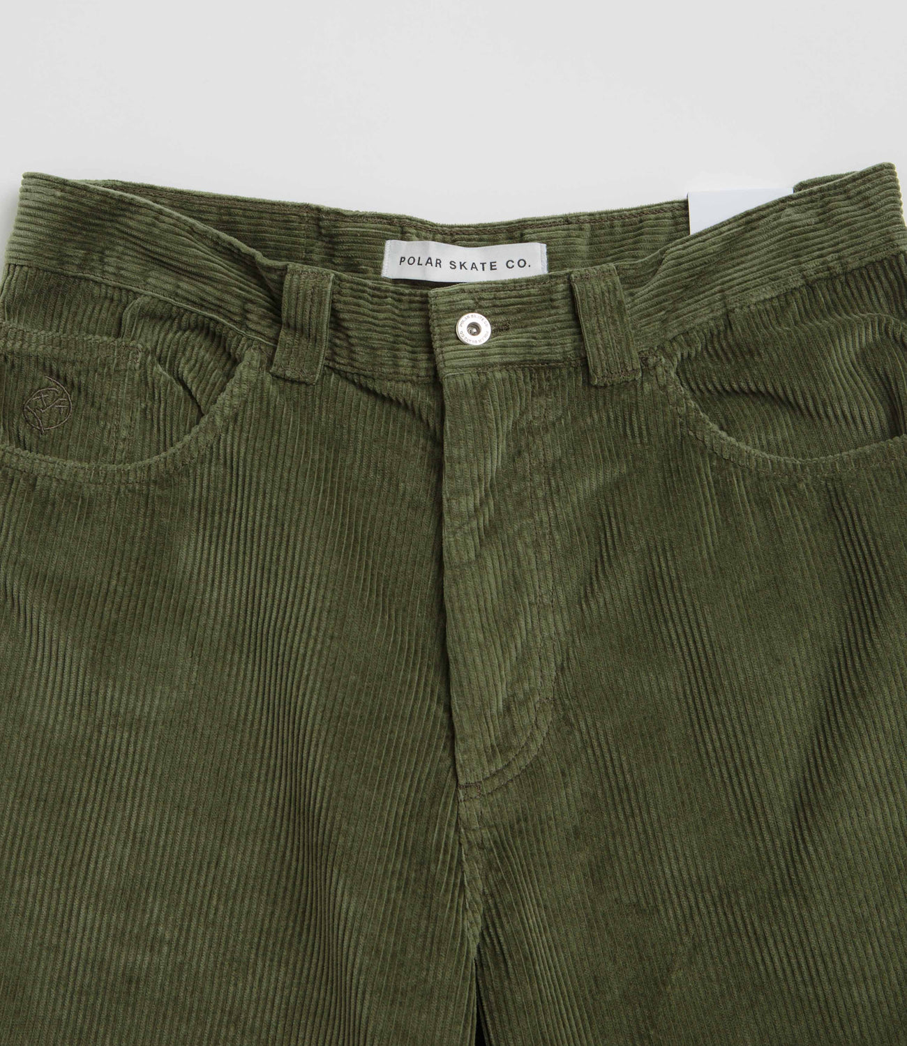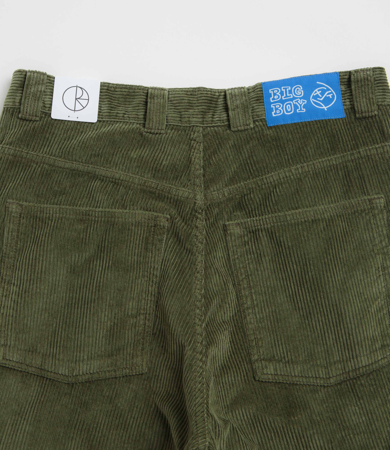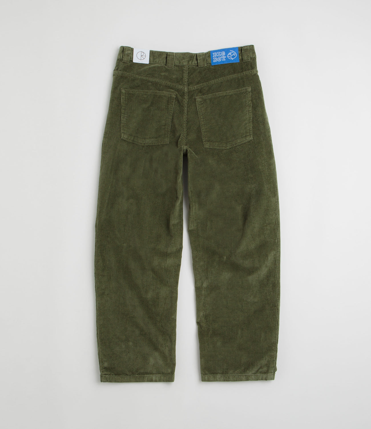 Polar Big Boy Cord Pants in Uniform Green. Made from 100% cotton corduroy with an 8-wale construction, these tapered leg Polar pants are oversized fitting with a low waist and a dropped crotch. Featuring a belt loop waist, a single button secured zipper fly and four classic pockets, these green Polar pants are finished with an embroidered coin pocket and a woven Big Boy rear belt patch.