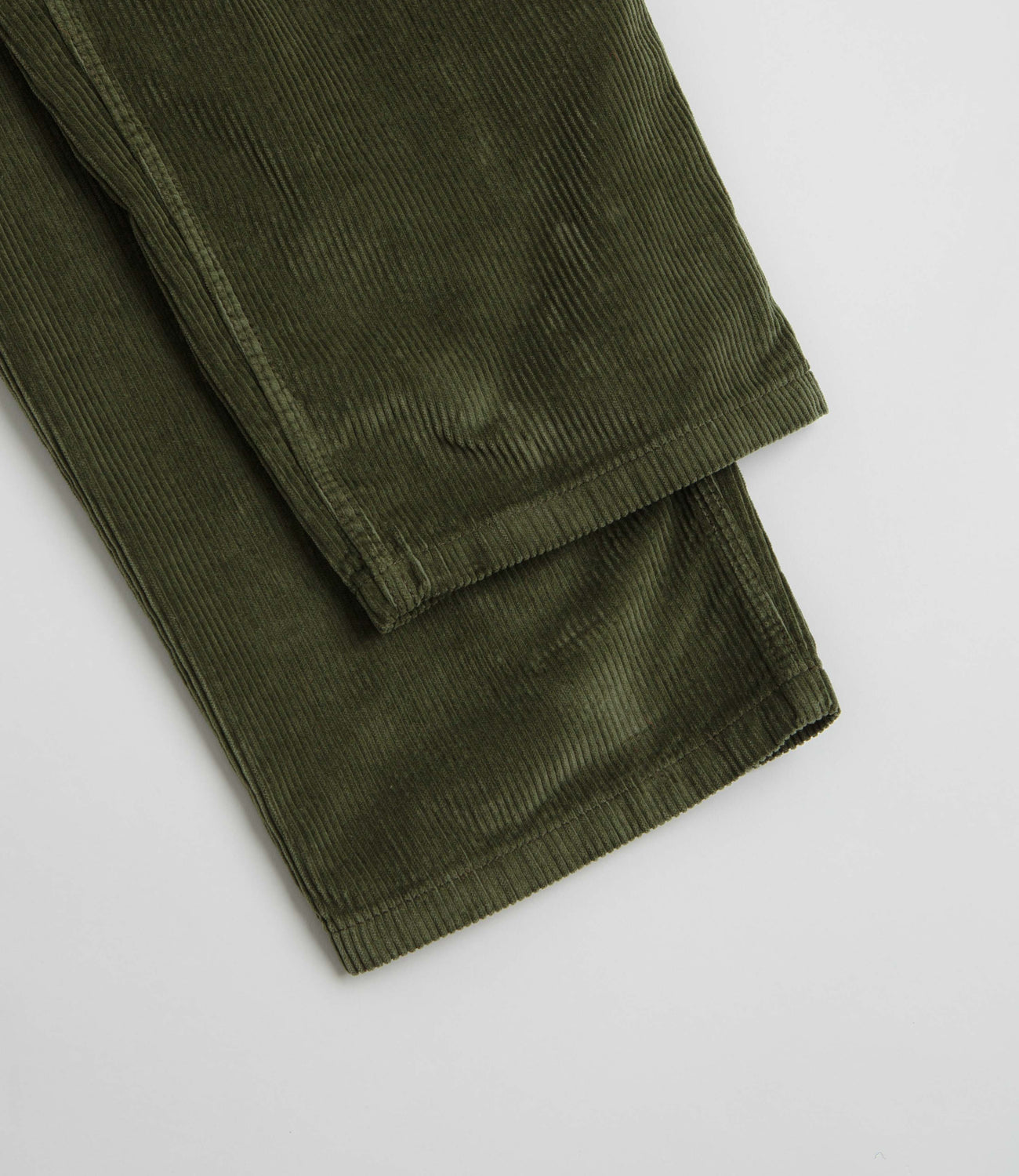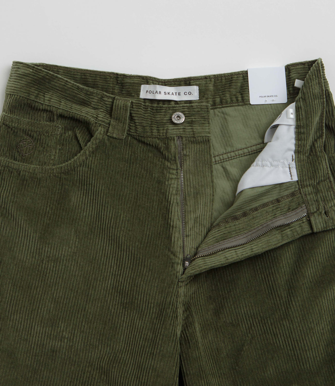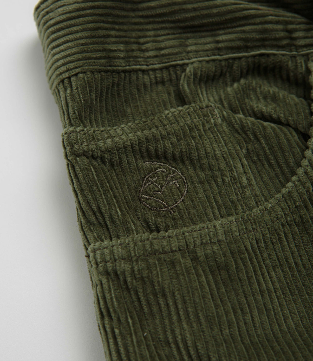 Polar Big Boy Cord Pants in Uniform Green. Made from 100% cotton corduroy with an 8-wale construction, these tapered leg Polar pants are oversized fitting with a low waist and a dropped crotch. Featuring a belt loop waist, a single button secured zipper fly and four classic pockets, these green Polar pants are finished with an embroidered coin pocket and a woven Big Boy rear belt patch.