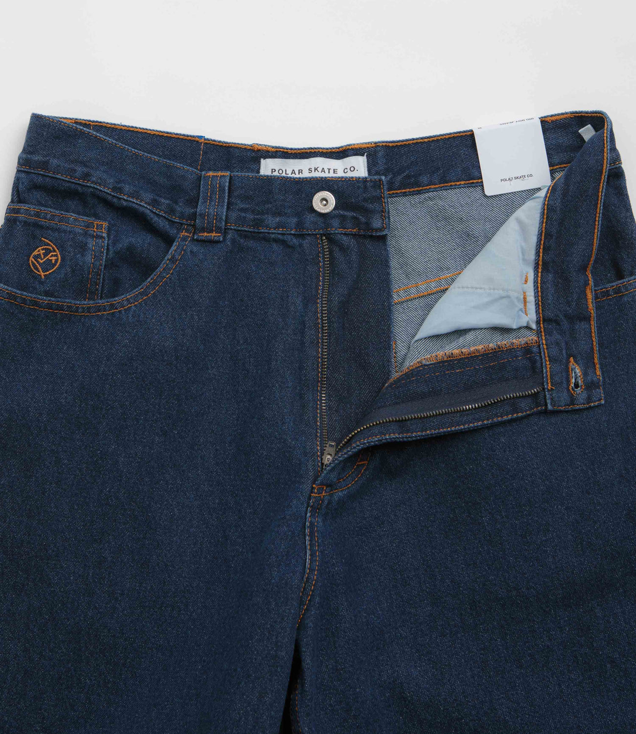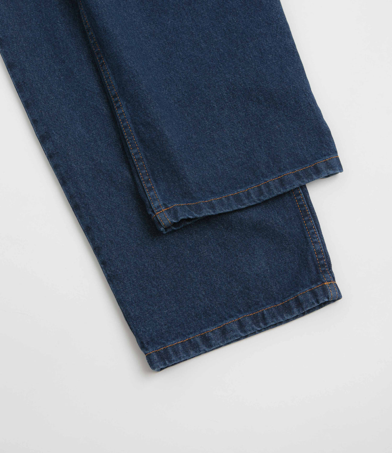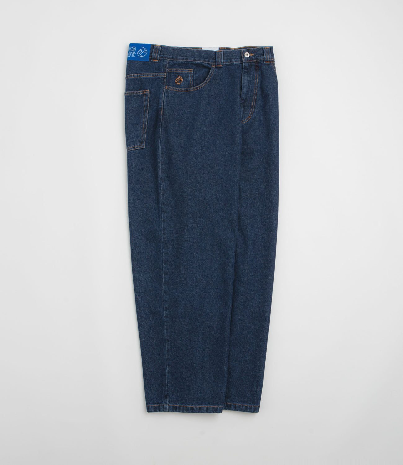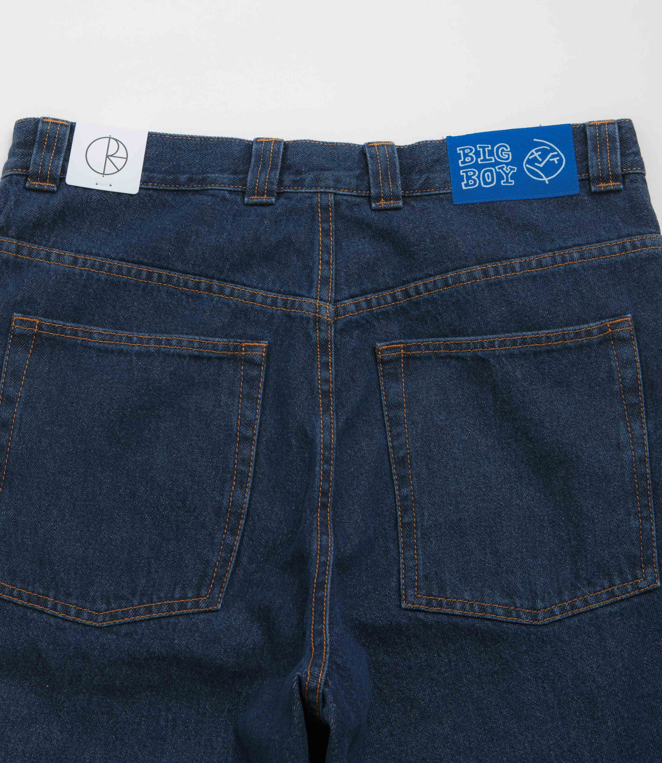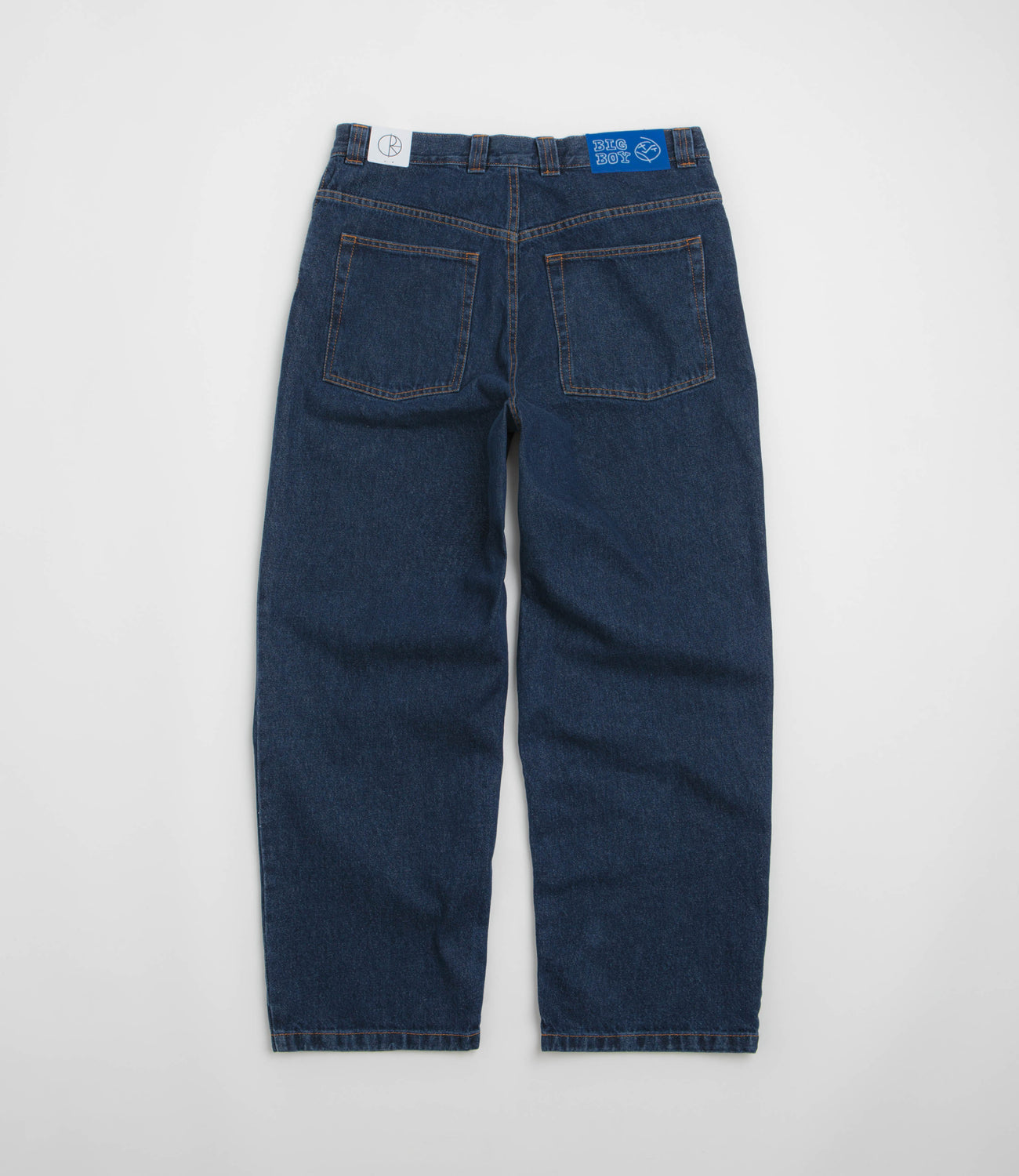 Polar Big Boy Jeans in Dark Blue. Styled with contrast stitching and a tapered cut, these Polar jeans are made from 100% cotton and are tailored to an oversized fitting. Featuring a classic belt loop waistband with a single button secured YKK zipper fly, these dark blue Polar jeans are finished with two front pockets, two rear pockets, an embroidered coin stash and a woven Big Boy belt patch sewn across the rear.