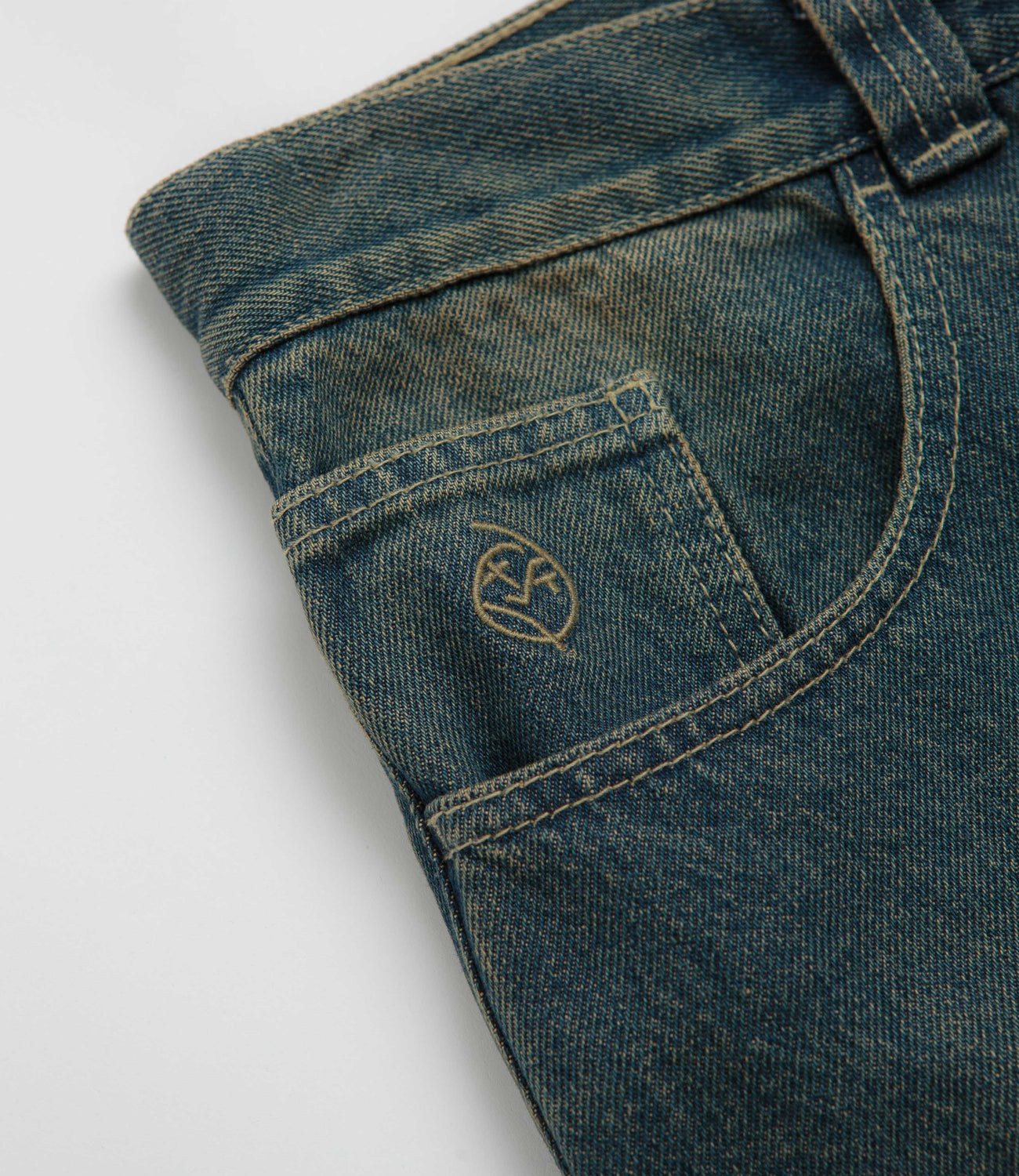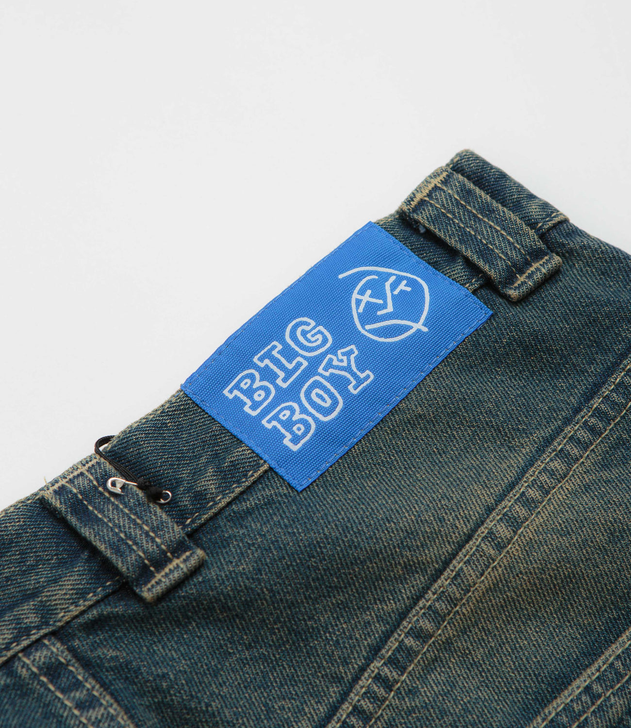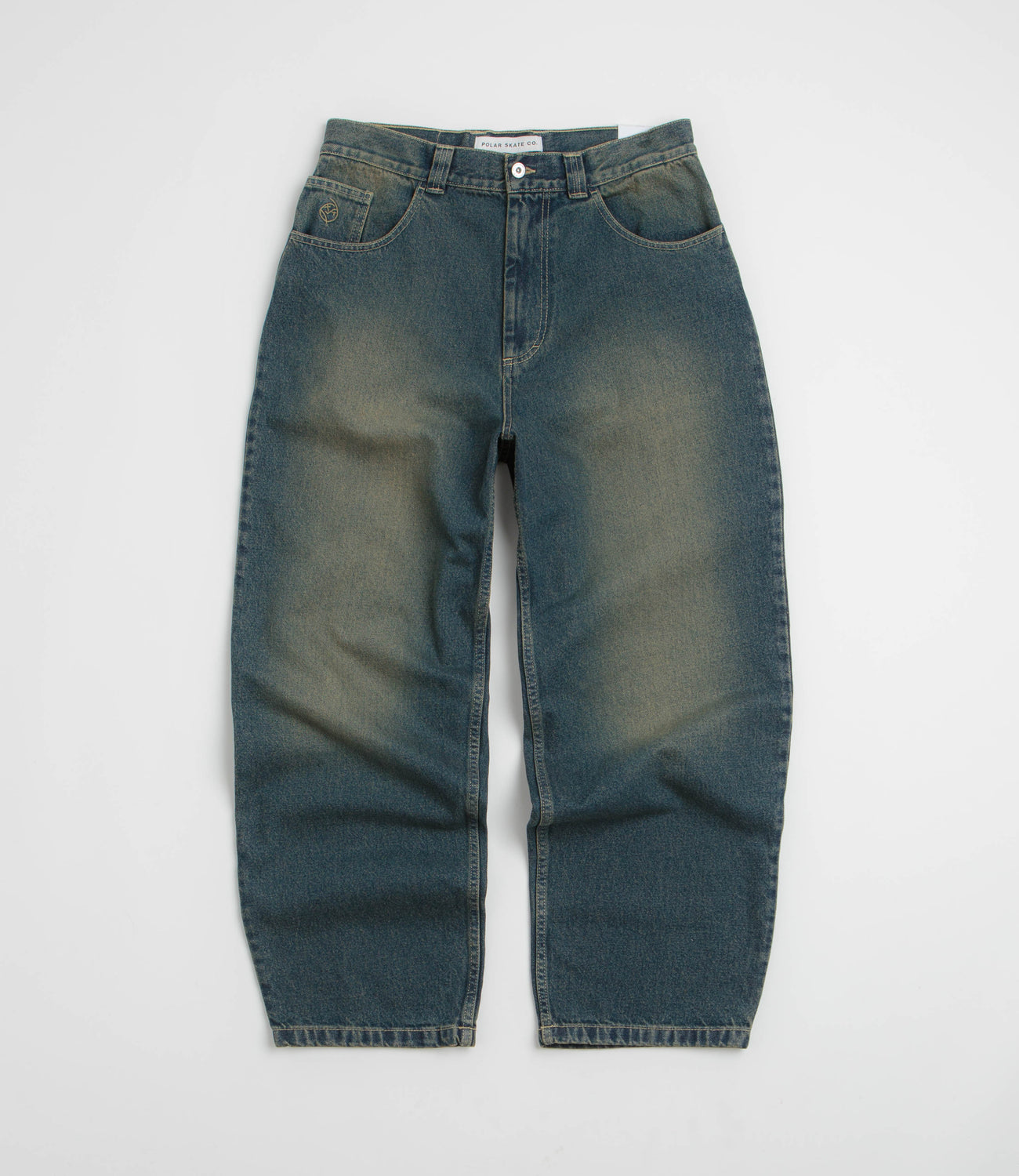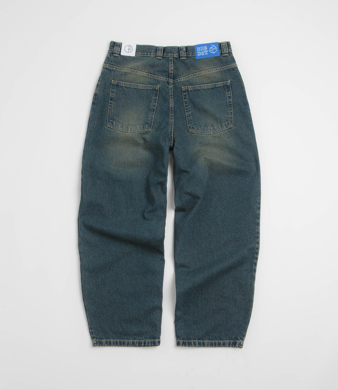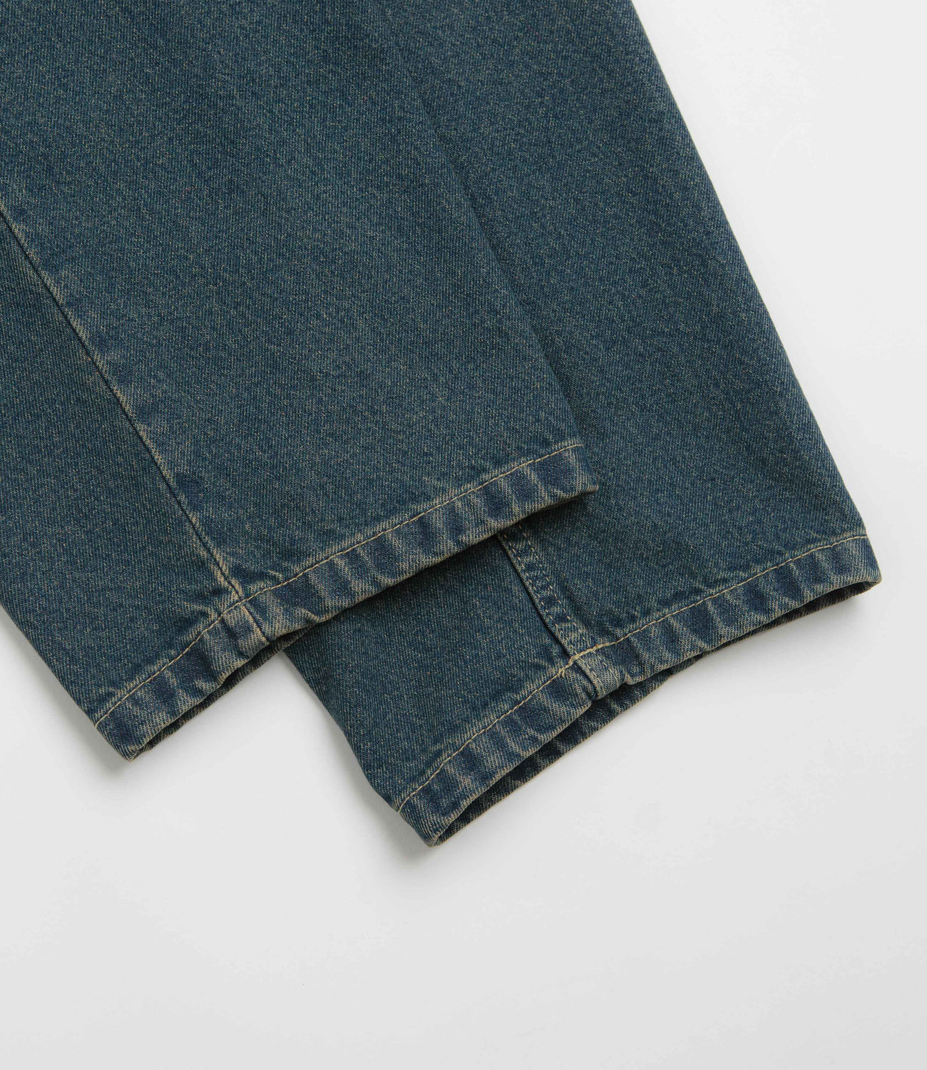 Polar Big Boy Jeans in Dirty Blue. Baggy fitting with a tapered leg, these Polar jeans are made from 100% cotton. Featuring a belt loop waistband, a zippered fly and four classic pockets, these blue Polar Big Boy jeans are finished with an embroidered coin pocket and with a woven rear belt patch.