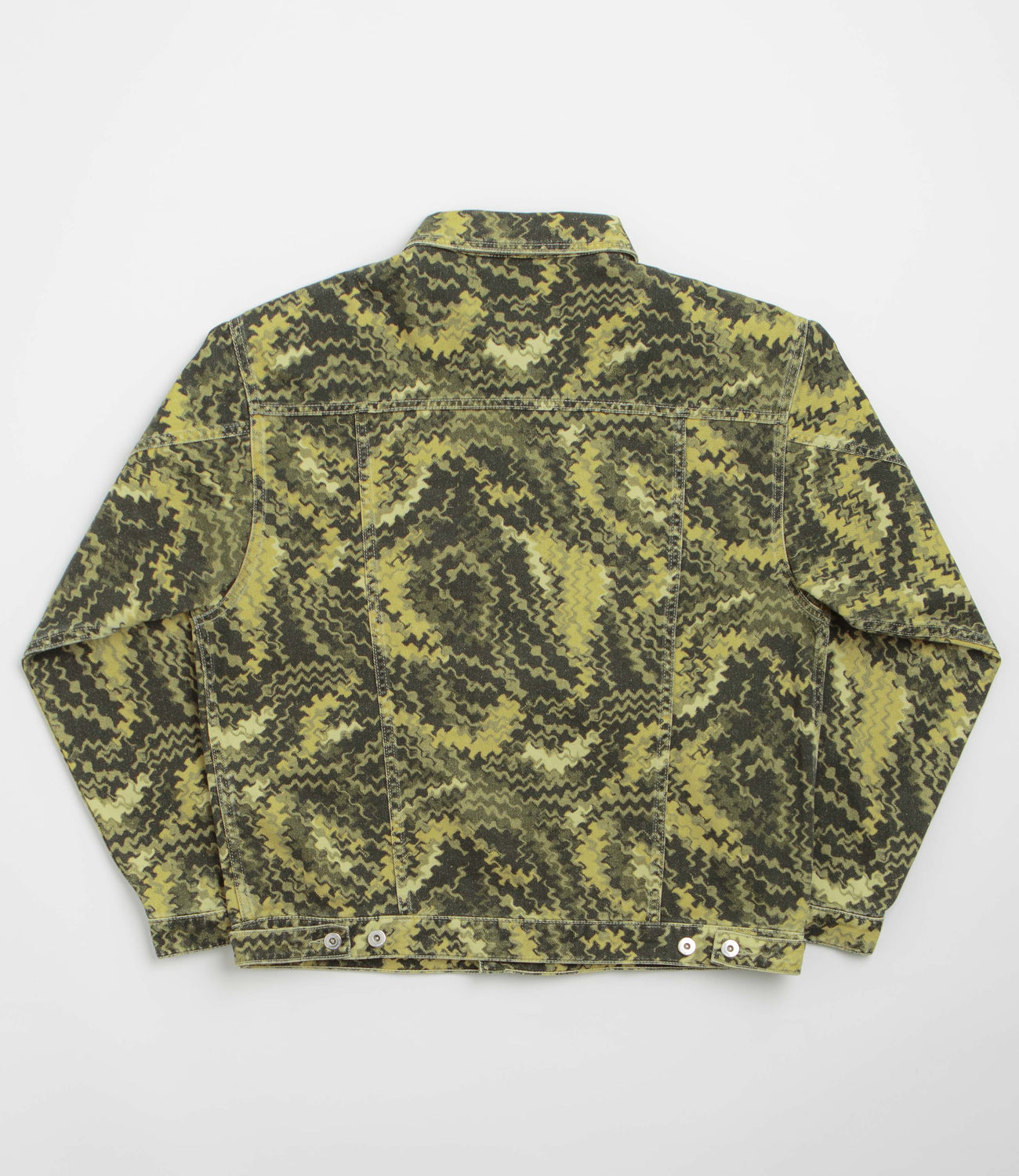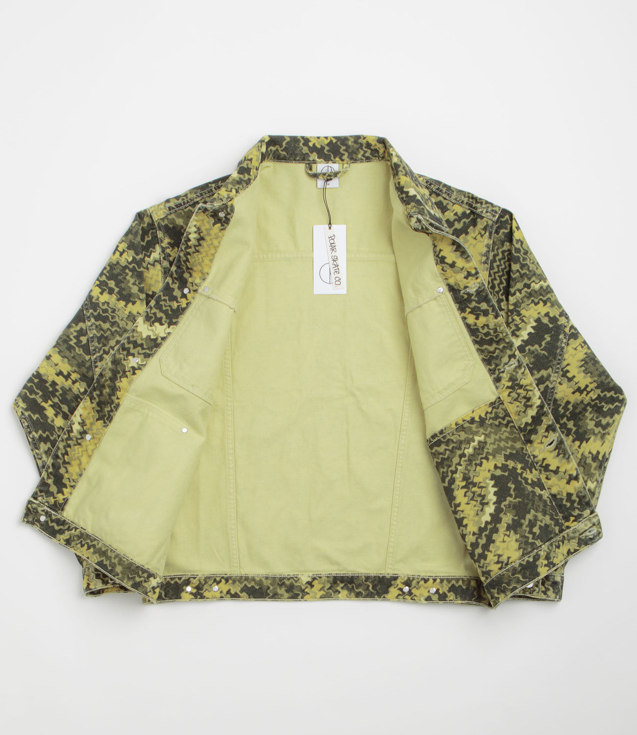 Polar Camo Patrik Jacket in Green. Designed with an all-over pattern, this garment washed Polar jacket is made from 100% cotton twill. Featuring dropped shoulders, a full length button fastening, adjustable cuffs and an adjustable hem, this green Polar jacket is finished with two chest pockets, two waist pockets, a wide cut and with an oversized fit.