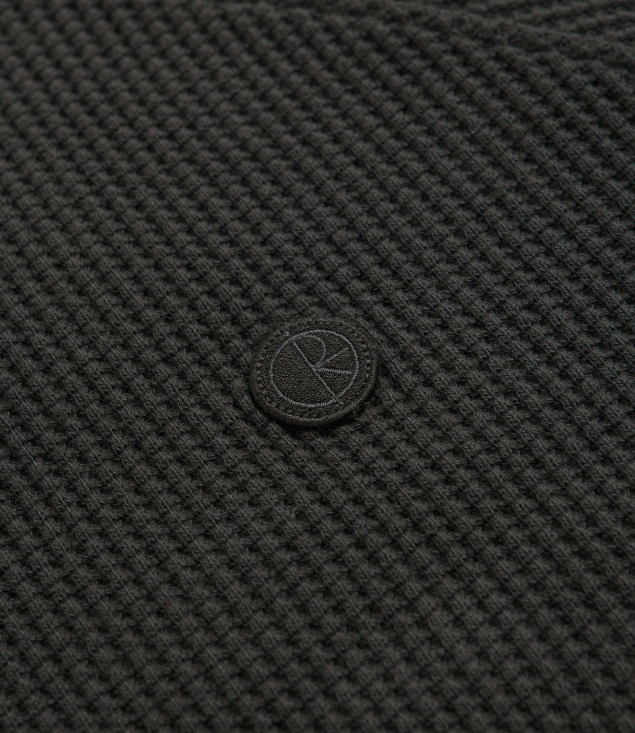 Polar Dan Long Sleeve T-Shirt in Dirty Black. Regular fitting and made from 100% cotton, this waffle jersey Polar t-shirt is designed with a rib knit collar and raglan sleeves. Finished in a shade of washed black with ribbed cuffs and an embroidered left chest patch logo.