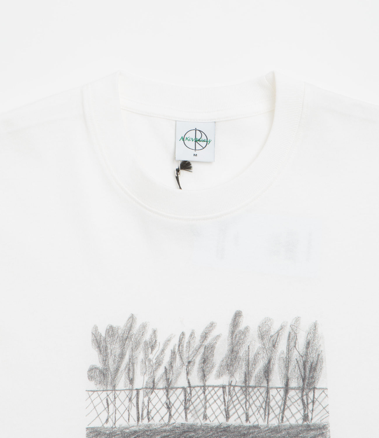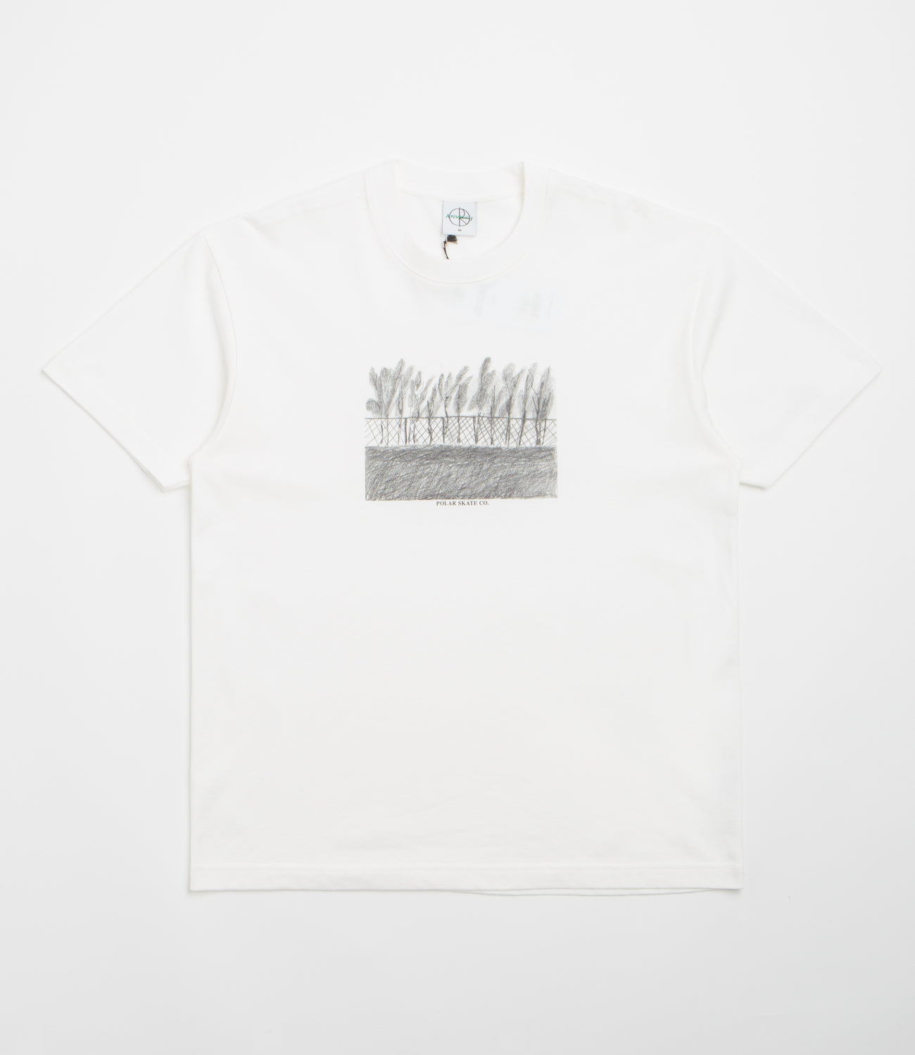 Polar Fence T-Shirt in Cloud White. Regular fitting, this block tone Polar t-shirt is made from 100% cotton with a garment wash. Featuring a rib knit collar and slightly dropped shoulders, this white Polar t-shirt is finished with screen printed artwork by Andrey Kovalevsky.