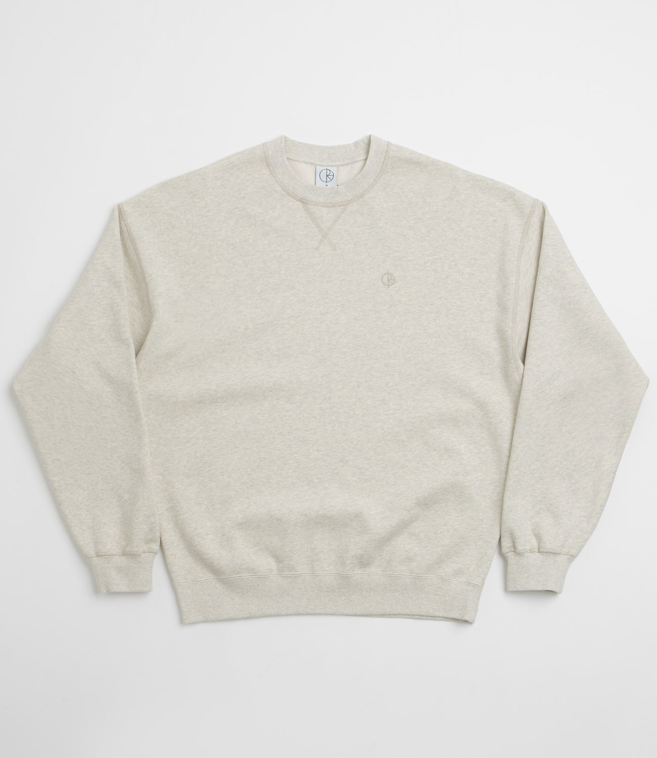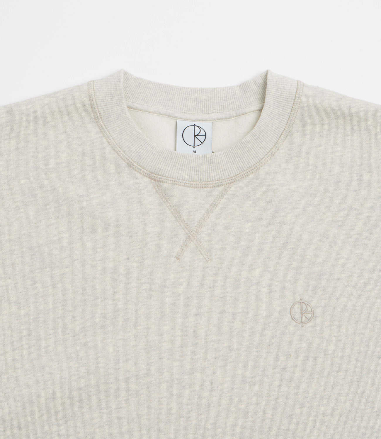 Polar Frankie Crewneck Sweatshirt in Ivory Grey Melange. Wide fitting with a brushed inner, this Polar sweatshirt is made from 100% stone washed cotton. Featuring a V-insert crew collar and ribbed cuffs, this beige grey Polar sweater is finished with a woven elastic hem, bat-sleeves, dropped shoulders and embroidered branding.