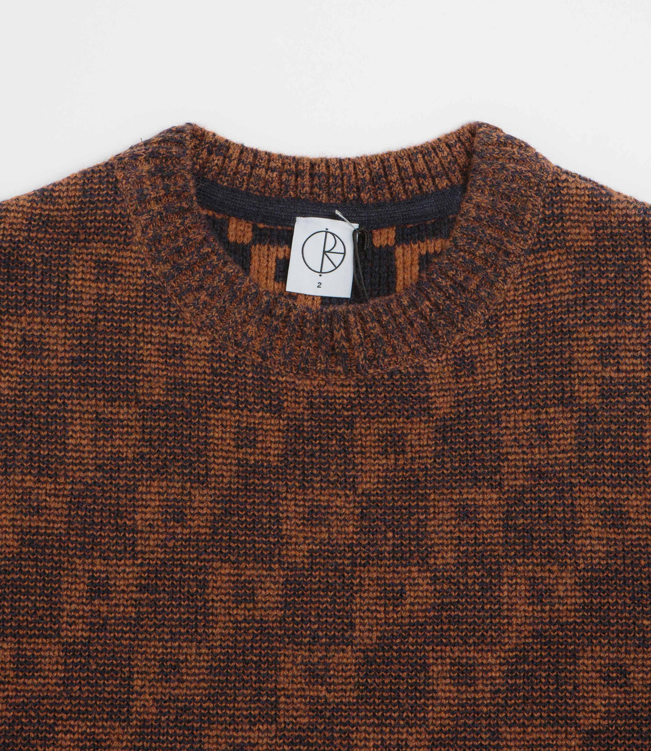 Polar P Pattern George Sweatshirt in Navy and Orange. Wide fitting and made from an acrylic-polyamide blend, this Polar sweatshirt is designed with an all-over reverse jacquard knit. Finished in navy orange with a rib knit collar, dropped shoulders and ribbed cuffs.