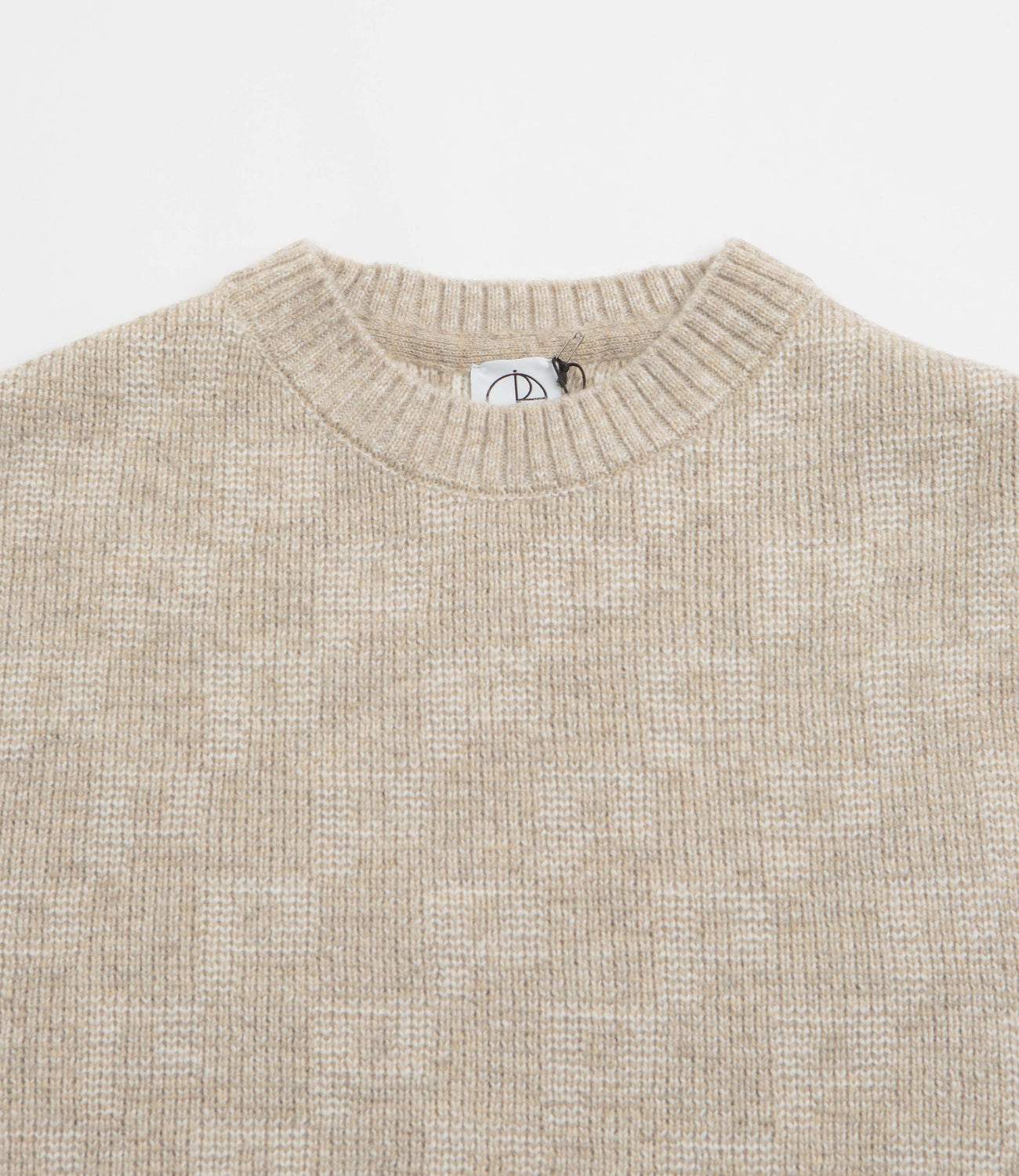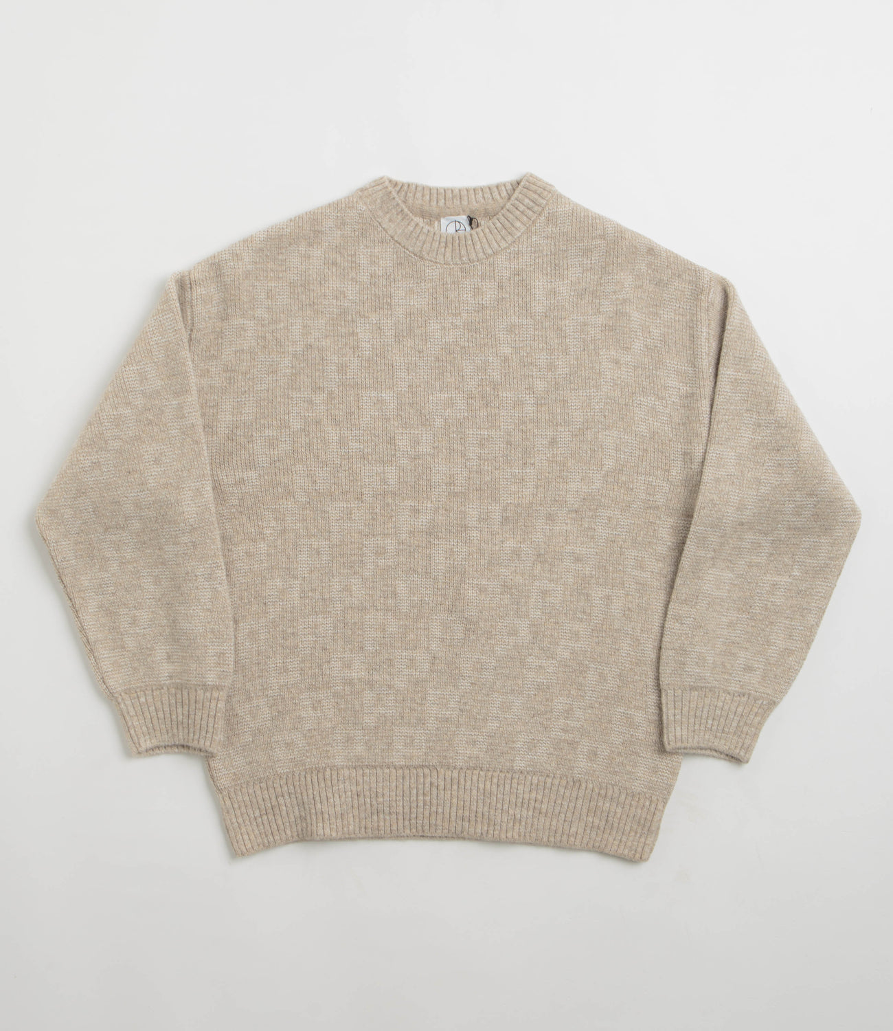 Polar P Pattern George Sweatshirt in Sand. Made from an acrylic-polyamide blend with a reverse jacquard knit pattern, this wide fitting Polar sweatshirt is designed with a classic rib knit collar. Finished in khaki beige with dropped shoulders and rib knit cuffs.