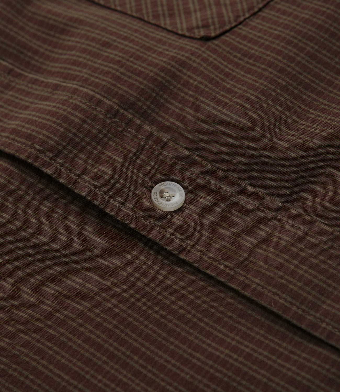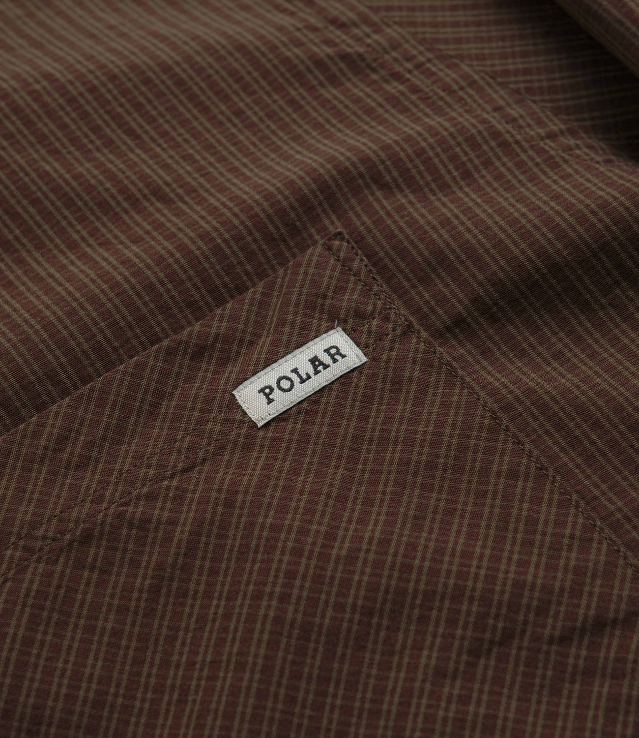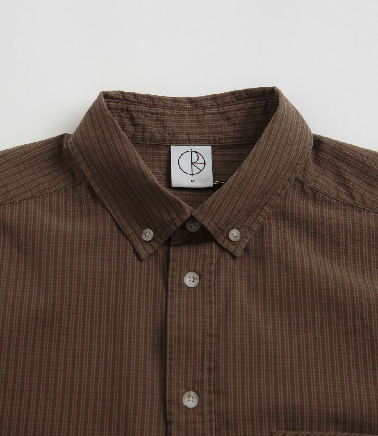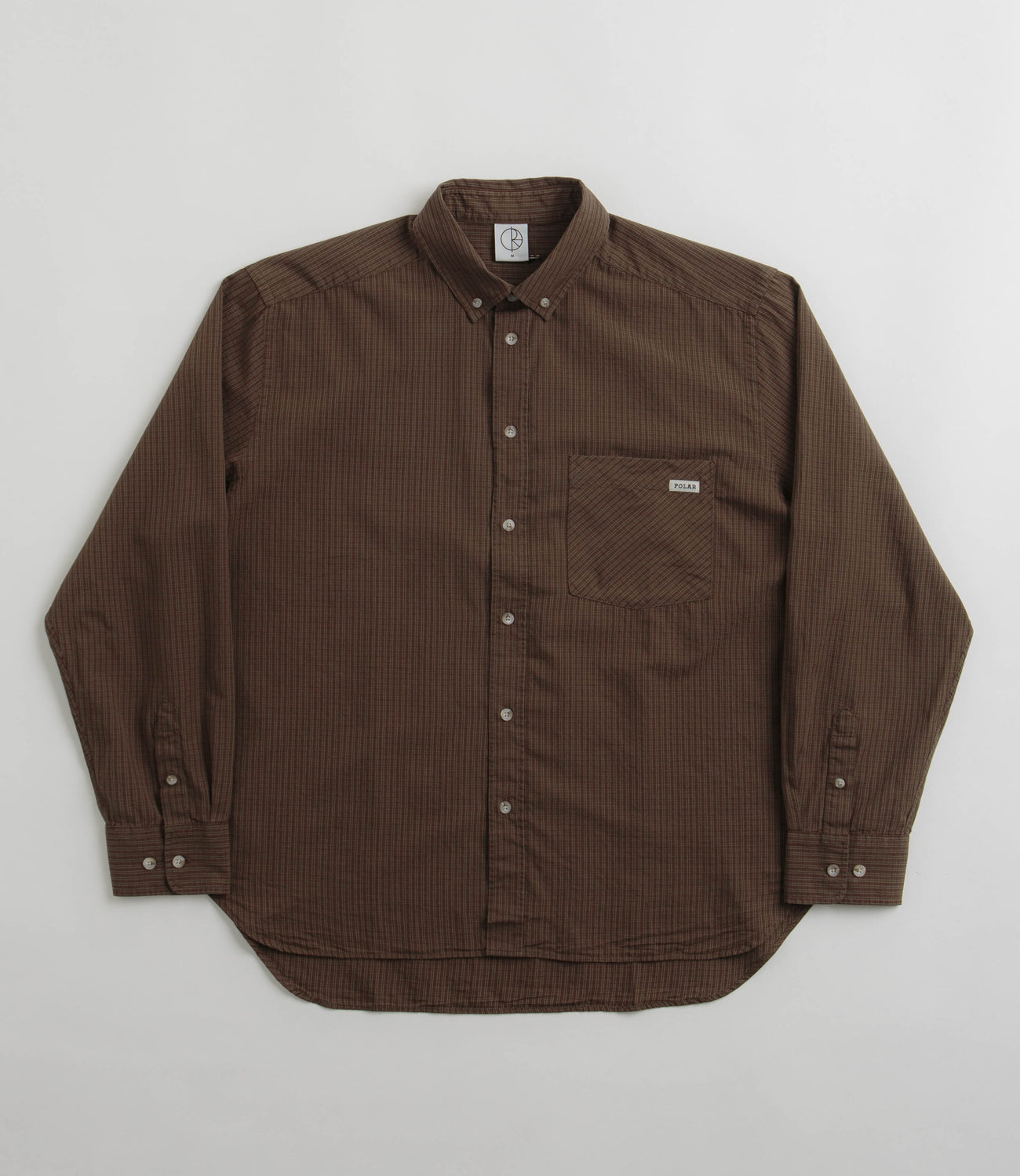 Polar Poplin Ben Shirt in Brown. Loose fitting and made from 100% cotton poplin, this garment washed Polar shirt is designed with faux tortoise buttons and a button-down collar. Featuring a full length fastening, adjustable cuffs and a high-low hem, this brown Polar shirt is finished with a single left chest pocket and woven flag label branding.