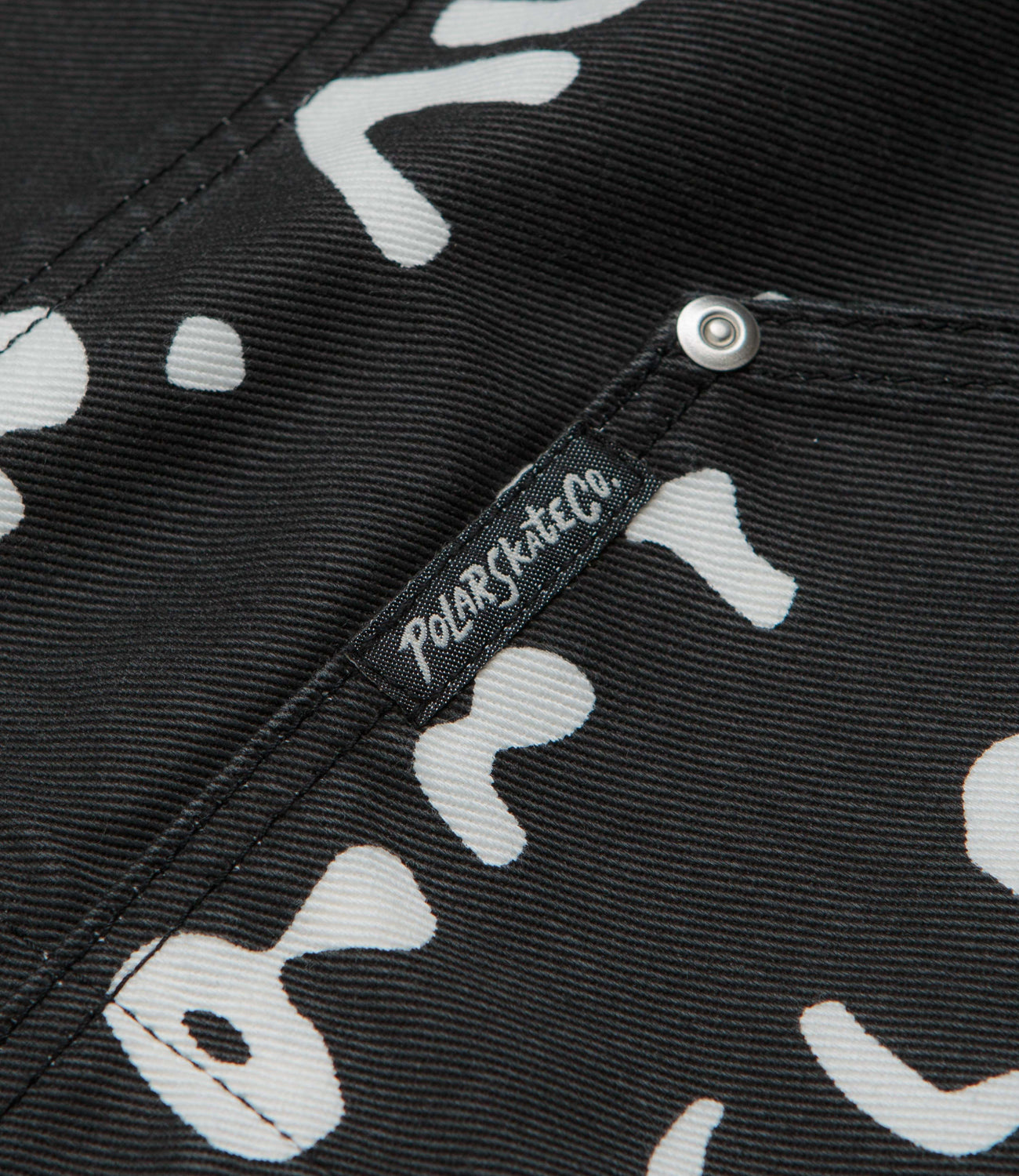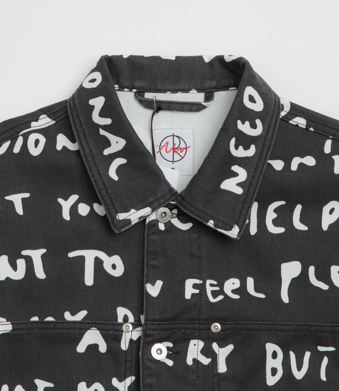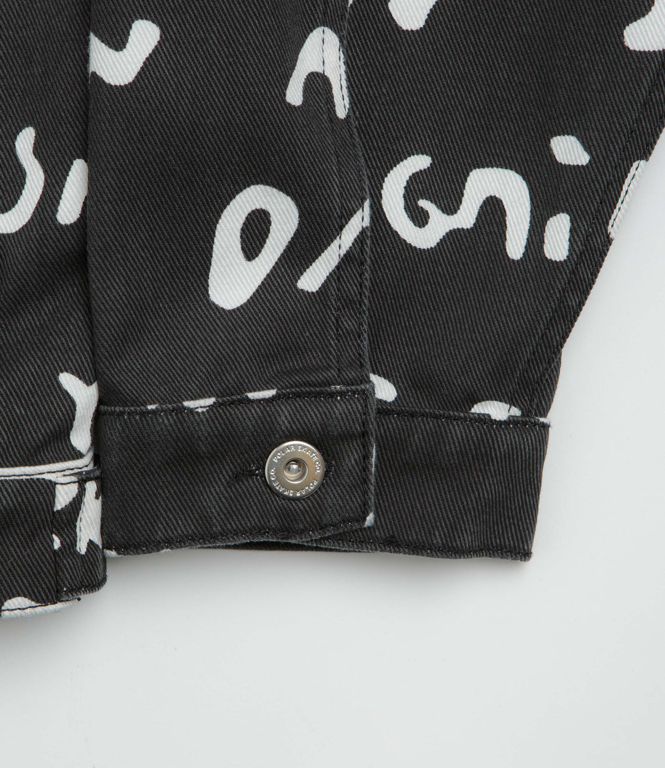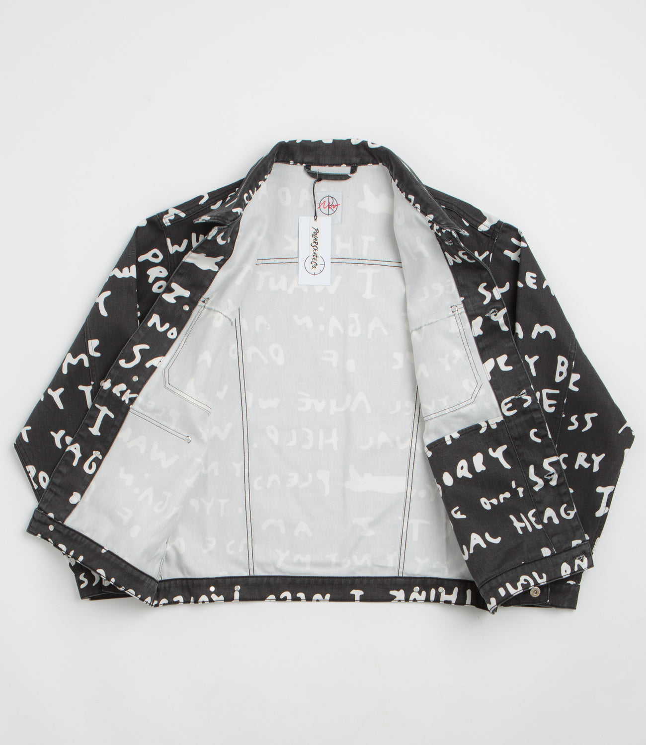 Polar Sad Notes Patrik Jacket in Black and White. Featuring an all-over design by Pontus Alv, this oversized Polar jacket is made from 100% cotton twill with a garment wash. Featuring a stand collar, a full length button fastening, dropped shoulders and rivet detailing, this black Polar jacket is finished with two chest pockets, two waist pockets and with flag label branding.