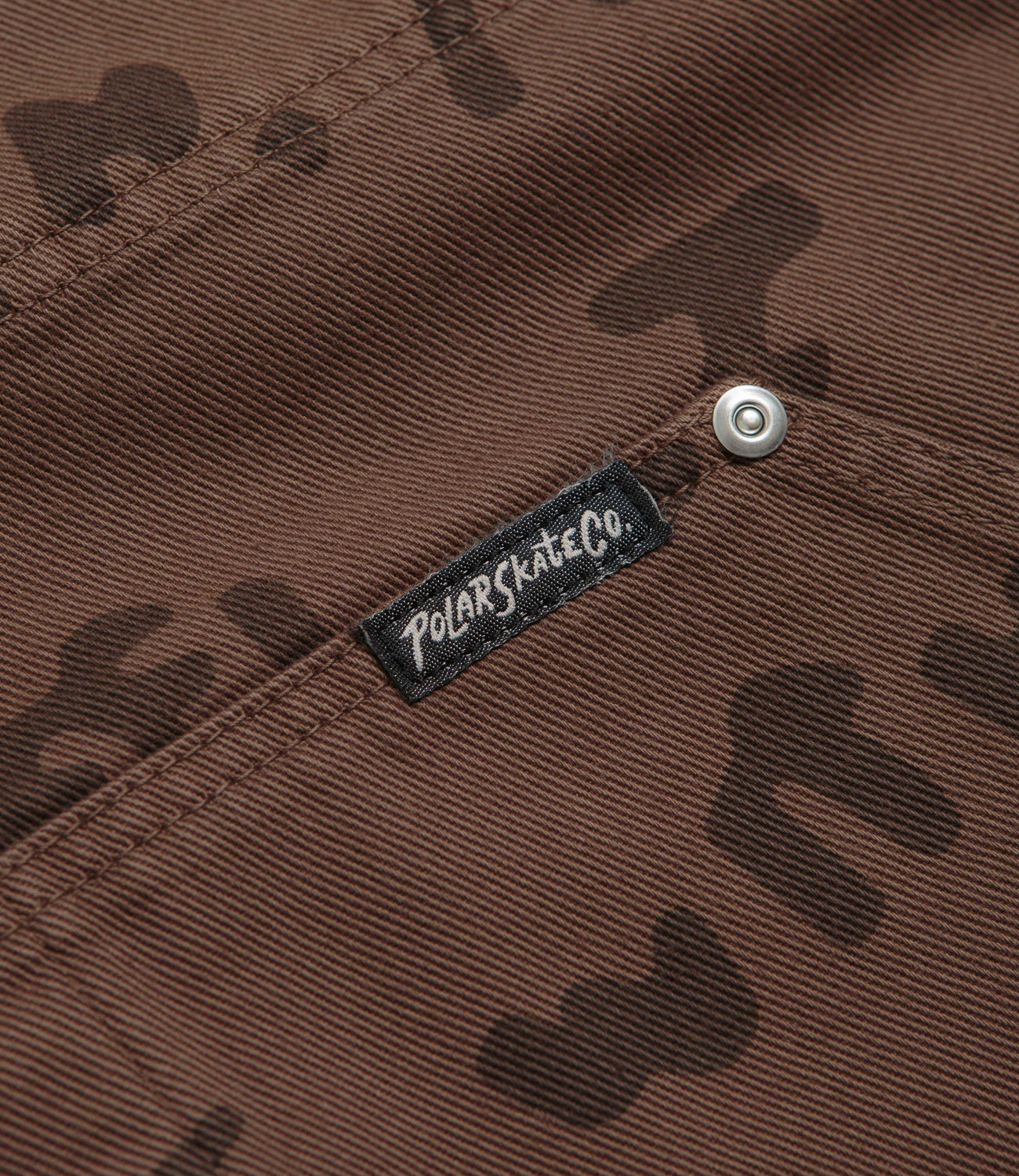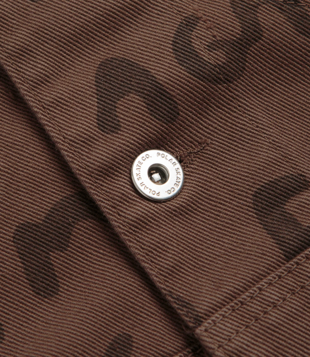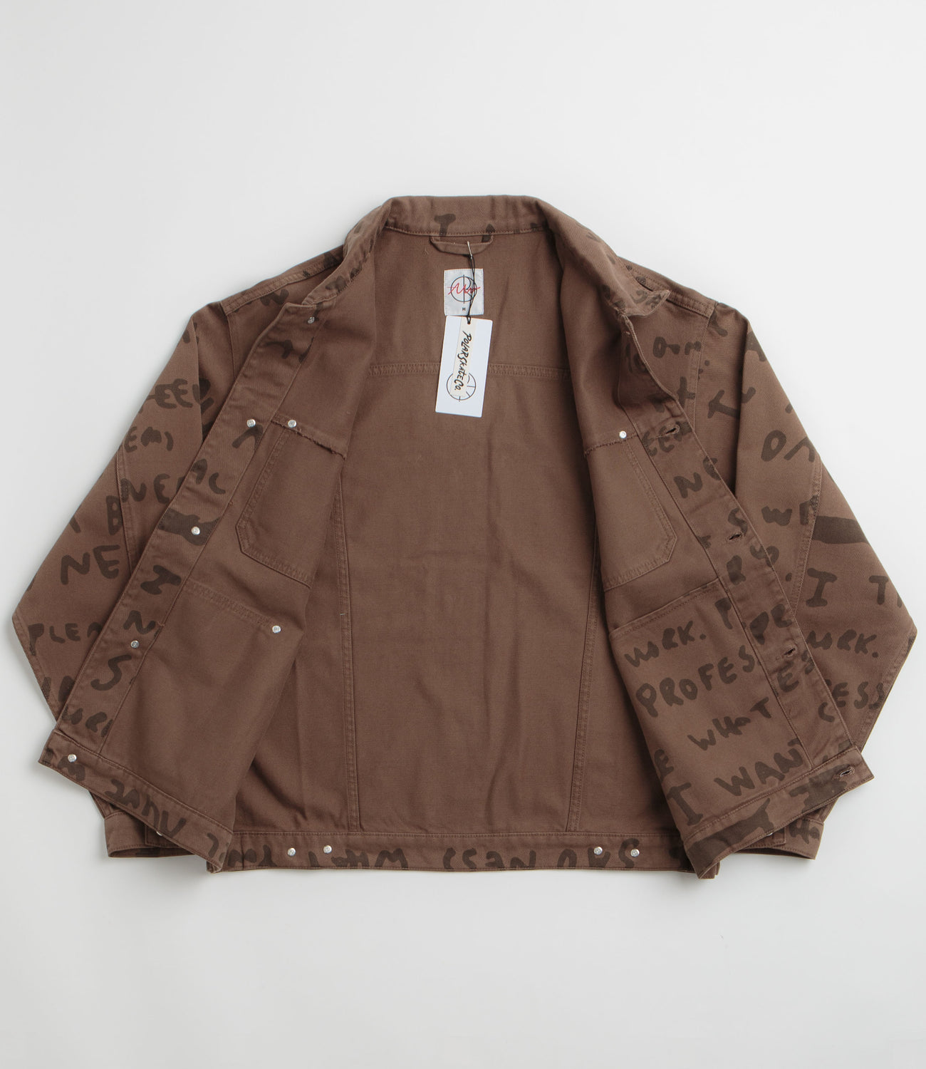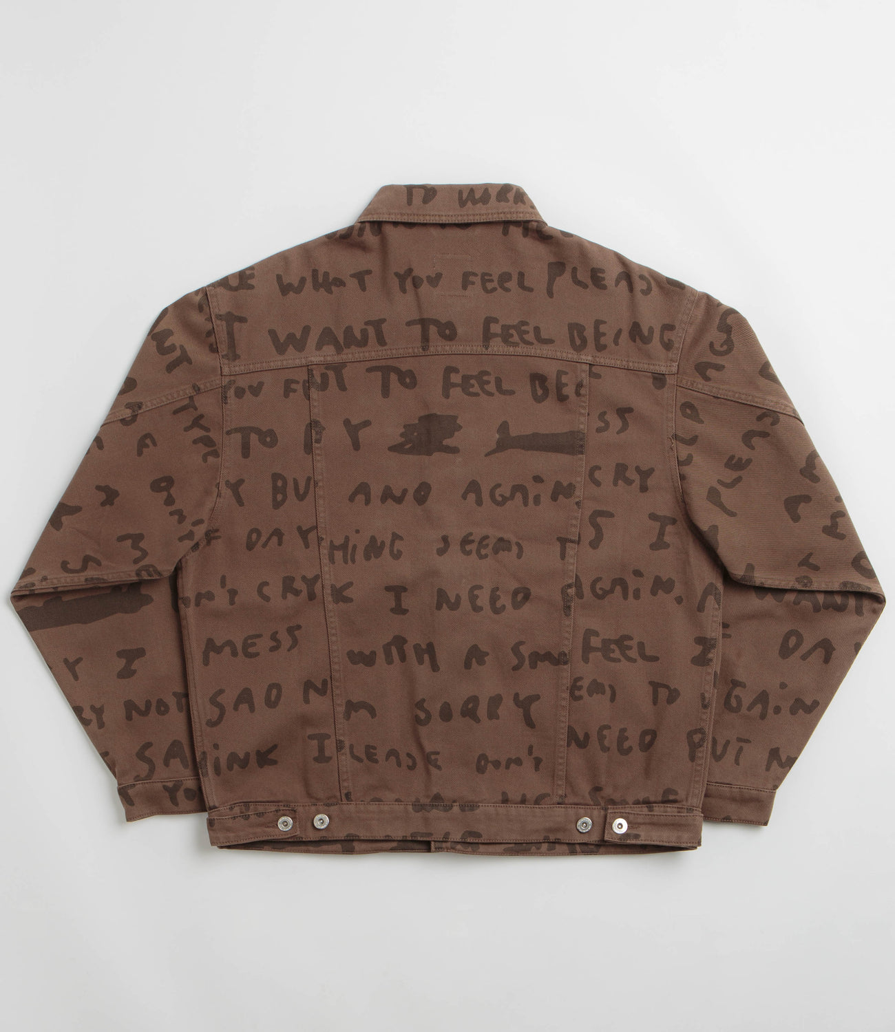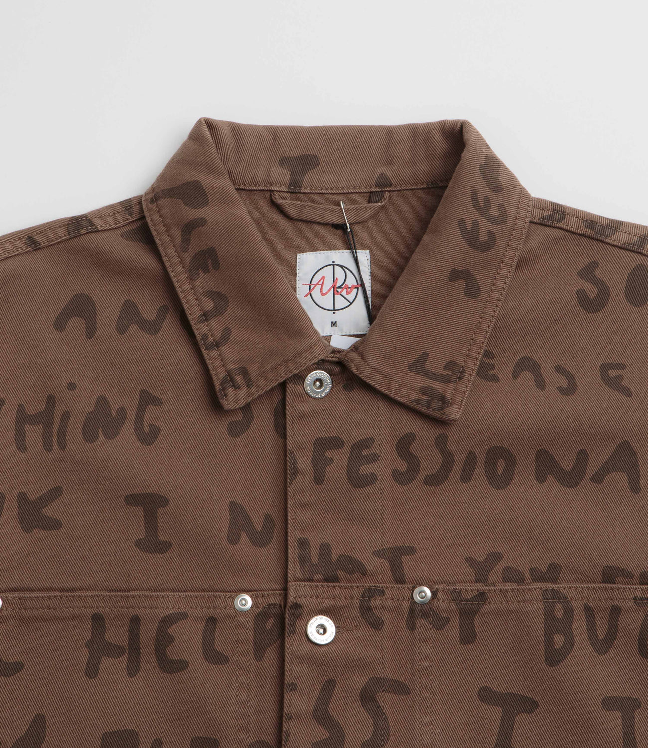 Polar Sad Notes Patrik Jacket in Walnut. Oversized with a wide cut, this Polar jacket is designed with an all-over print by Pontus Alv. Featuring a stand collar, a full length button fastening, rivet detailing and adjustable cuffs, this brown Polar jacket is finished with two waist pockets, two chest pockets and with woven flag label branding.