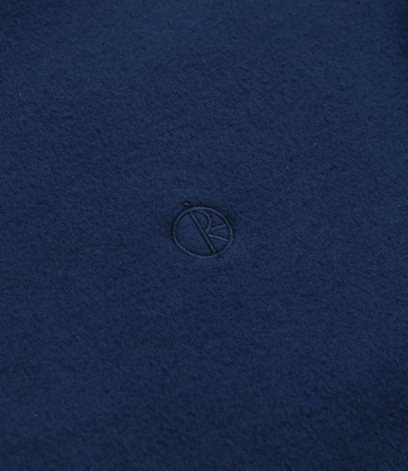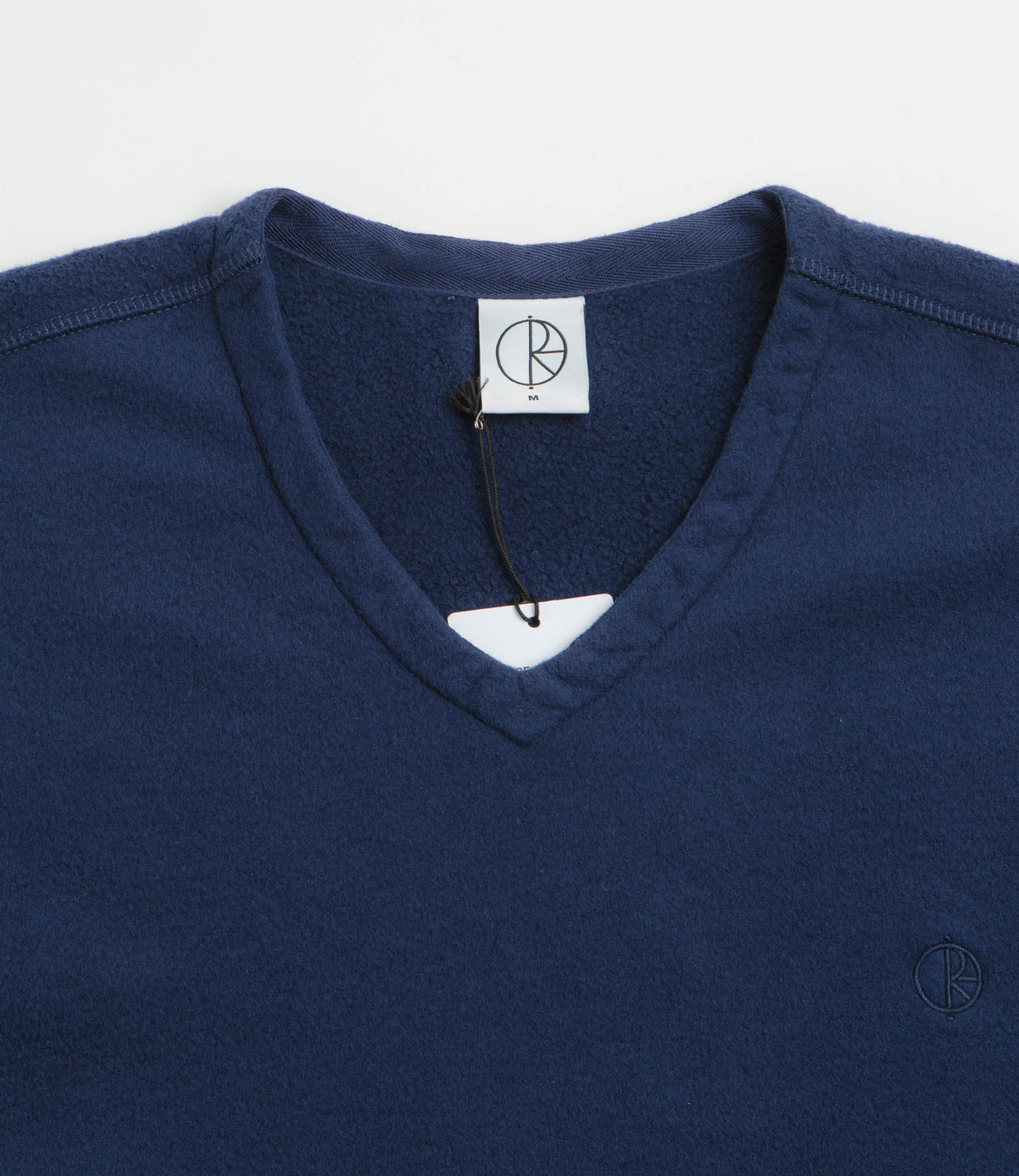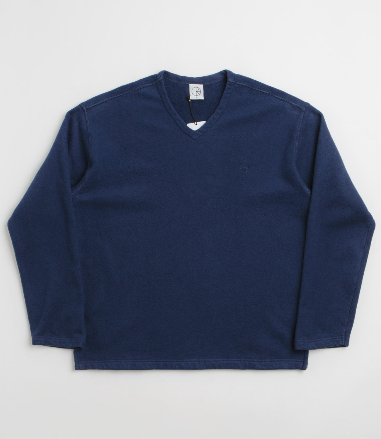 Polar Scott Sweatshirt in Dark Blue. Loose fitting, this block tone Polar sweatshirt is made from 100% cotton. Featuring a brushed jersey construction with a V-neck collar and dropped shoulders, this blue Polar sweater is finished with embroidered branding and a side-split hem.