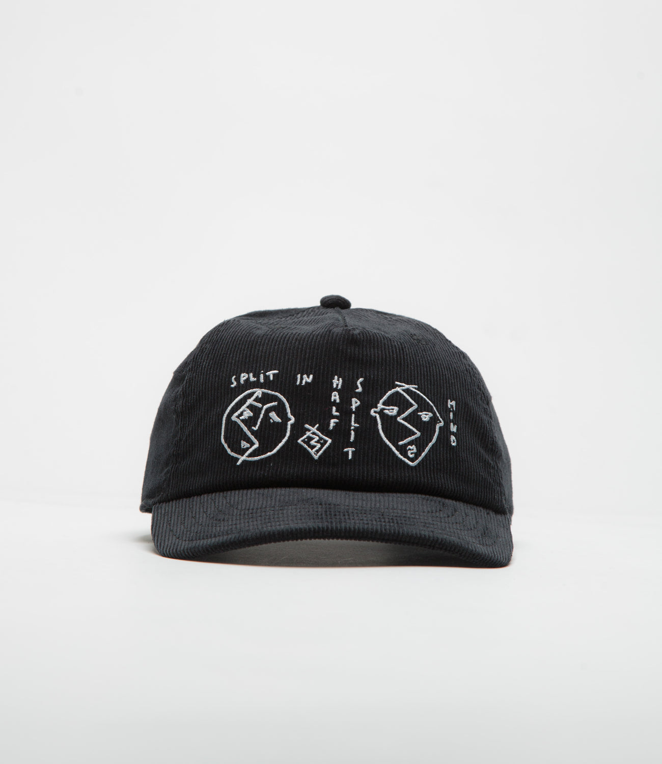 Polar Split in Half James Cap in Black. Single sized with a pre-bent squared brim, this five panel Polar cap is made from 100% cotton corduroy. Featuring embroidered eyelets, an adjustable rear fastening and a square fit, this black Polar cap is finished with embroidered artwork by Pontus Alv.