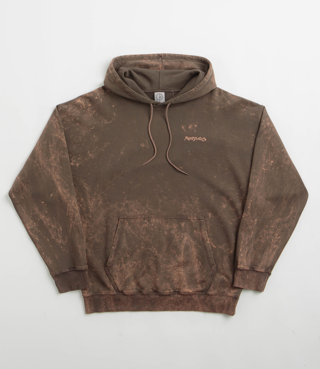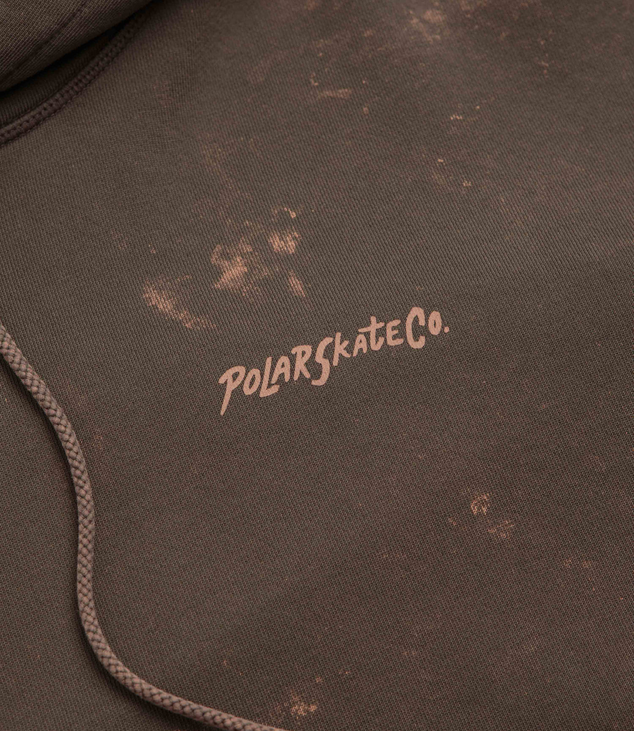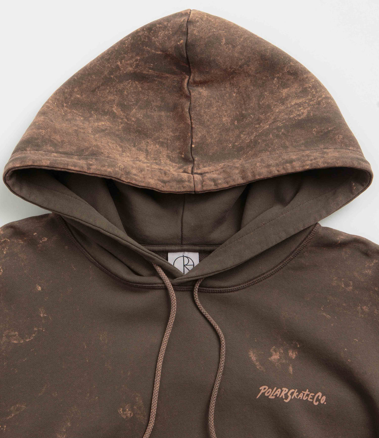 Polar Surf Logo Acid Frank Hoodie in Brown. Designed with a unique acid washed construction, this wide fitting Polar hoodie is made from 100% cotton. Unbrushed with an adjustable drawstring hood, dropped shoulders and bat-style sleeves, this bown Polar hoodie is finished with a kangaroo front pocket, ribbed cuffs and printed logos.