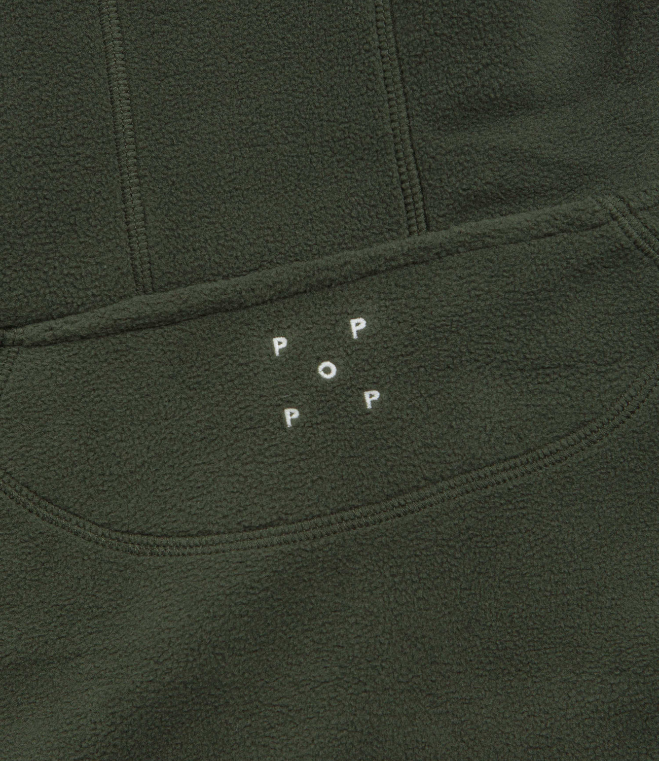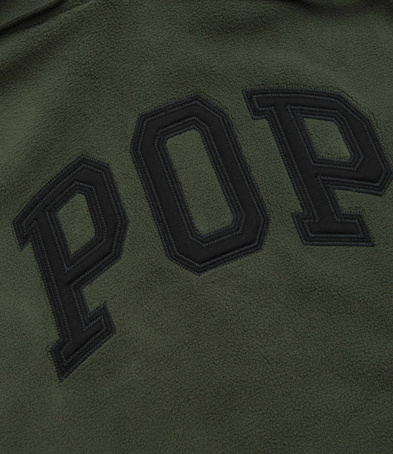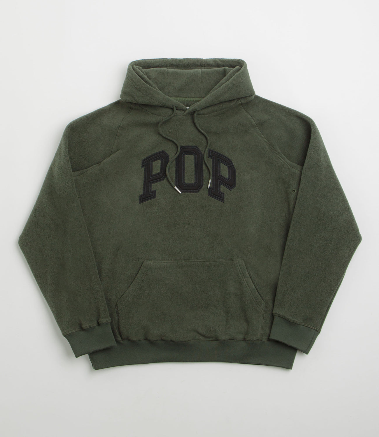Pop Trading Company Arch Hoodie in Duffel Green. Made from 100% polyester polar fleece, this Pop Trading Company hoodie is designed with a triple panel hood with raglan sleeves. Featuring applique branding, embroidered ventilation eyelets and a kangaroo front pocket, this green Pop Trading Company hoodie is finished with ribbed cuffs, embroidered logos and a woven elastic hem.