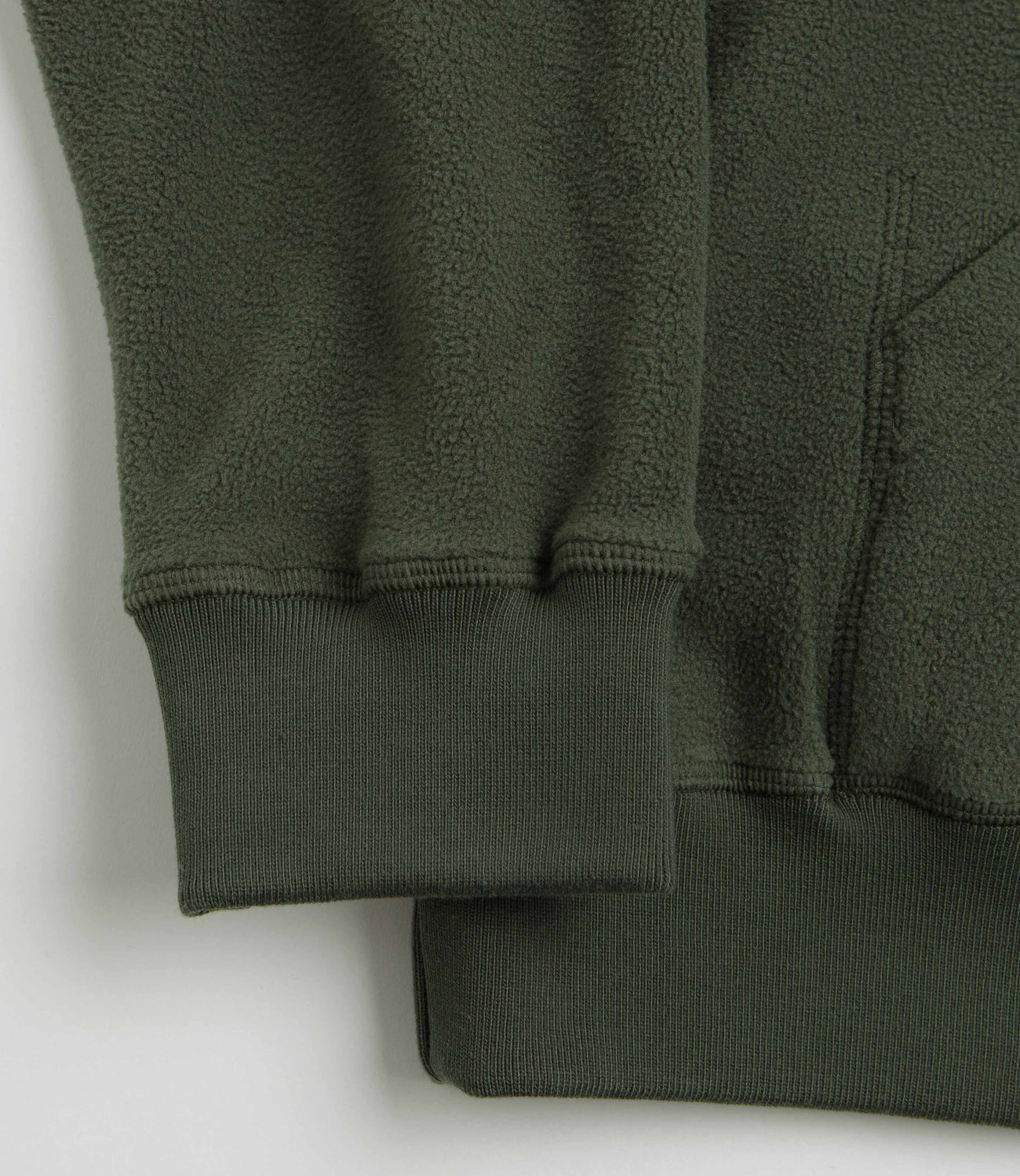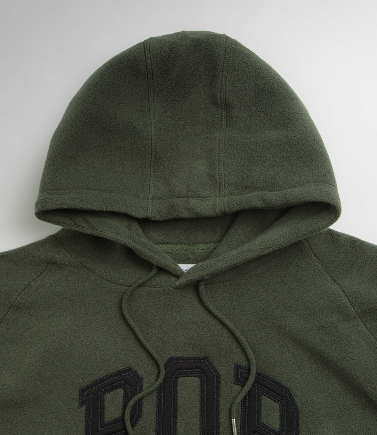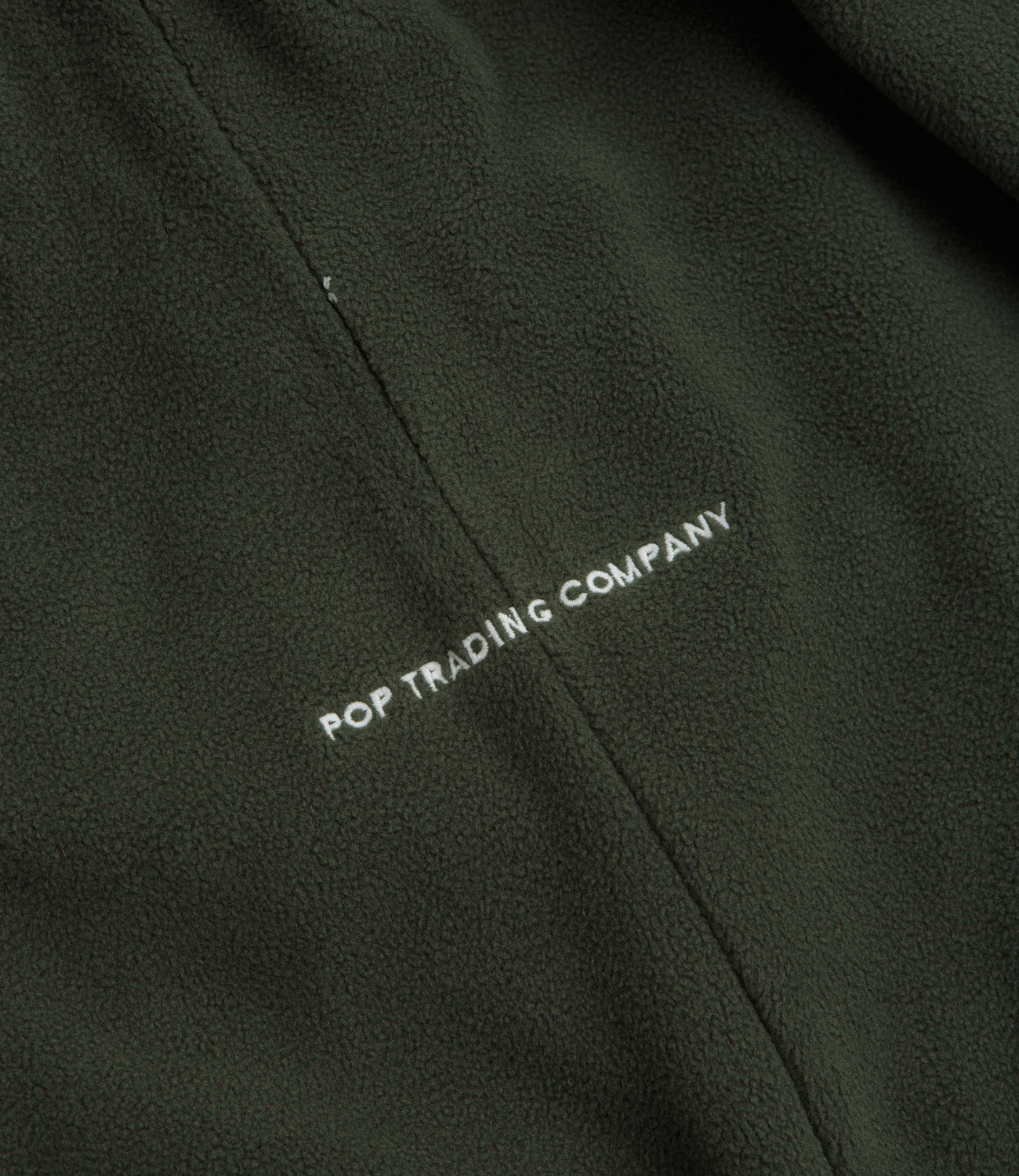 Pop Trading Company Arch Hoodie in Duffel Green. Made from 100% polyester polar fleece, this Pop Trading Company hoodie is designed with a triple panel hood with raglan sleeves. Featuring applique branding, embroidered ventilation eyelets and a kangaroo front pocket, this green Pop Trading Company hoodie is finished with ribbed cuffs, embroidered logos and a woven elastic hem.