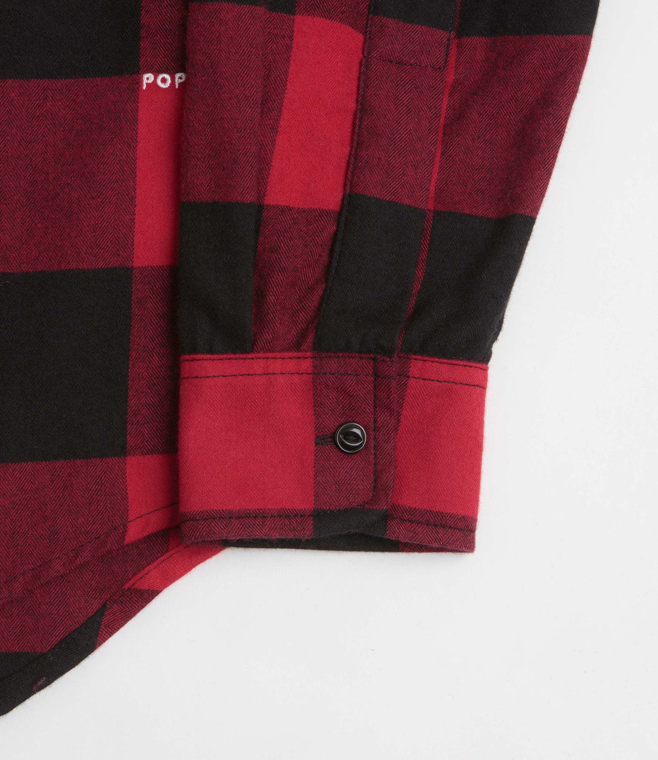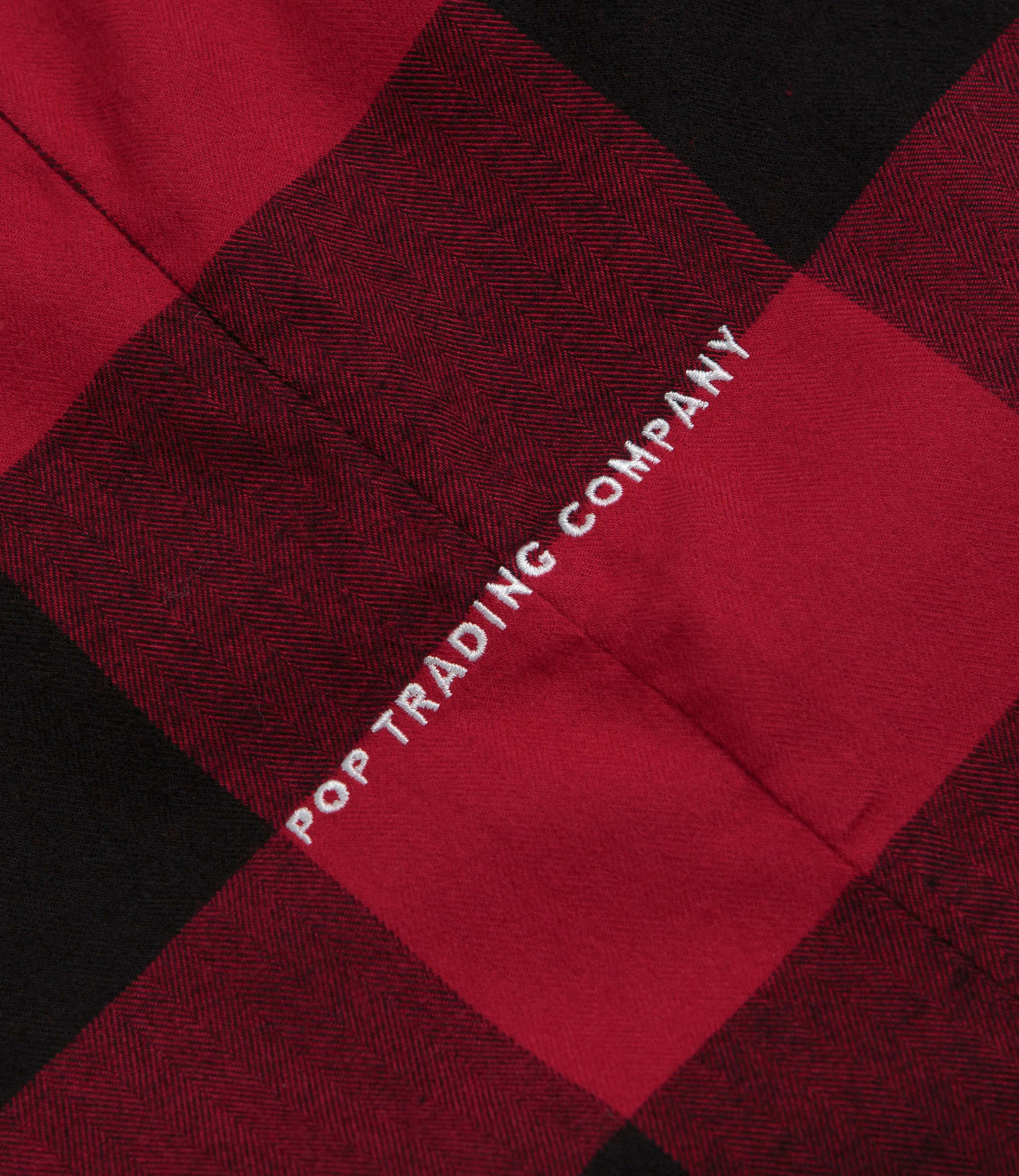 Pop Trading Company Checked BD Shirt in Black and Red. Featuring an all-over checkered pattern, this Pop Trading Company shirt is made from a cotton-mohair blend. Featuring a button-down collar, a full length fastening and adjustable cuffs, this black red Pop Trading Company shirt is finished with a curved hem, a single chest pocket and embroidered branding.