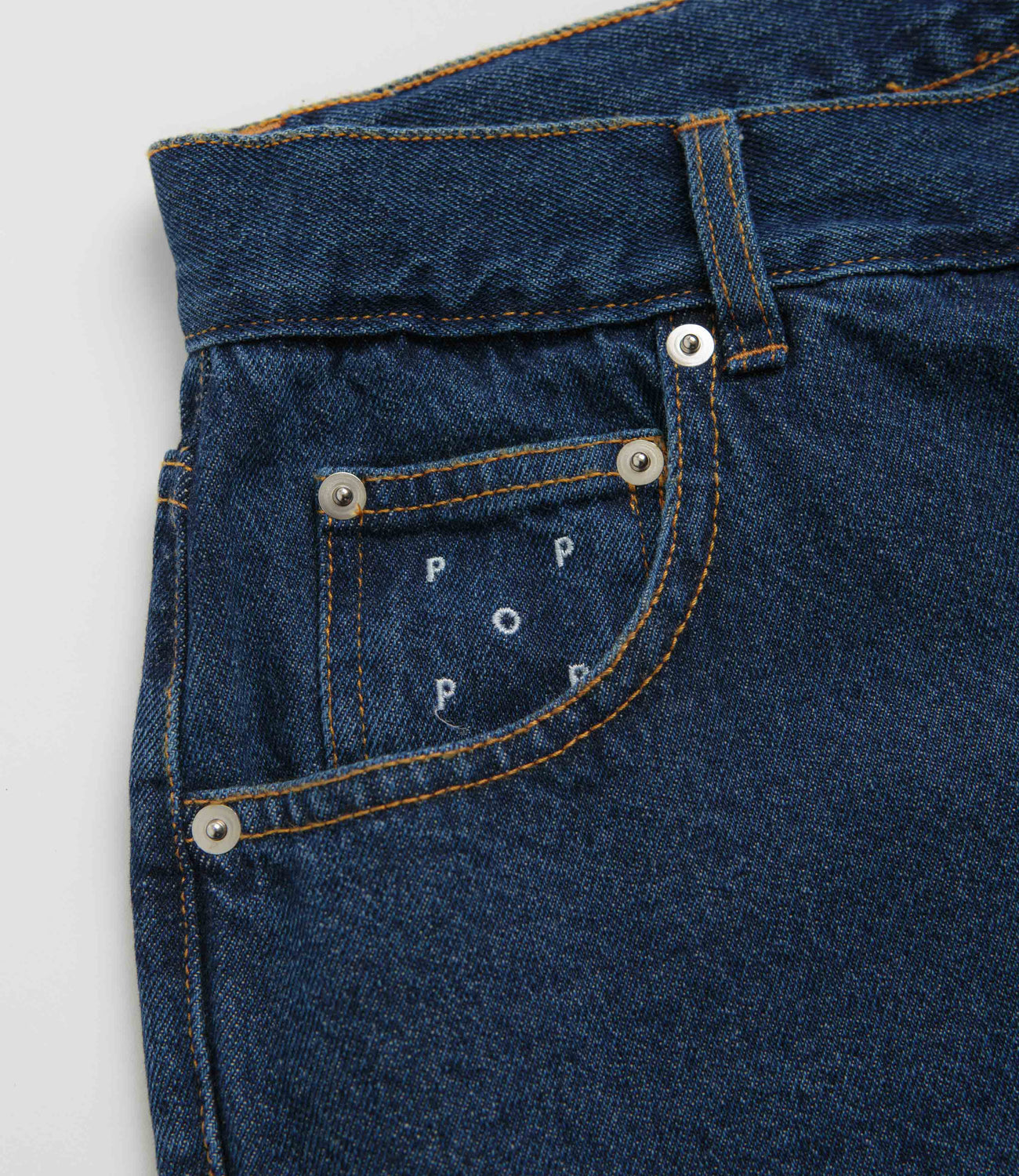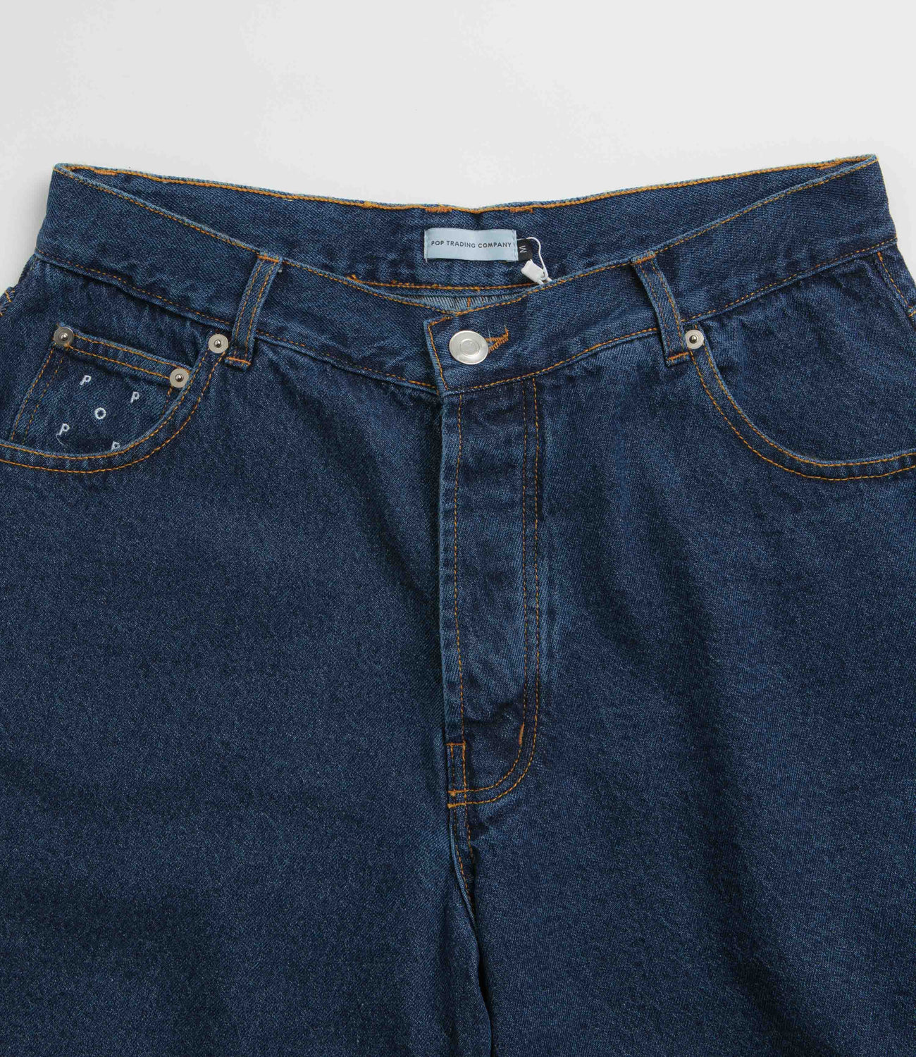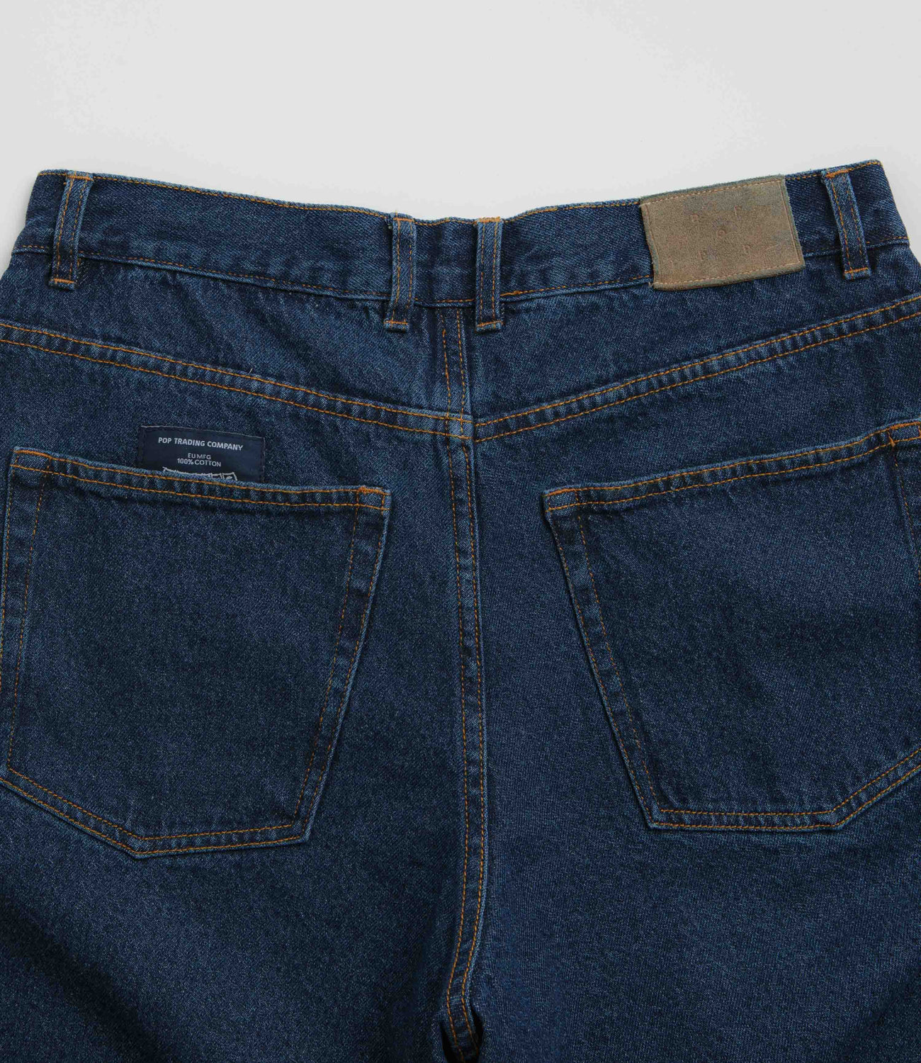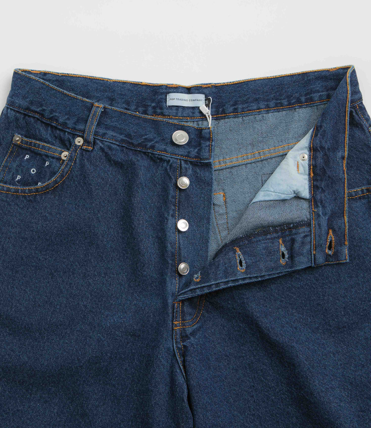 Pop Trading Company DRS Denim Shorts in Rinsed Denim. Loose fitting and made from 100% cotton denim, these straight leg Pop Trading Company shorts are made from 100% cotton denim. Featuring a belt loop waistband and a buttoned fly, these blue Pop Trading Company shorts are finished with four pockets, an embroidered coin pocket, a woven leather belt patch and woven flag label detailing.