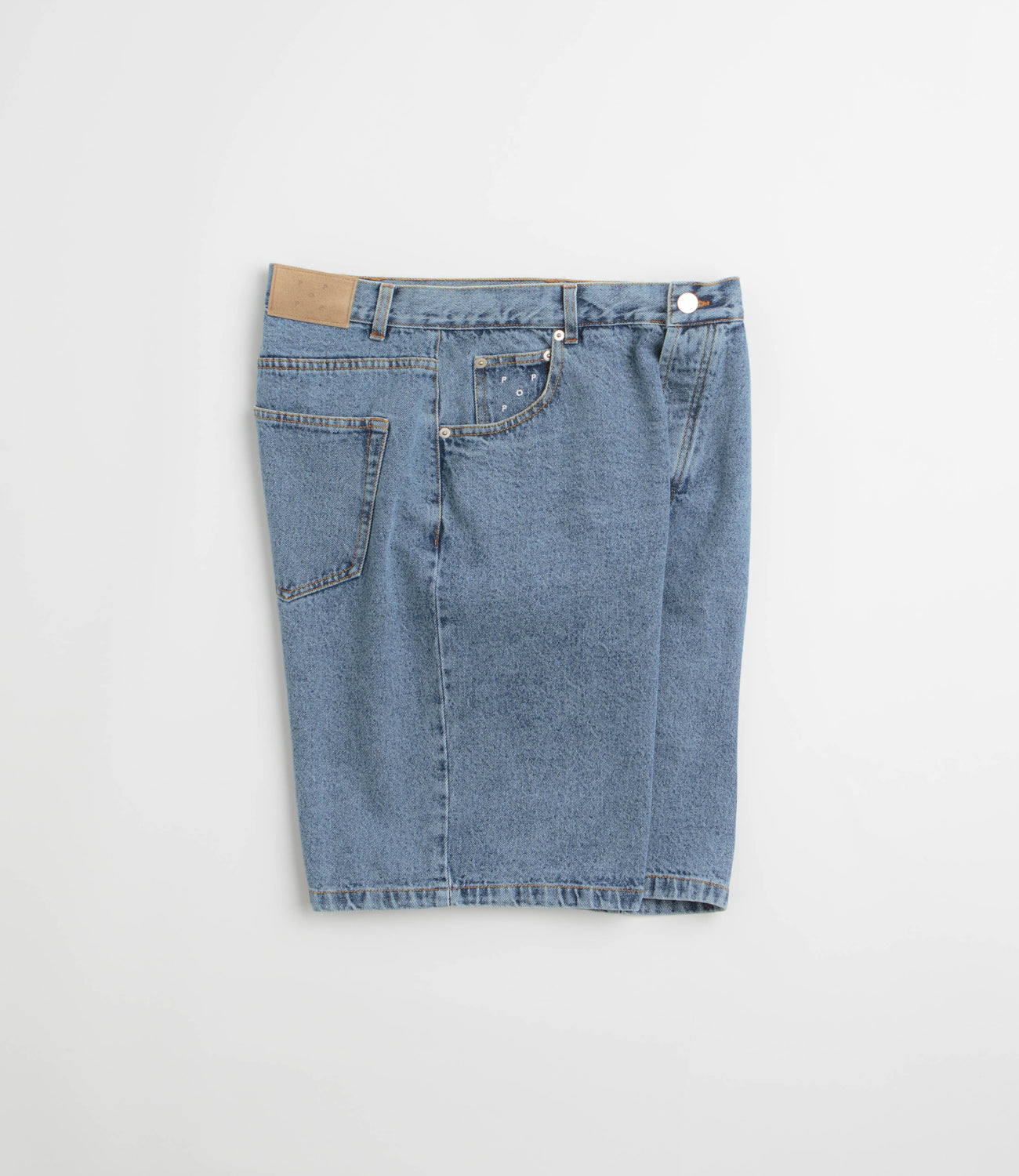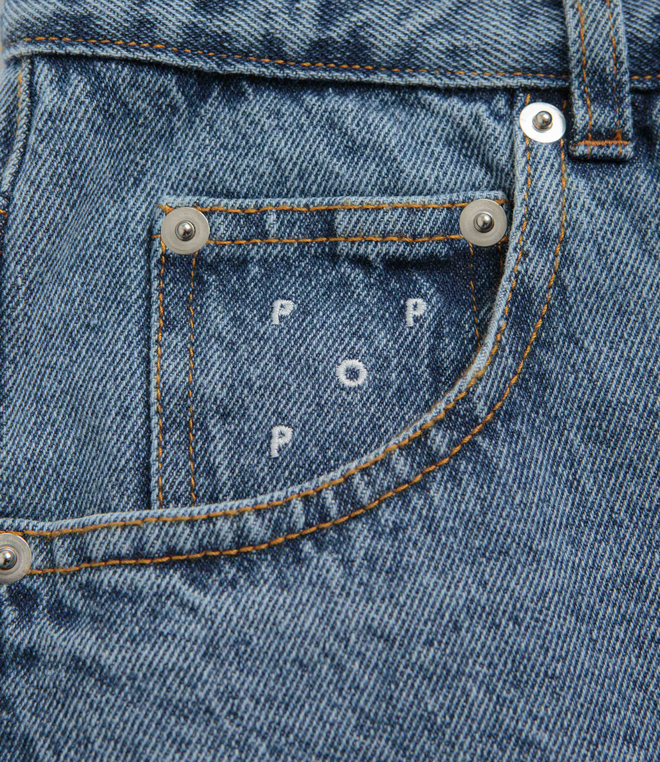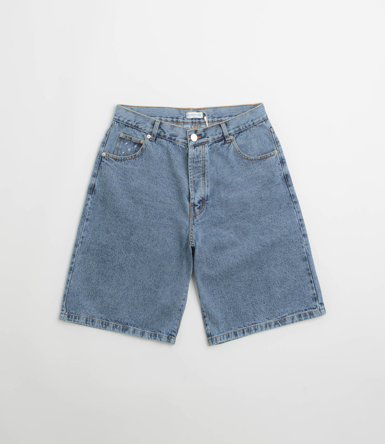Pop Trading Company DRS Denim Shorts in Stone Washed. Cut to knee length with a loose fit, these Pop Trading Company shorts are made from 100% cotton denim. Featuring a belt loop waist and a buttoned closure, these stonewashed blue Pop Trading Company shorts are finished with two front pockets, two rear pockets, an embroidered coin pocket and a leather belt patch.