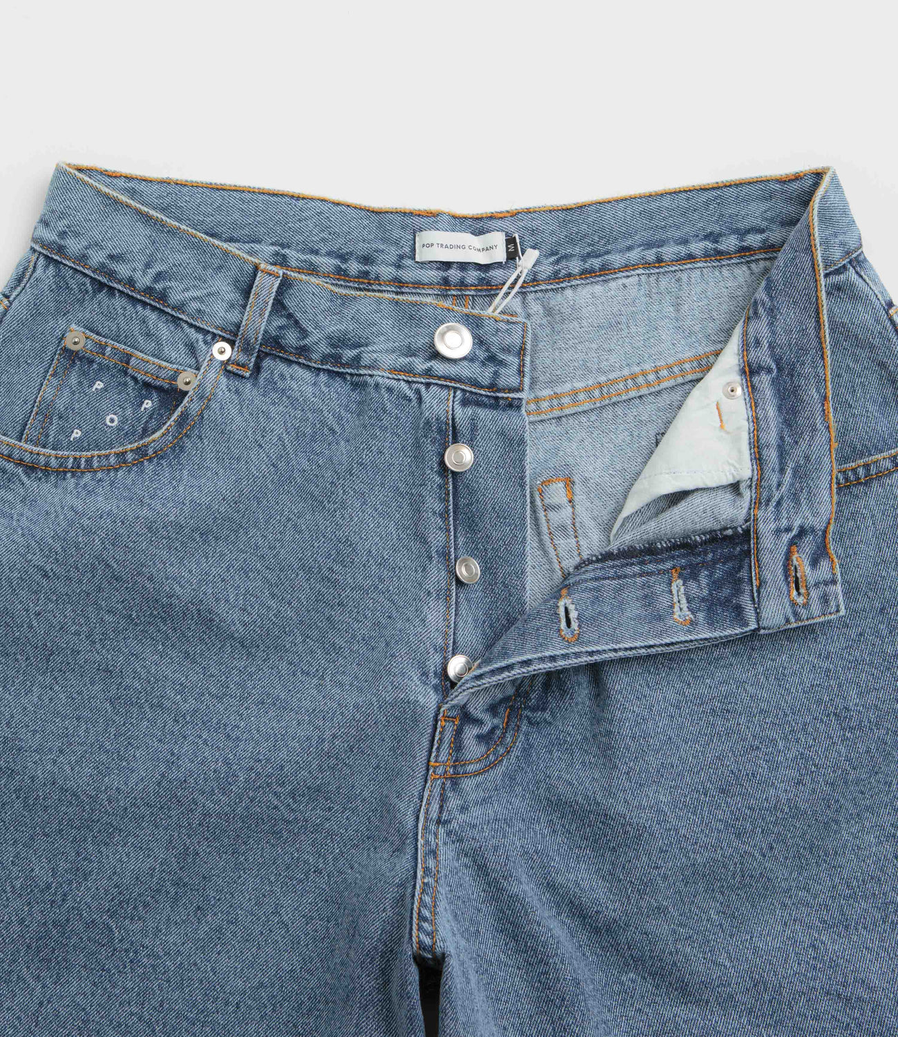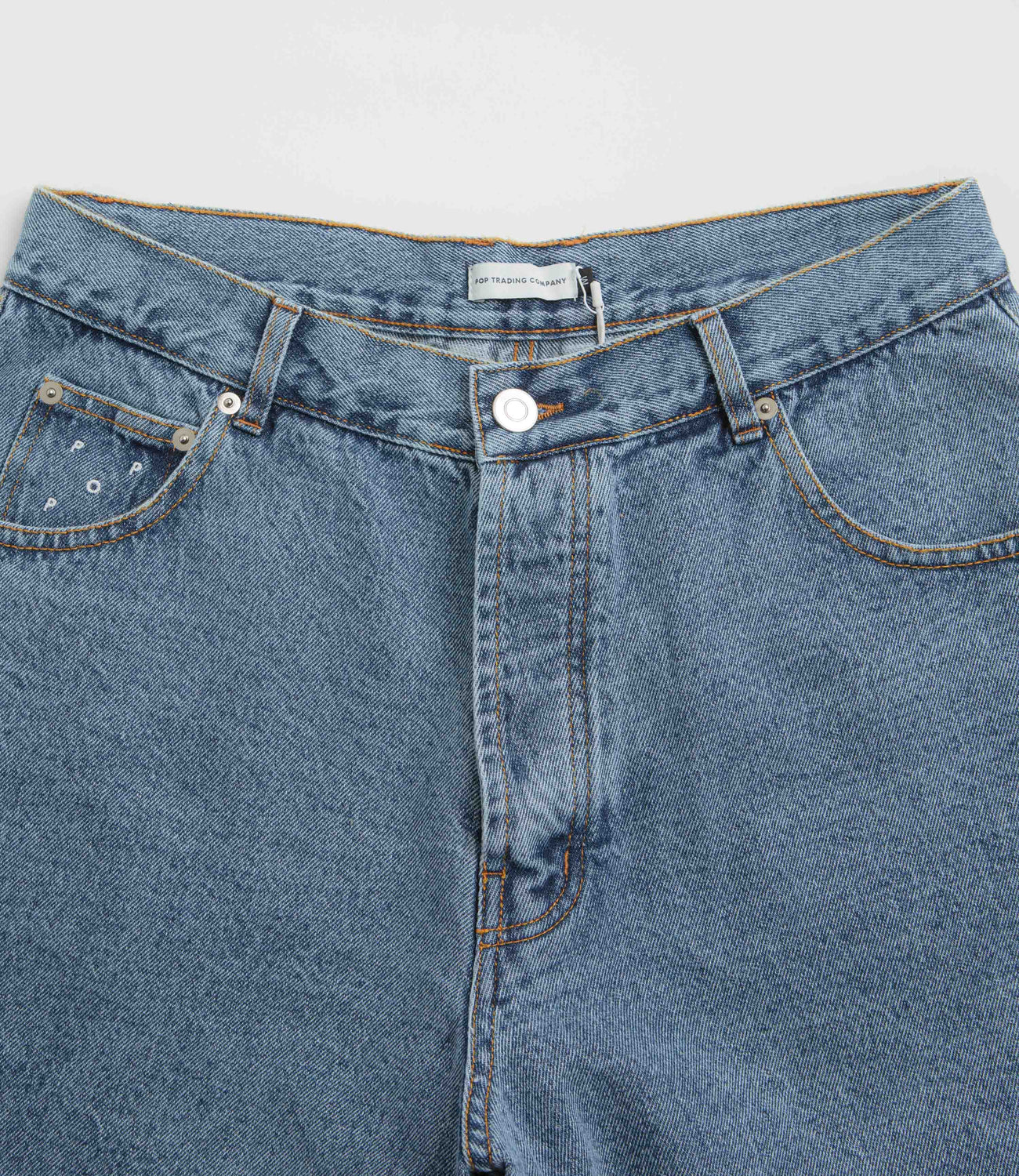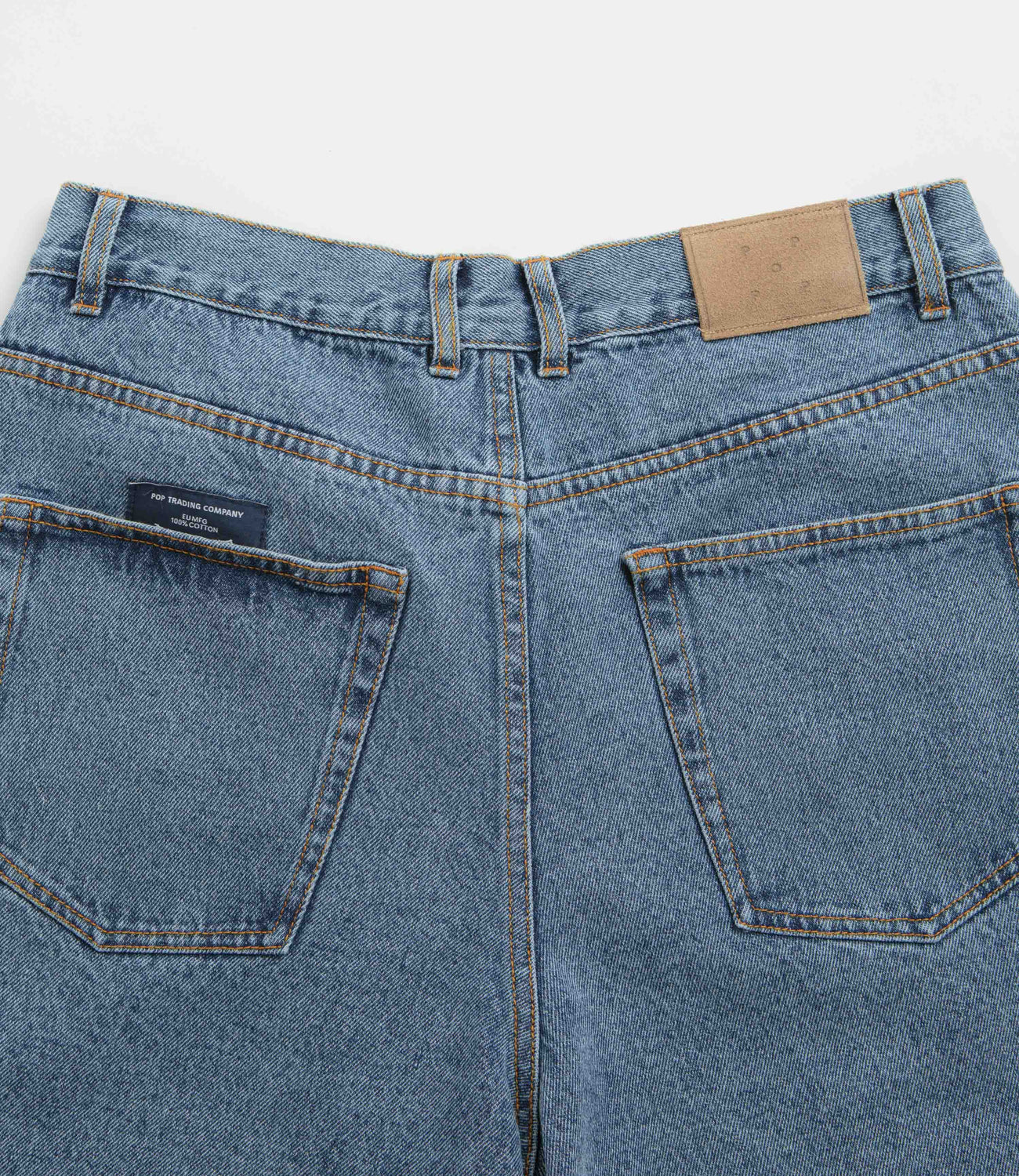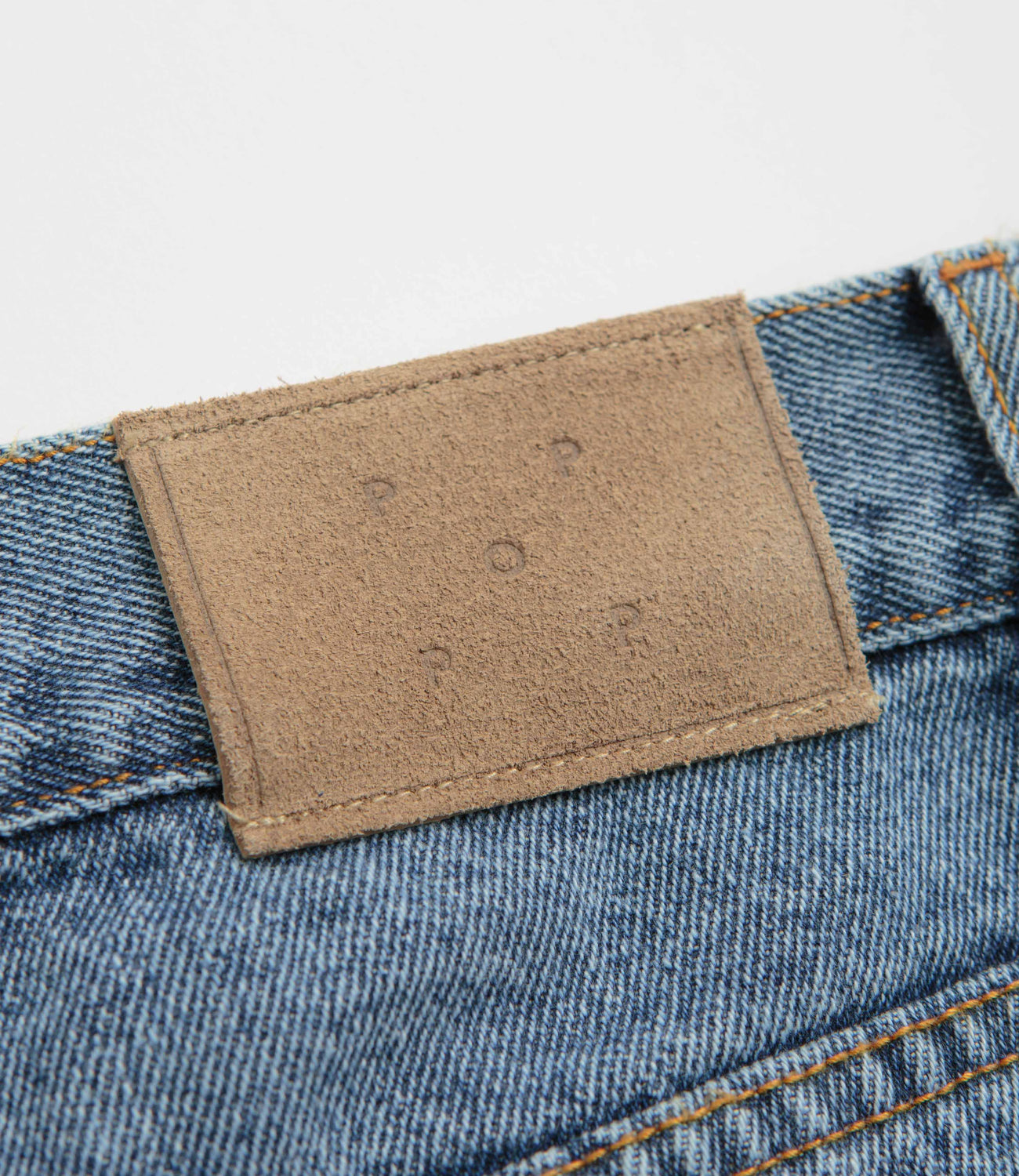 Pop Trading Company DRS Denim Shorts in Stone Washed. Cut to knee length with a loose fit, these Pop Trading Company shorts are made from 100% cotton denim. Featuring a belt loop waist and a buttoned closure, these stonewashed blue Pop Trading Company shorts are finished with two front pockets, two rear pockets, an embroidered coin pocket and a leather belt patch.
