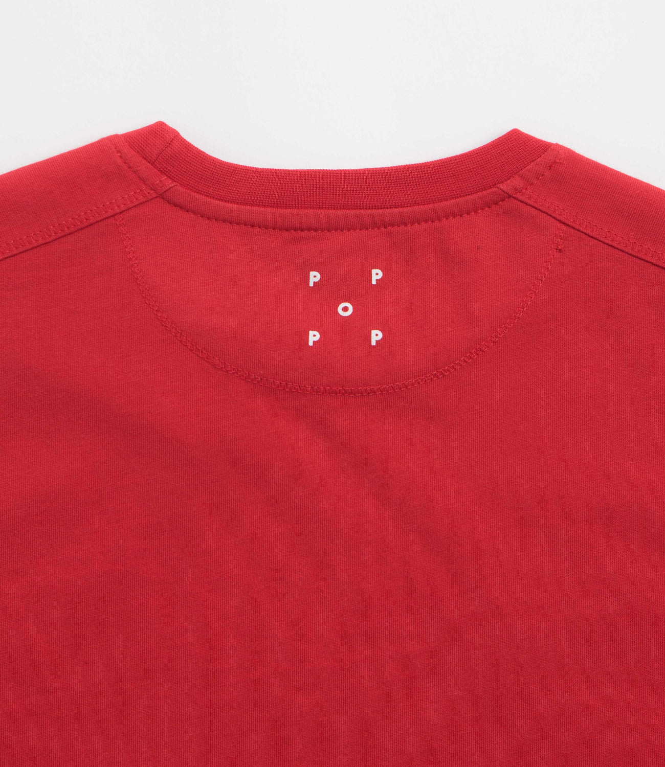 Pop Trading Company Hearts T-Shirt in Haute Red. Regular fitting and made from 100% cotton, this block tone Pop Trading Company t-shirt is designed with a rib knit collar and a straight cut hem. Finished in red with shoulder panels and printed graphics.
