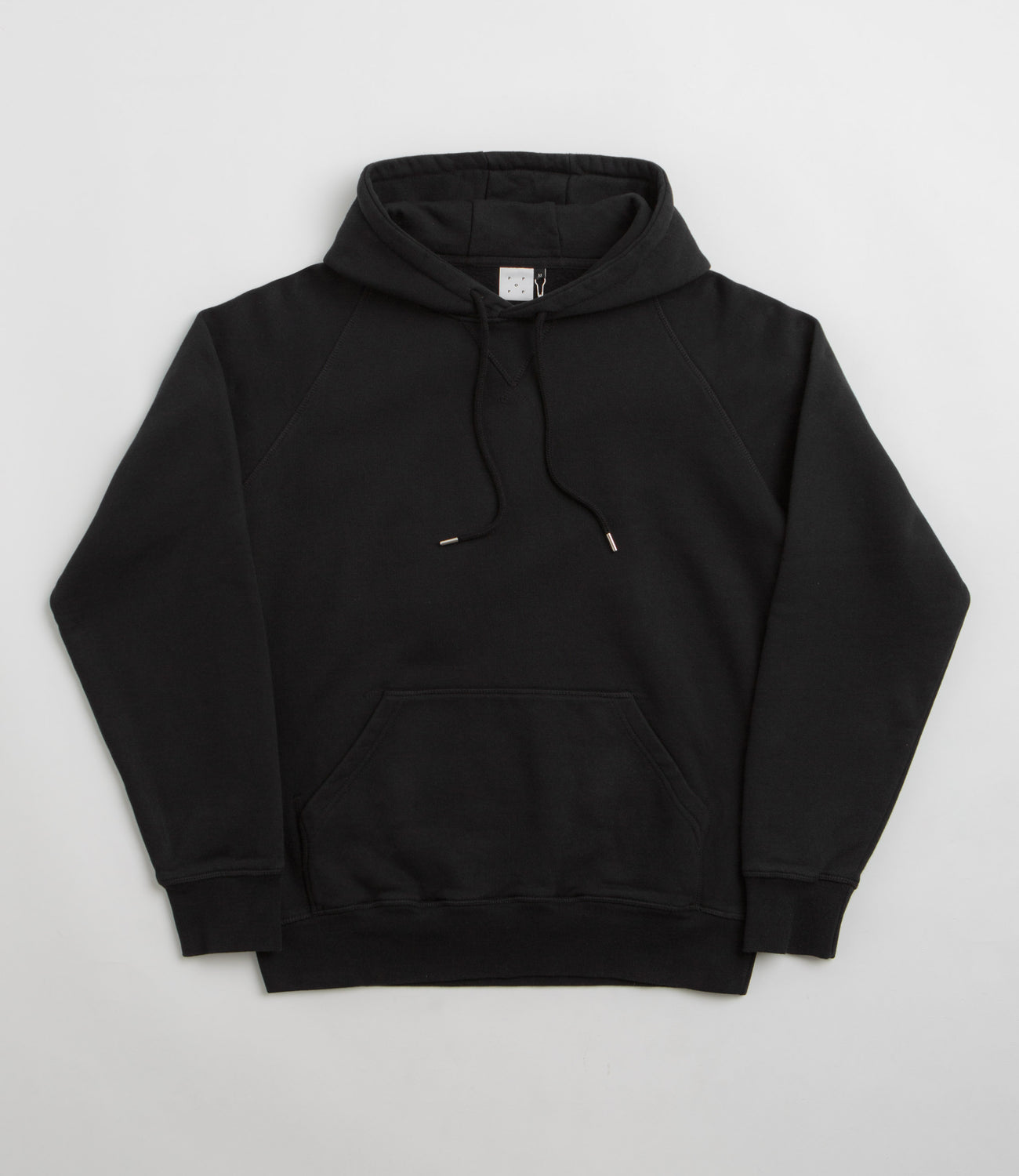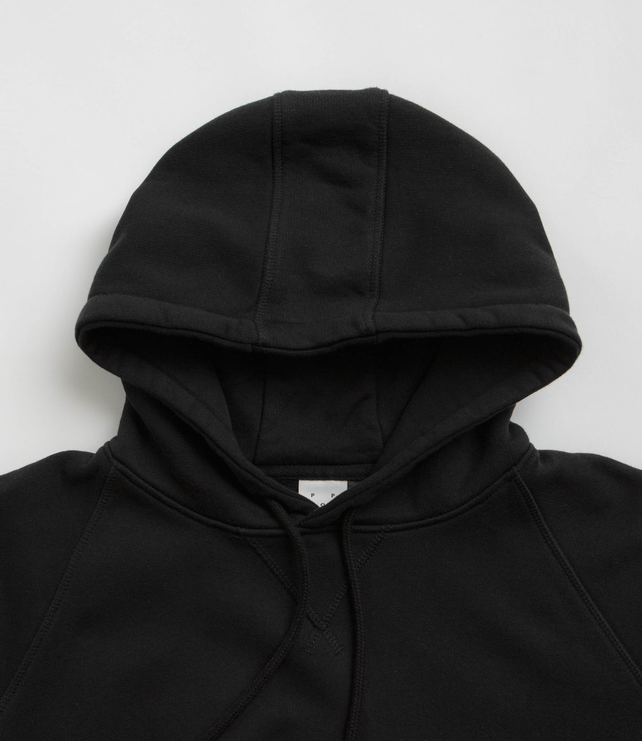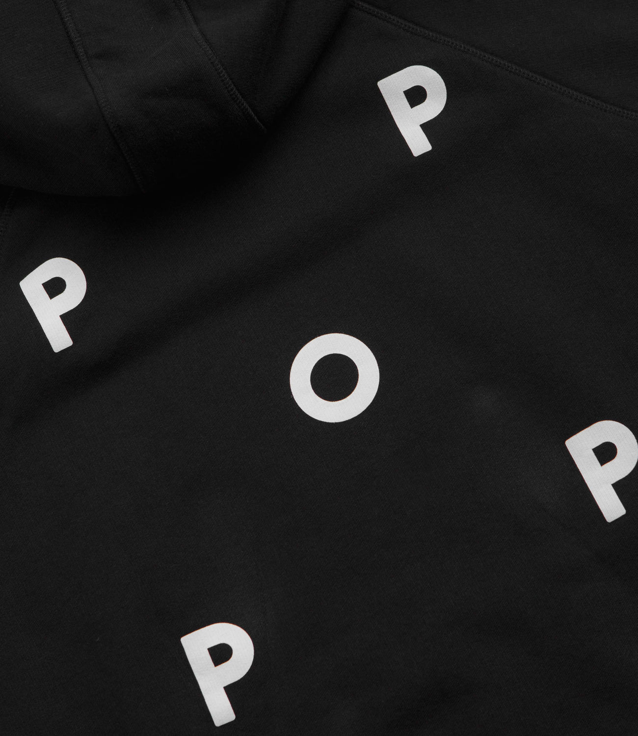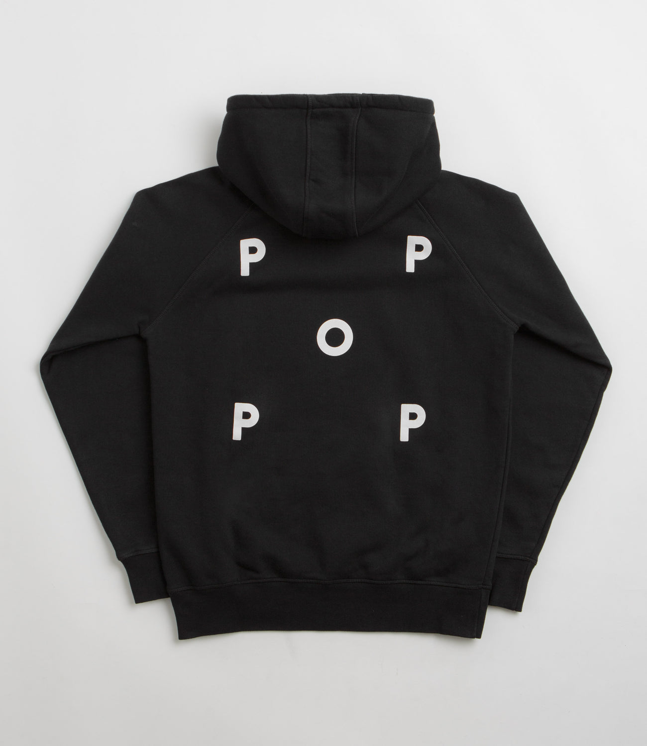 Pop Trading Company Logo Hoodie in Black and White. Regular fitting and made from 100% cotton, this Pop Trading Company hoodie is designed with a triple panel drawstring hood. Featuring underarm ventilation eyelets and a kangaroo front pocket, this black Pop Trading Company hoodie is finished with rib knit cuffs, embroidered logos and printed rear graphics.