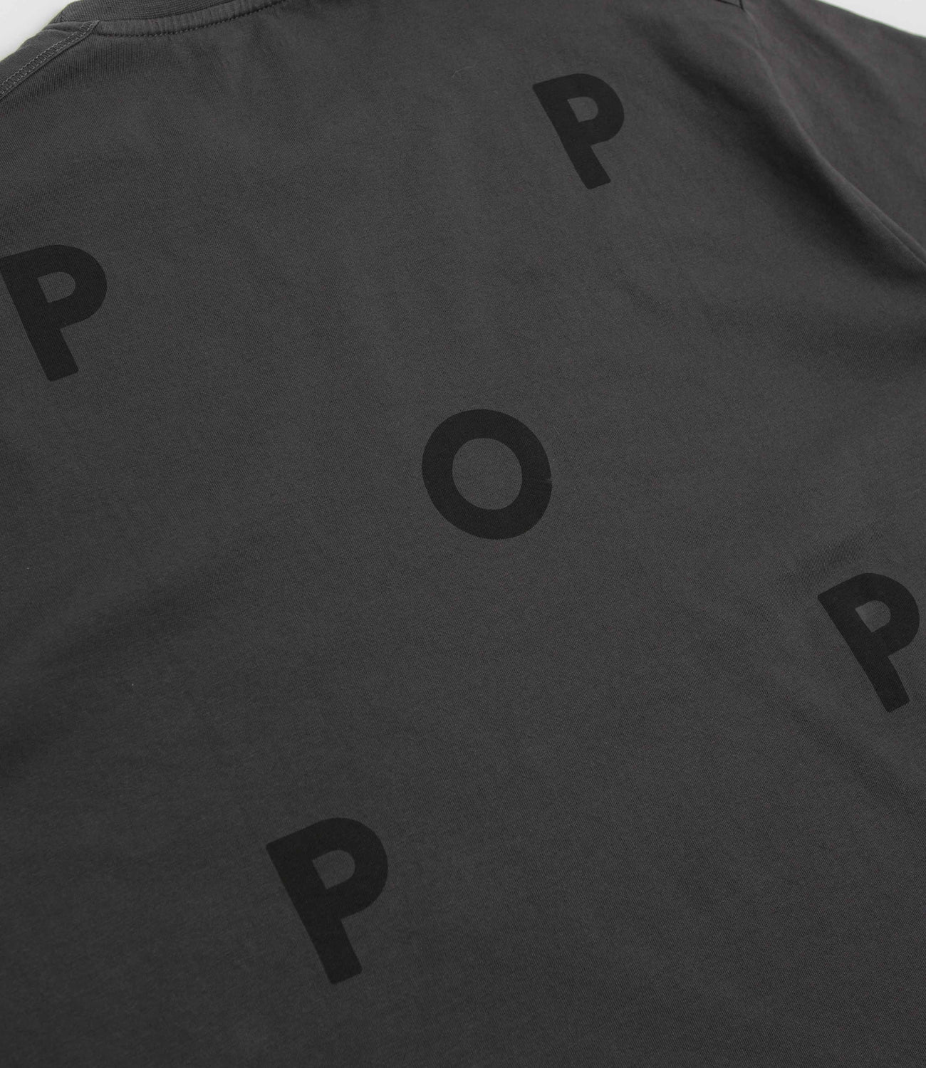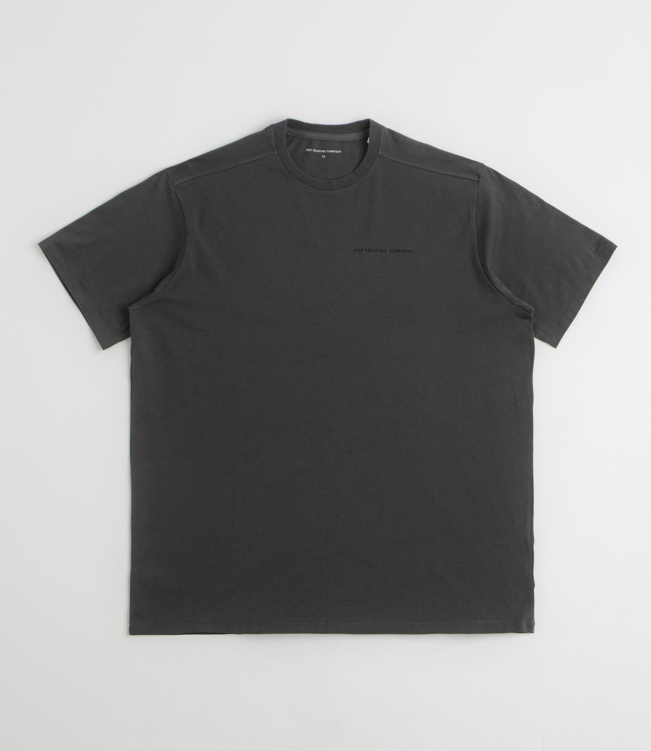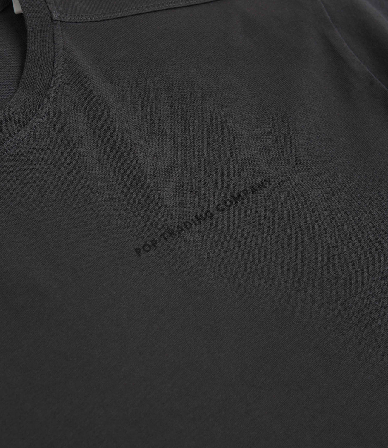 Pop Trading Company Logo T-Shirt in Anthracite and Black. Made from 100% cotton, this block tone Pop Trading Company t-shirt is designed with a rib knit collar and herringbone neck tape. Finished in grey black with printed logo branding.