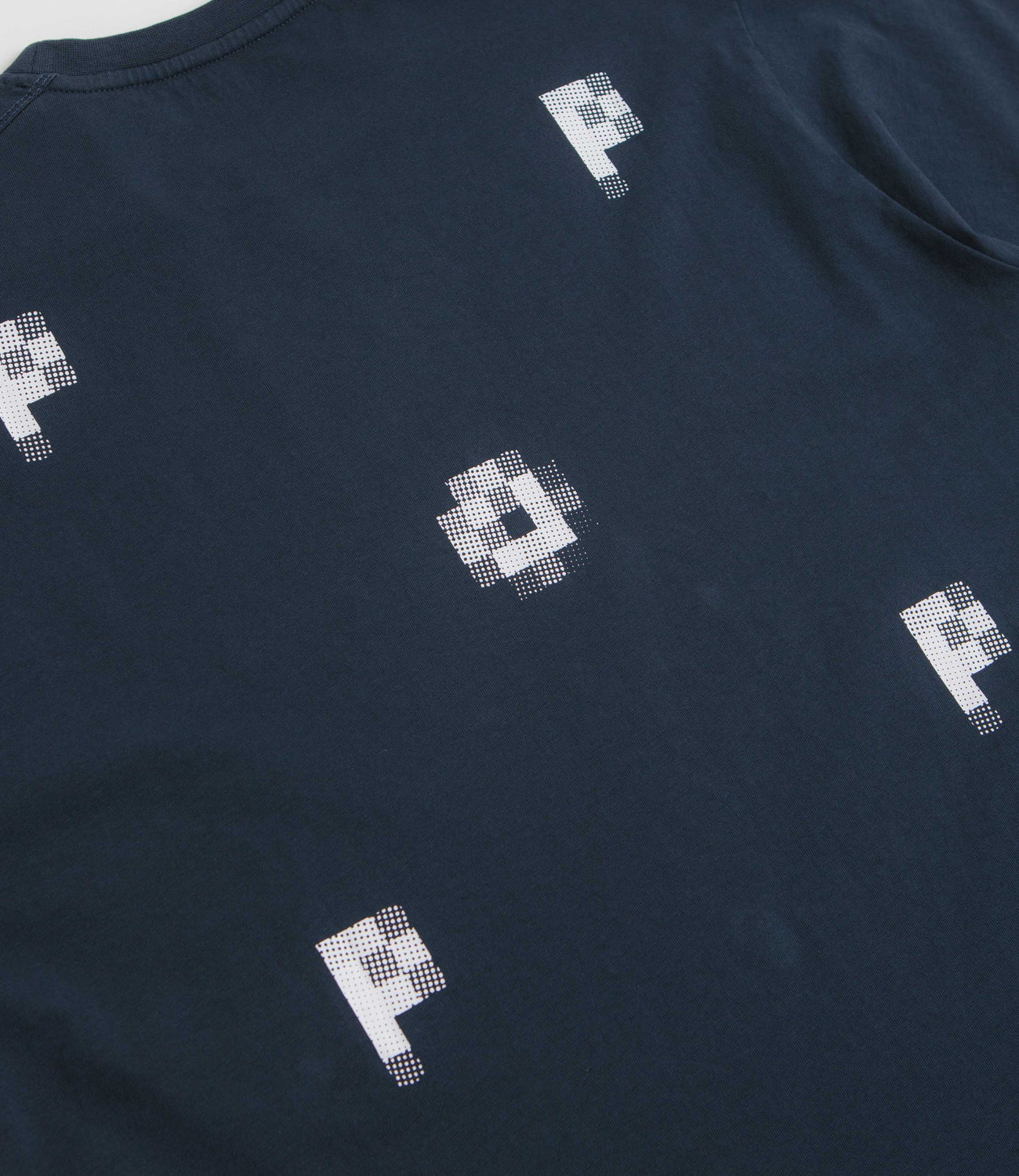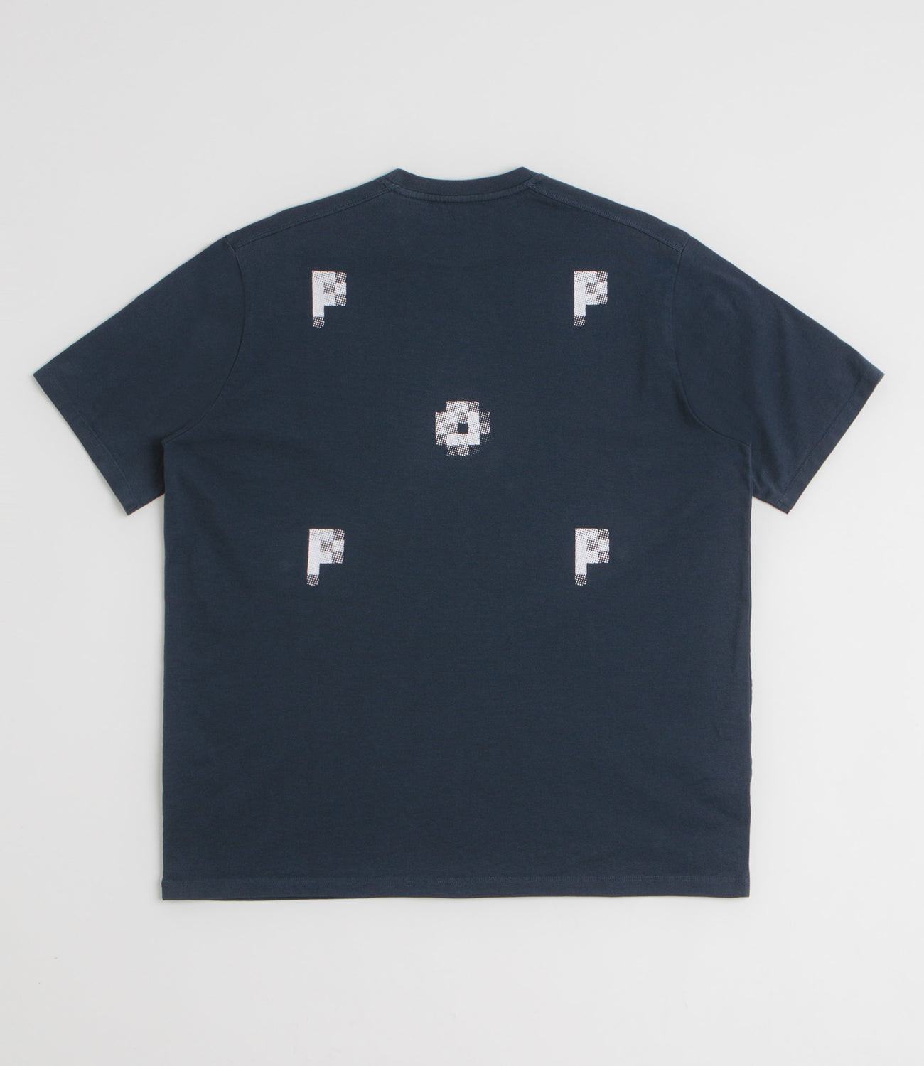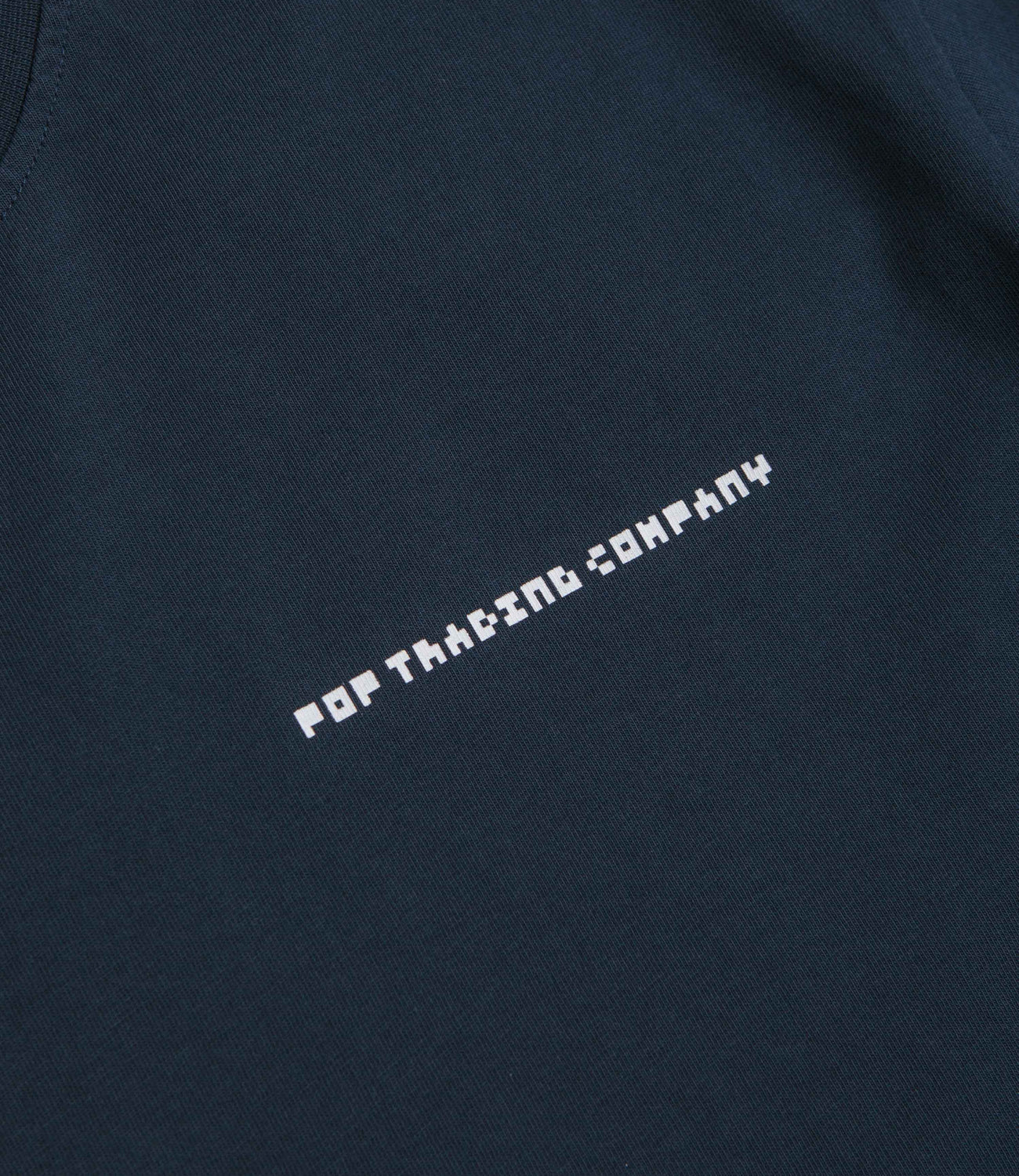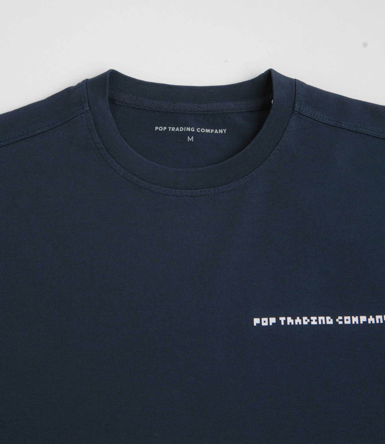 Pop Trading Company Pixel Logo T-Shirt in Navy. Made from 100% cotton, this block tone Pop Trading Company t-shirt is designed with a rib knit collar and herringbone neck tape. Finished in navy with a printed logo and a pixelated logo printed across the rear.