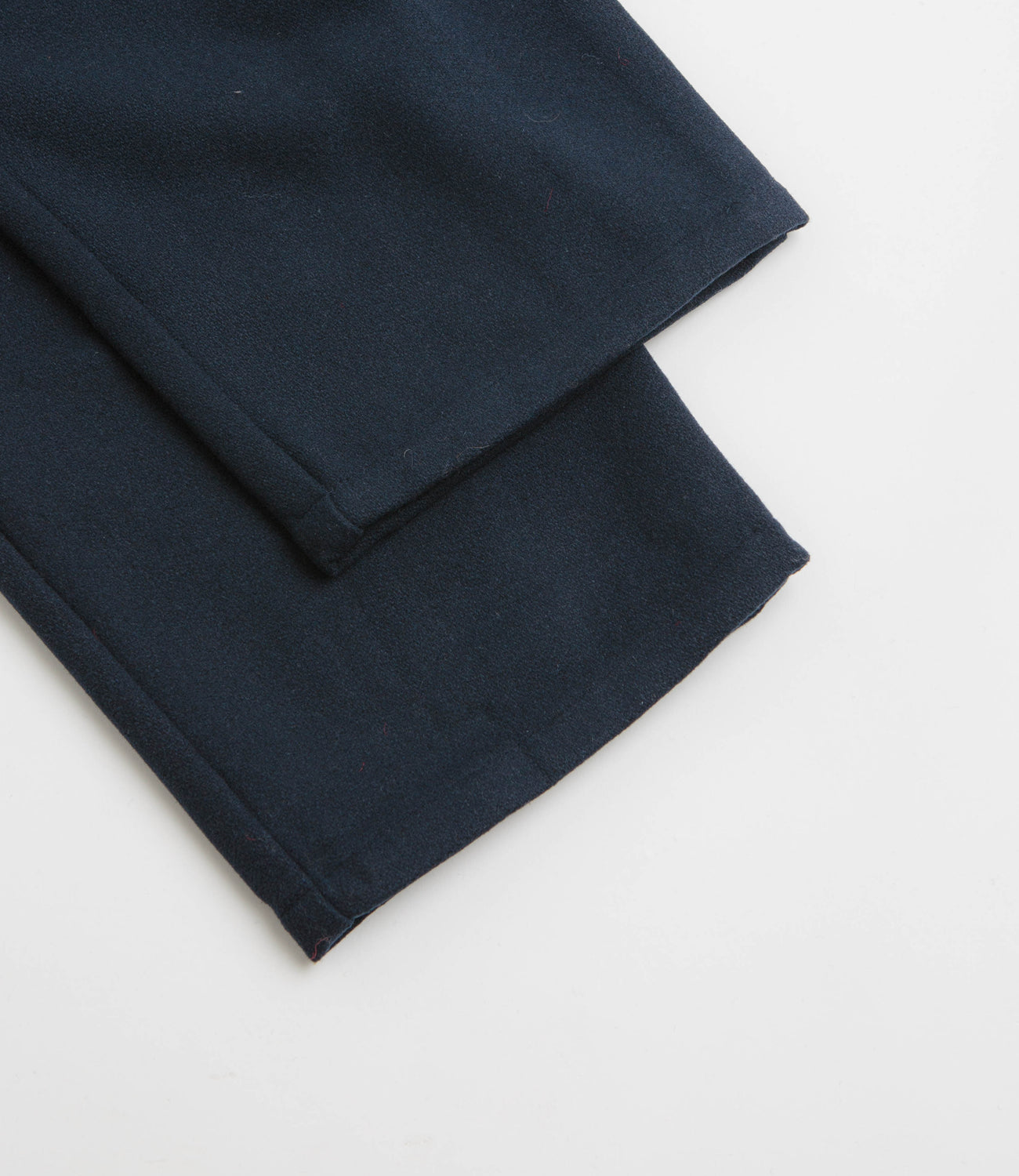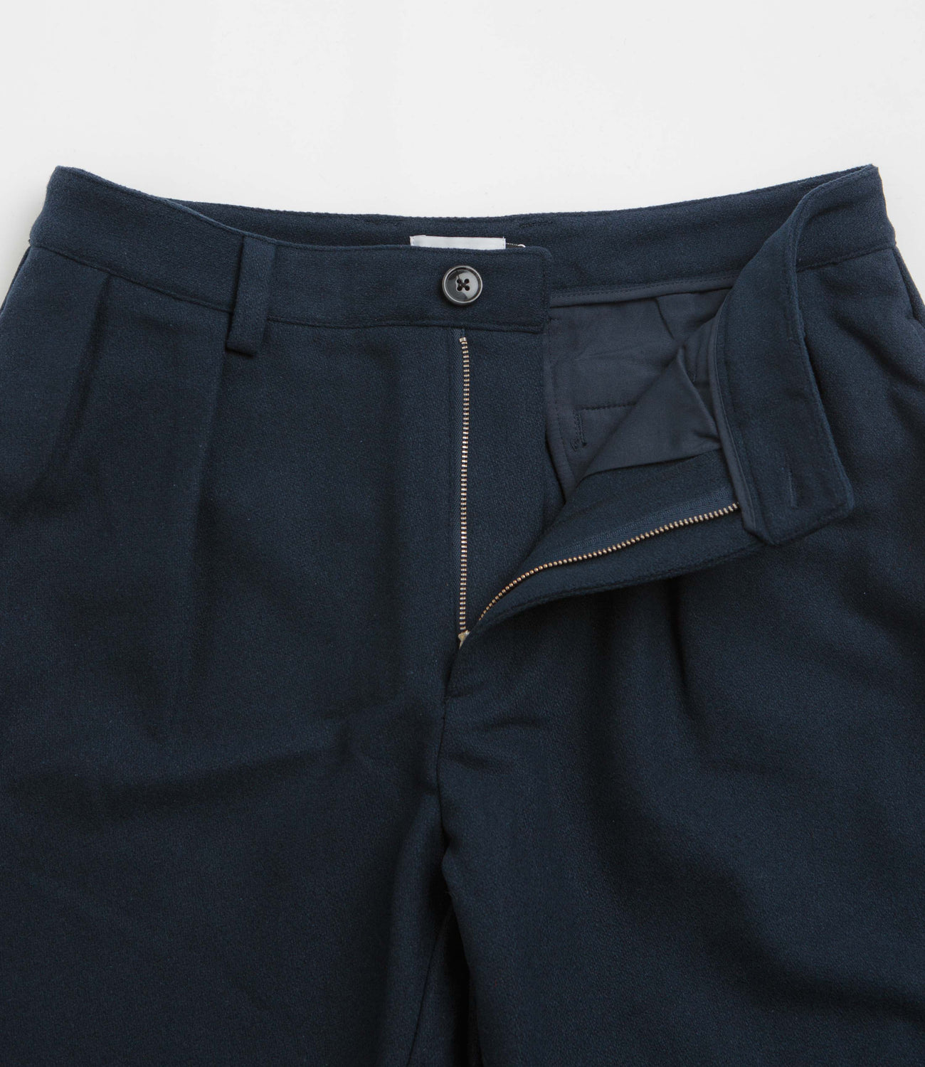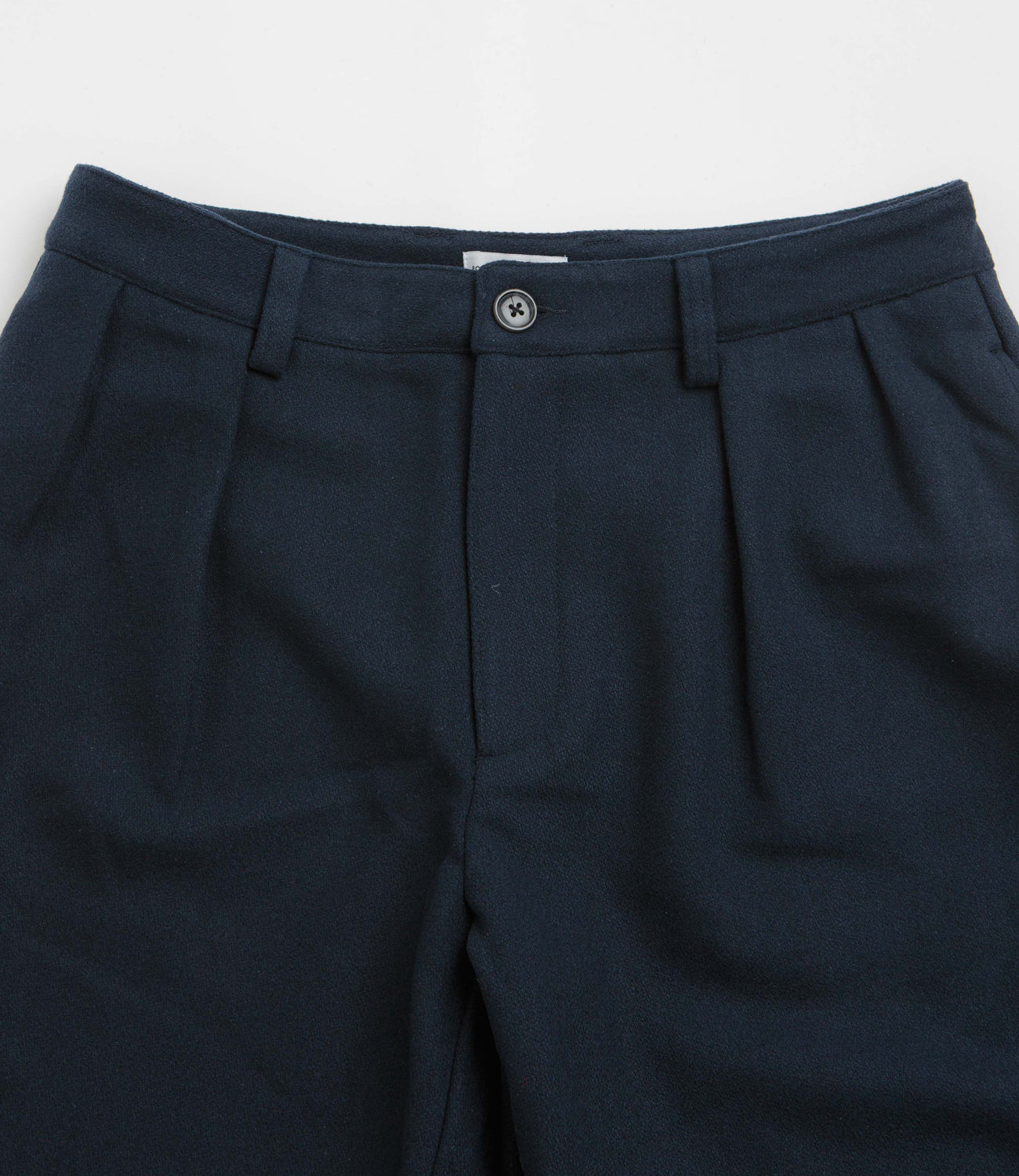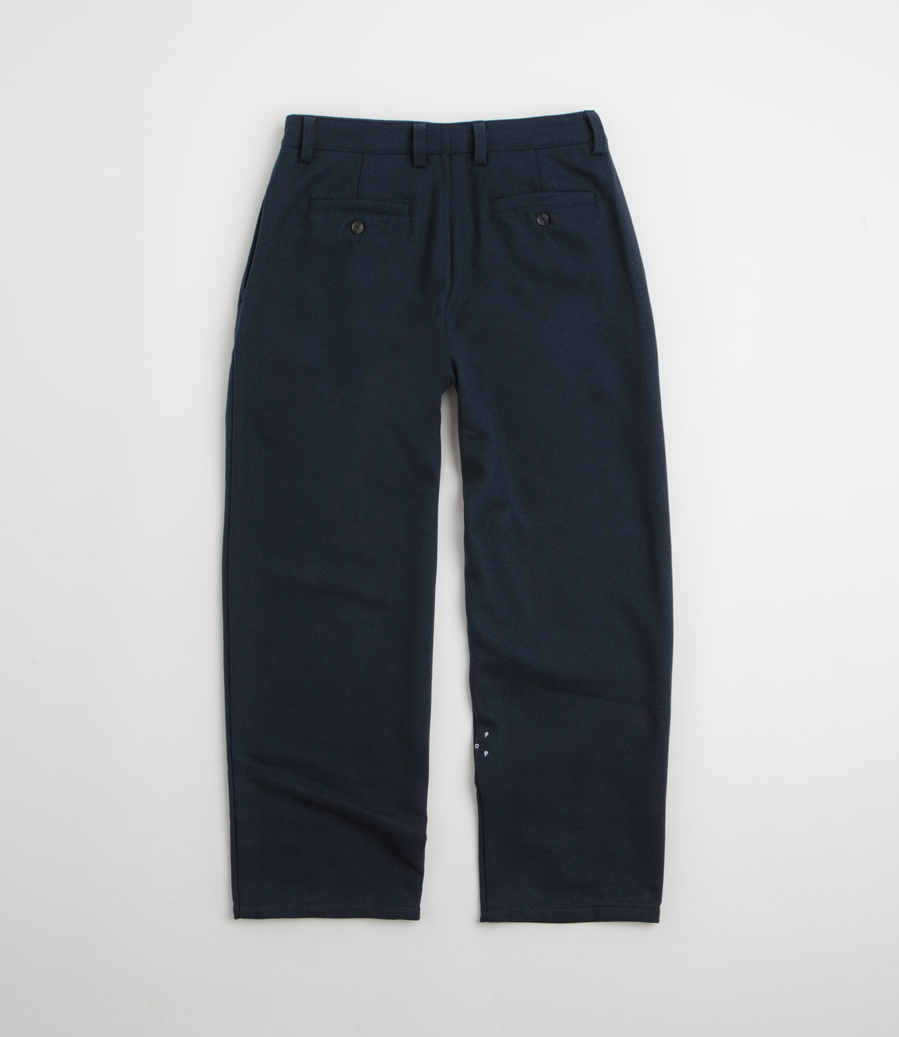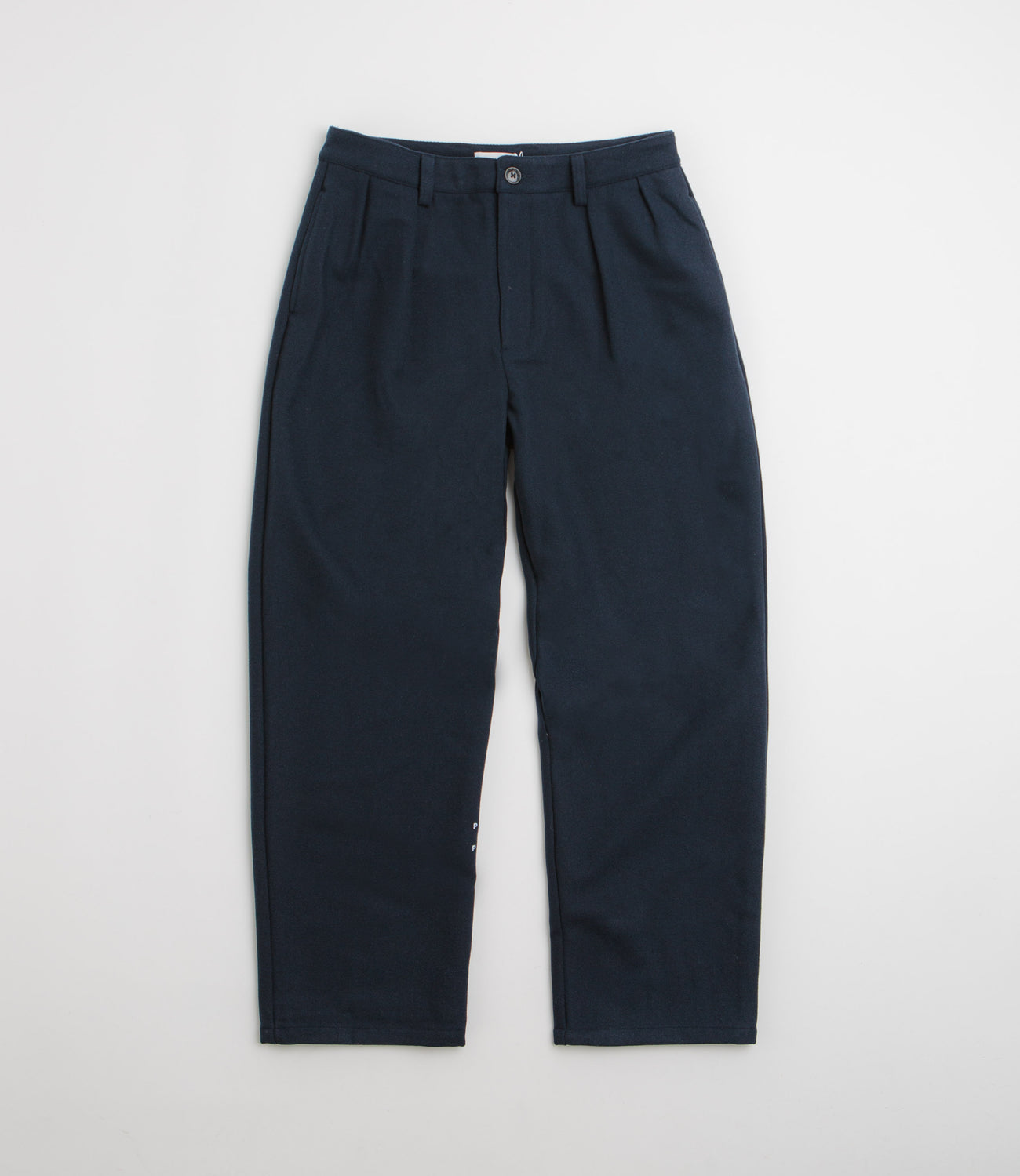Pop Trading Company Wool Hewitt Suit Pants in Navy. Featuring pleated details, these loose fitting Pop Trading Company pants are made from a polyester-wool blend. Featuring a belt loop waistband, a zippered fly and two side pockets, these navy Pop Trading Company suit pants are finished with two rear pockets, embroidered branding and tortoise hardware.