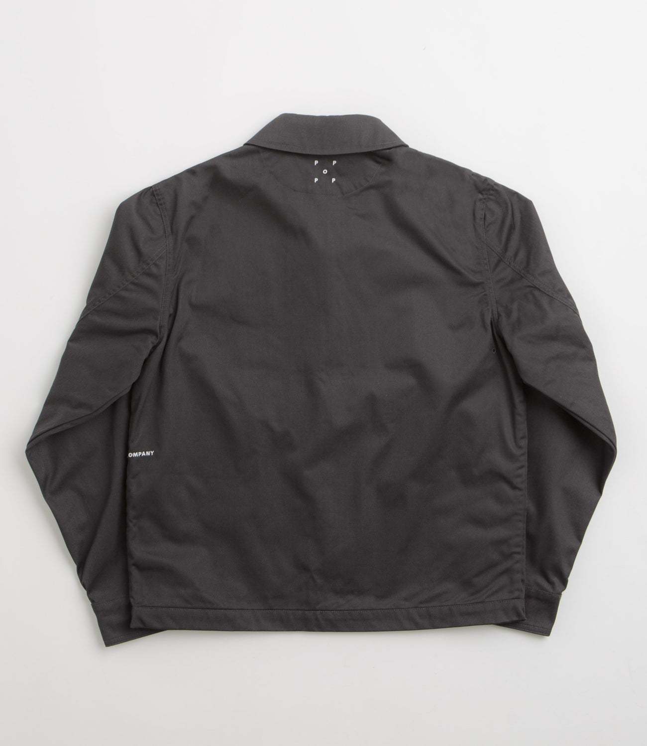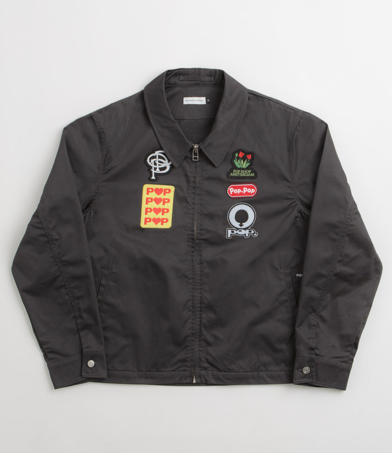 Pop Trading Company Worker Jacket in Anthracite. Regular fitting with a full length zipper fastening, this Pop Trading Company jacket is made from a polyester-cotton blend. Featuring a stand collar, two side pockets, lower inner pockets and adjustable cuffs, this grey Pop Trading Company jacket is finished with embroidered patch graphics and ventilation eyelets.