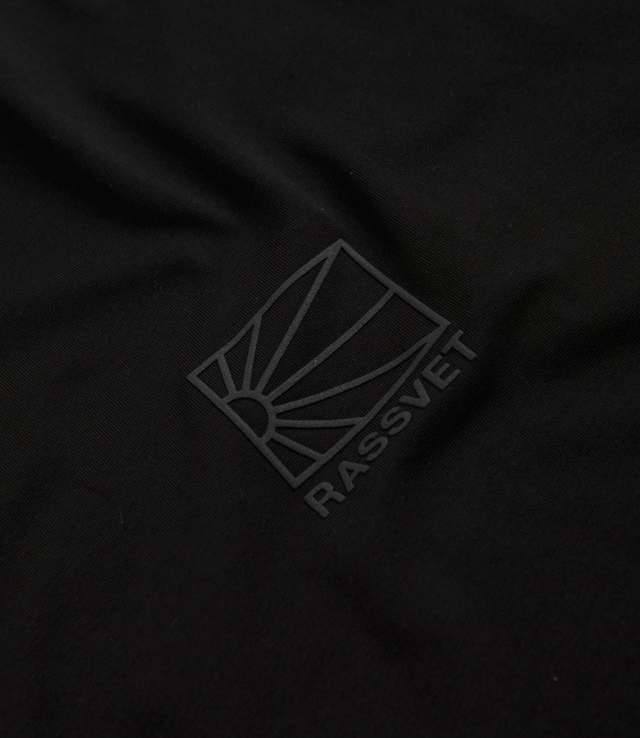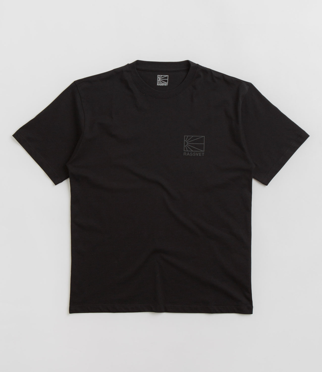 Rassvet Mini Logo T-Shirt in Black. Regular fitting and made from 100% cotton, this new season Rassvet t-shirt is designed with a flexible rib knit collar and a straight cut hem. Finished in a shade of black with tonal stitched seams and a printed left chest graphic.