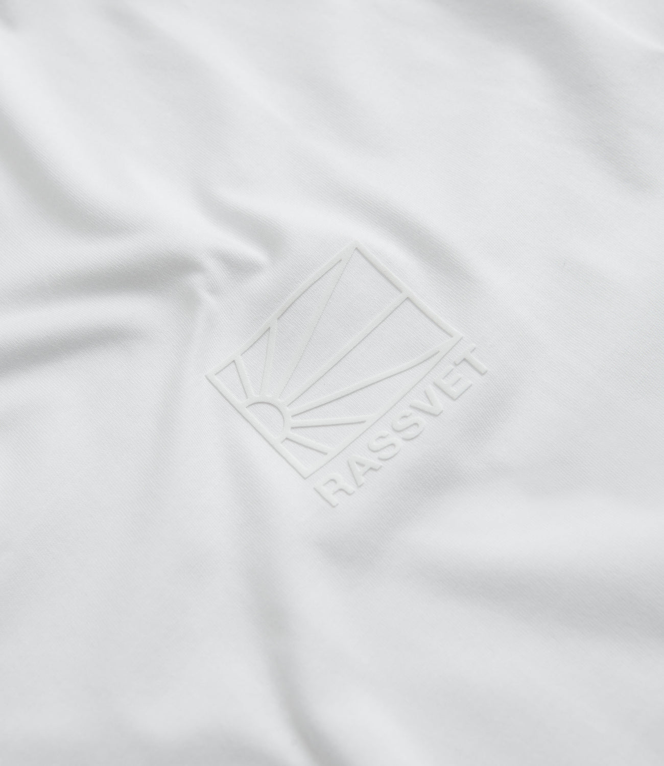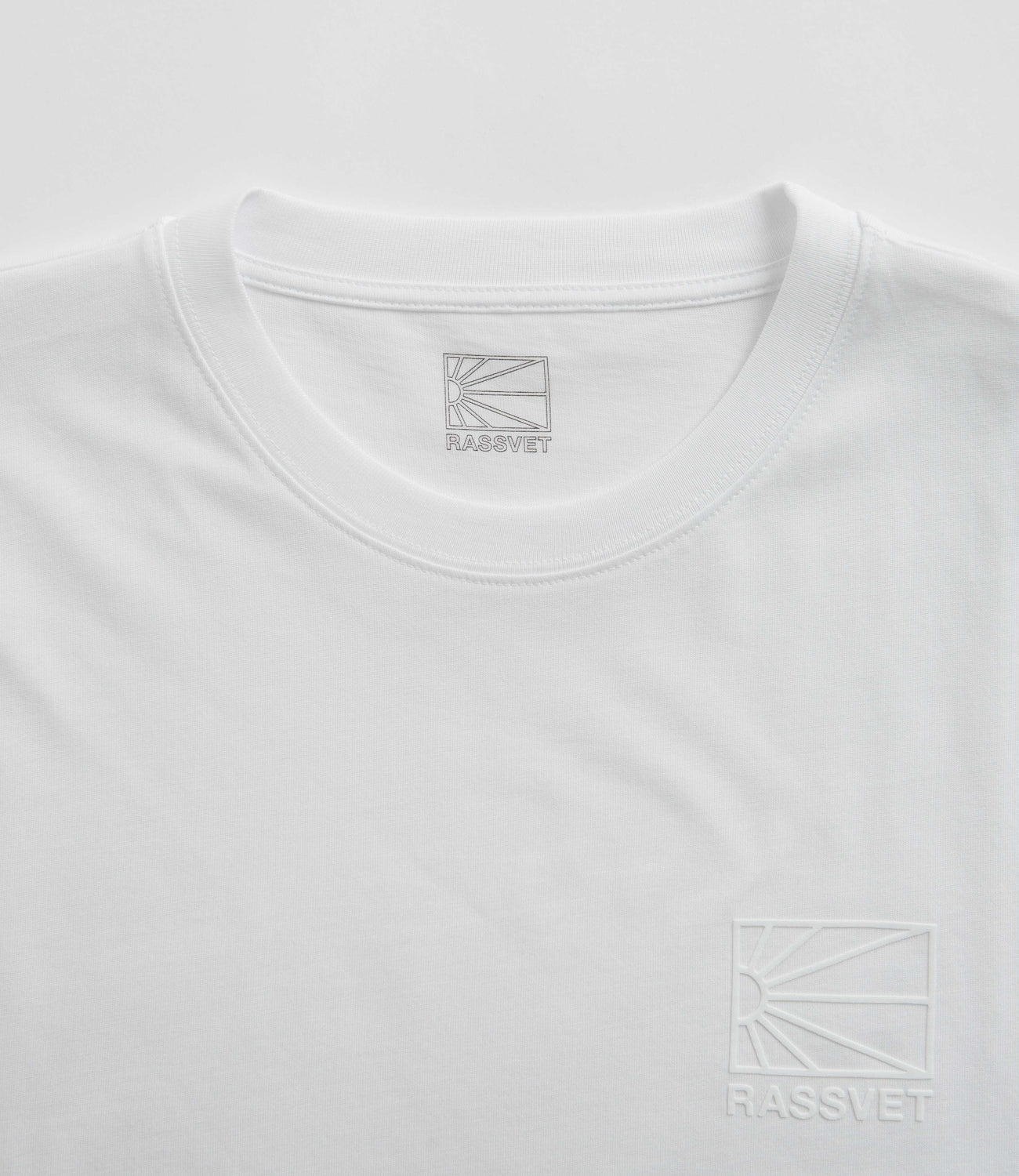 Rassvet Mini Logo T-Shirt in White. Part of the brand’s latest release, this Rassvet t-shirt is made from 100% cotton and tailored to a regular fitting. Featuring a classic crew collar and a straight cut hem, this white Rassvet t-shirt is finished with a printed left chest graphic.