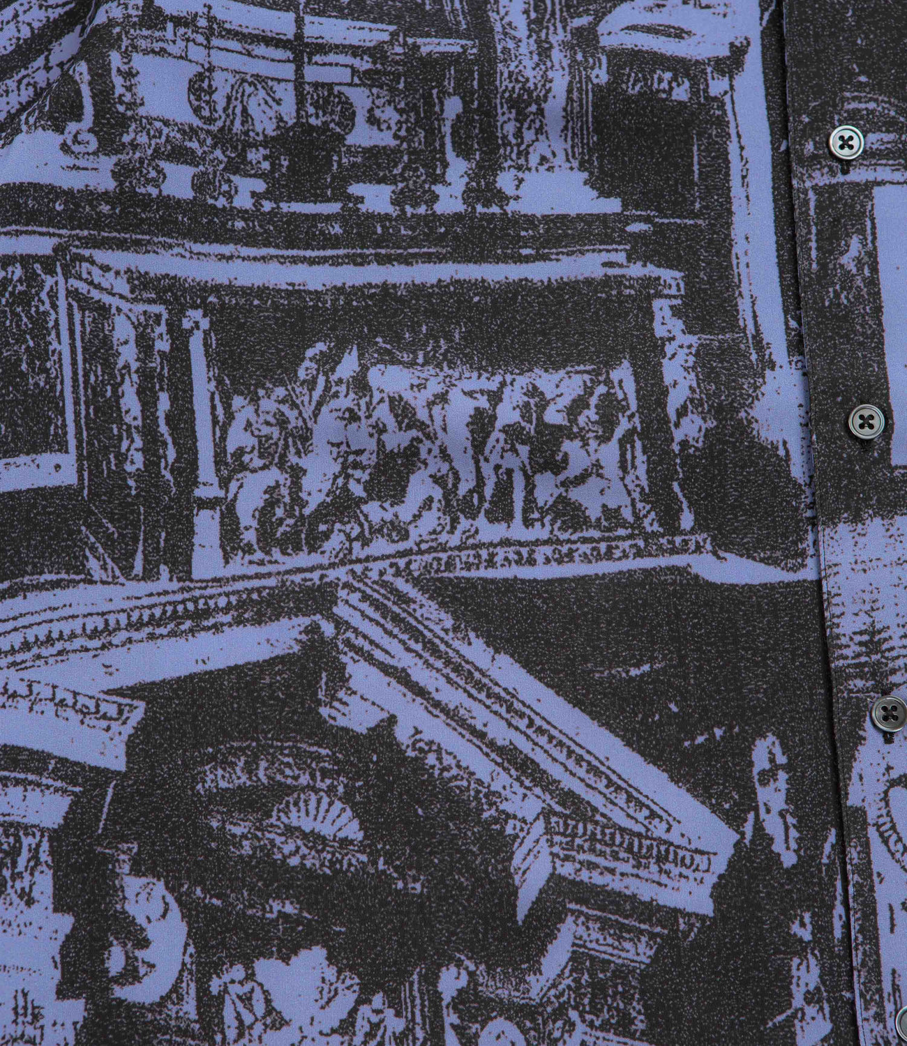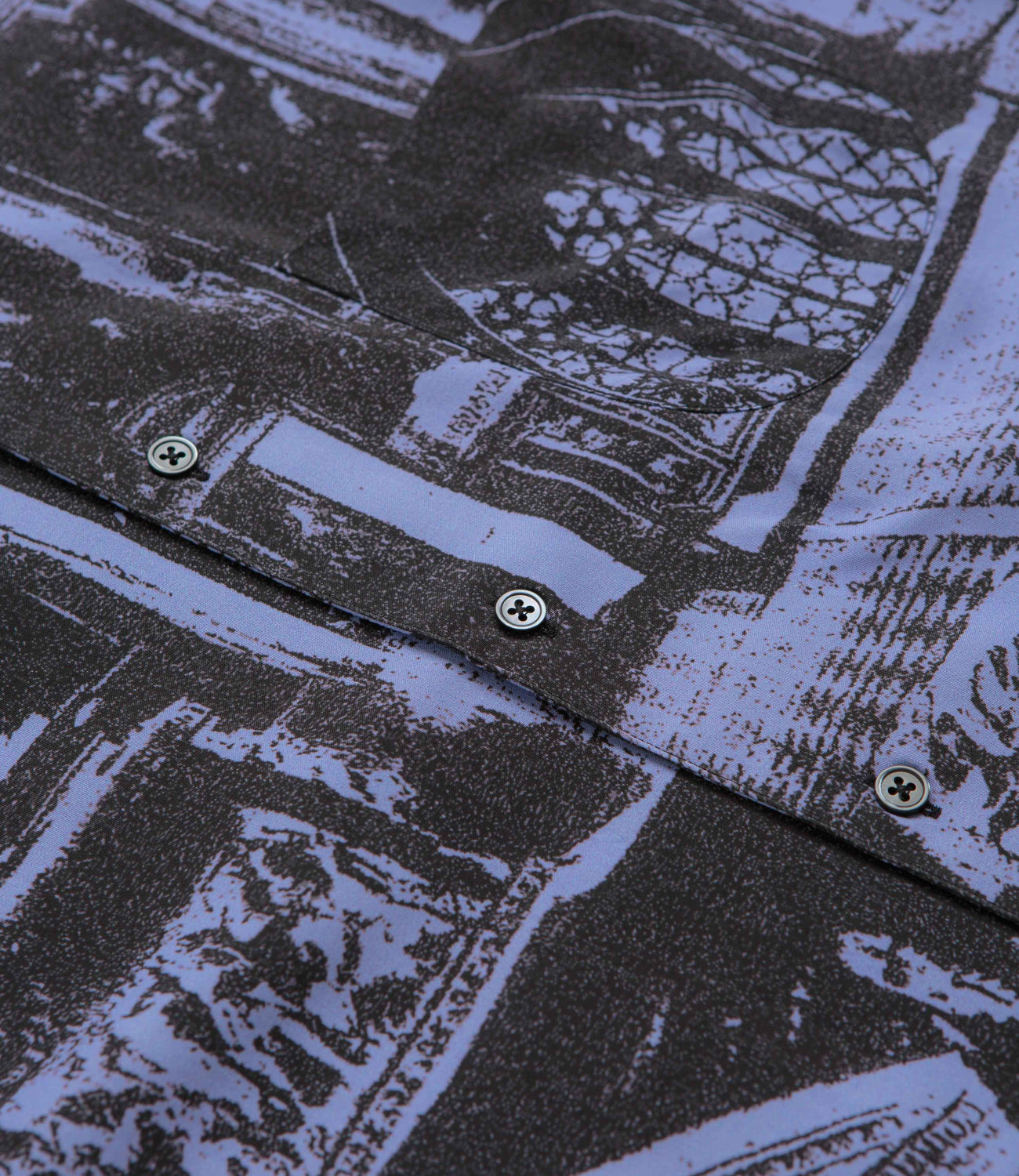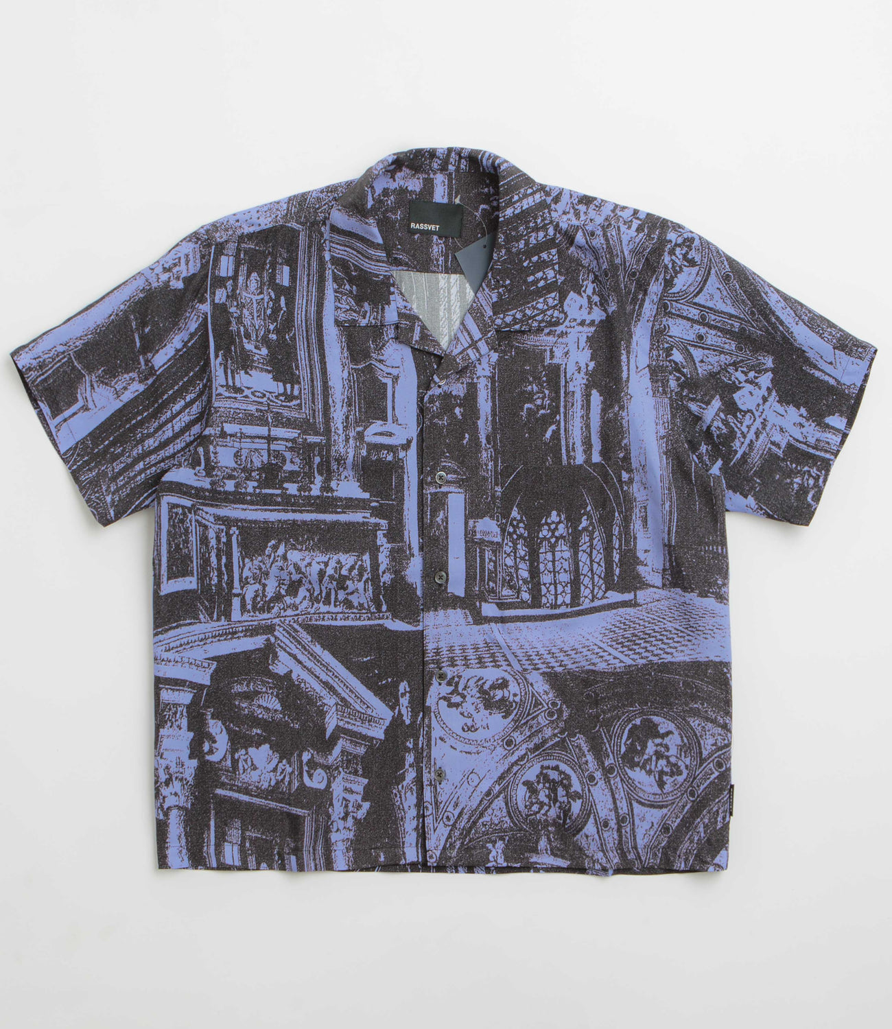 Rassvet Ray Short Sleeve Shirt in Print. Designed with an all-over print pattern, this regular fit Rassvet shirt is made from 100% cotton poplin. Finished in black print with a stand collar and a full length button fastening.