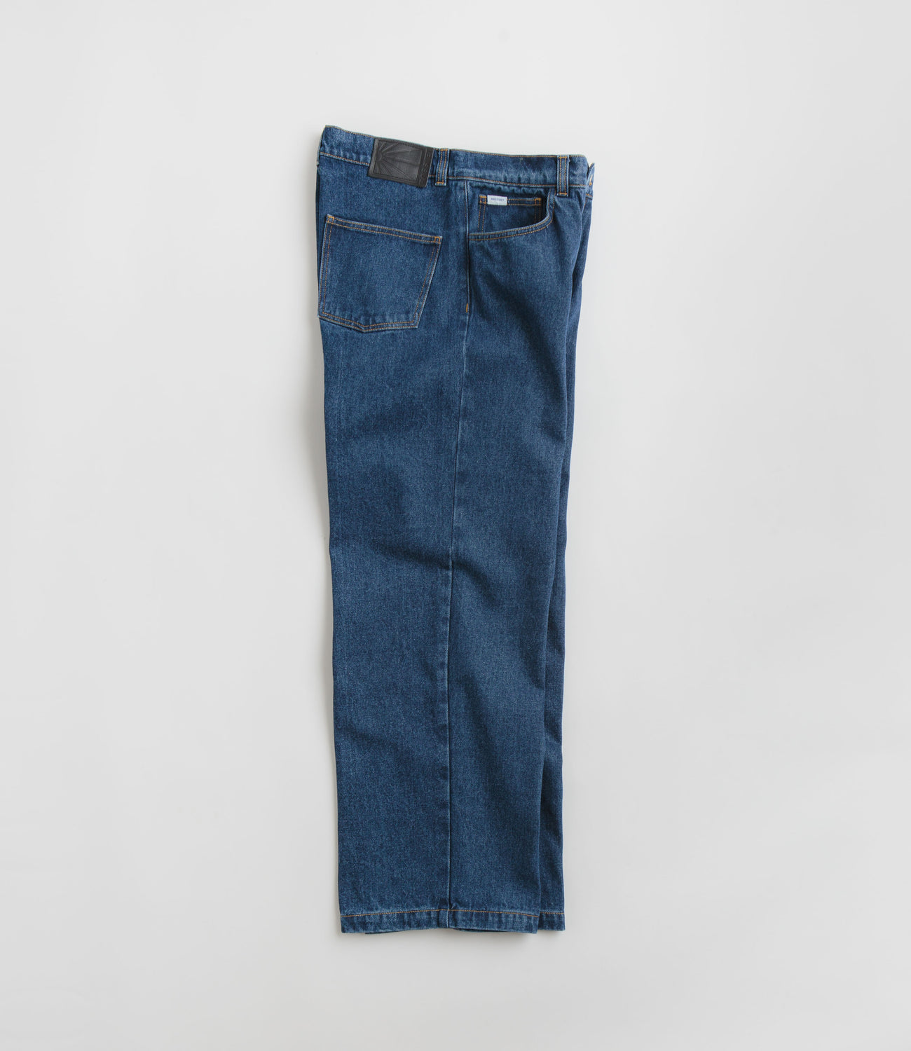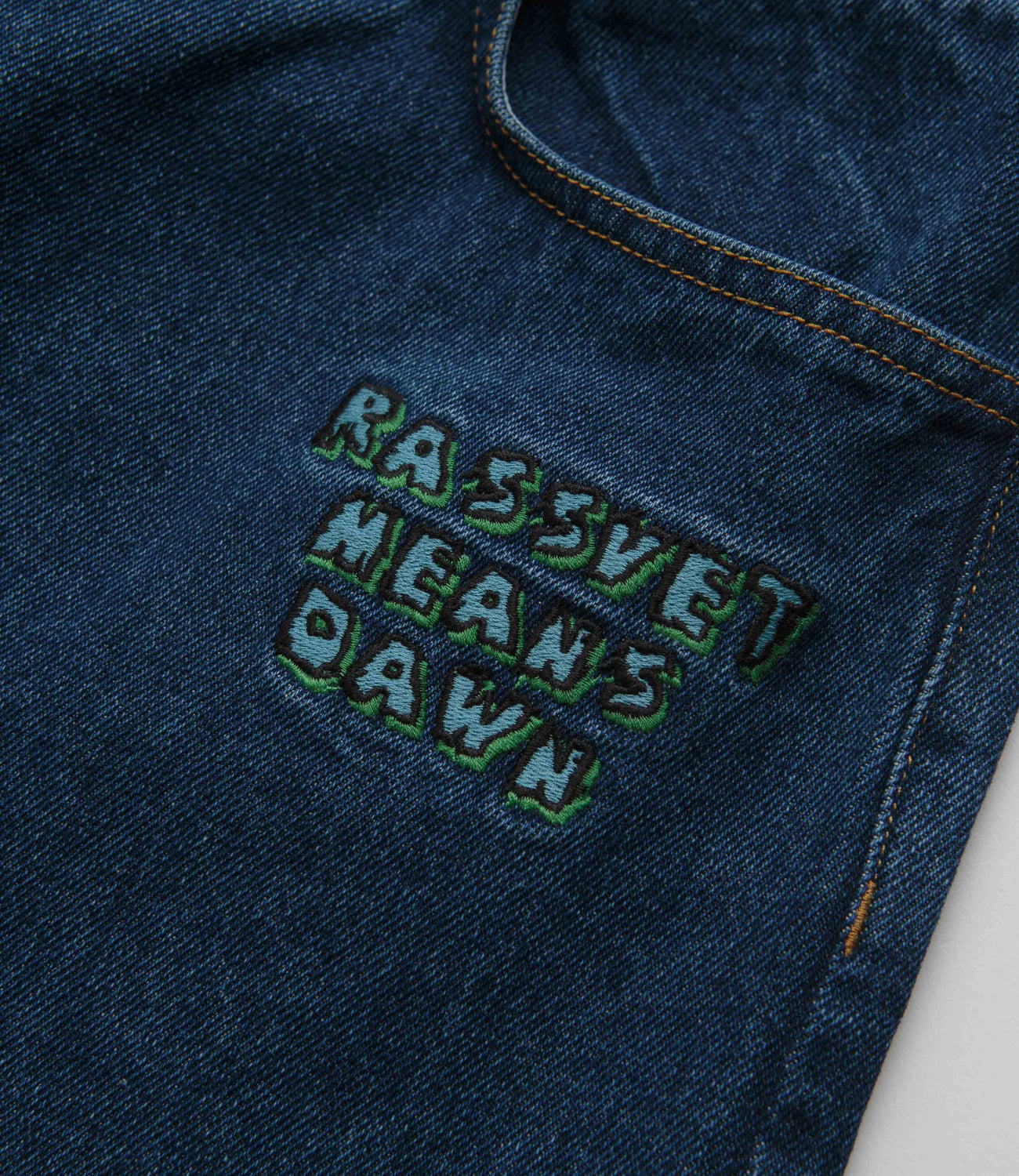 Rassvet RMD Baggy Trousers in Dark Blue. Straight legged and made from 100% cotton denim, these regular fitting Rassvet jeans are designed with a classic belt loop waist and a single button secured zipper fly. Featuring contrast stitching and left leg graphics, these dark blue Rassvet jeans are finished with two waist pockets, two rear pockets and with an integrated coin stash.