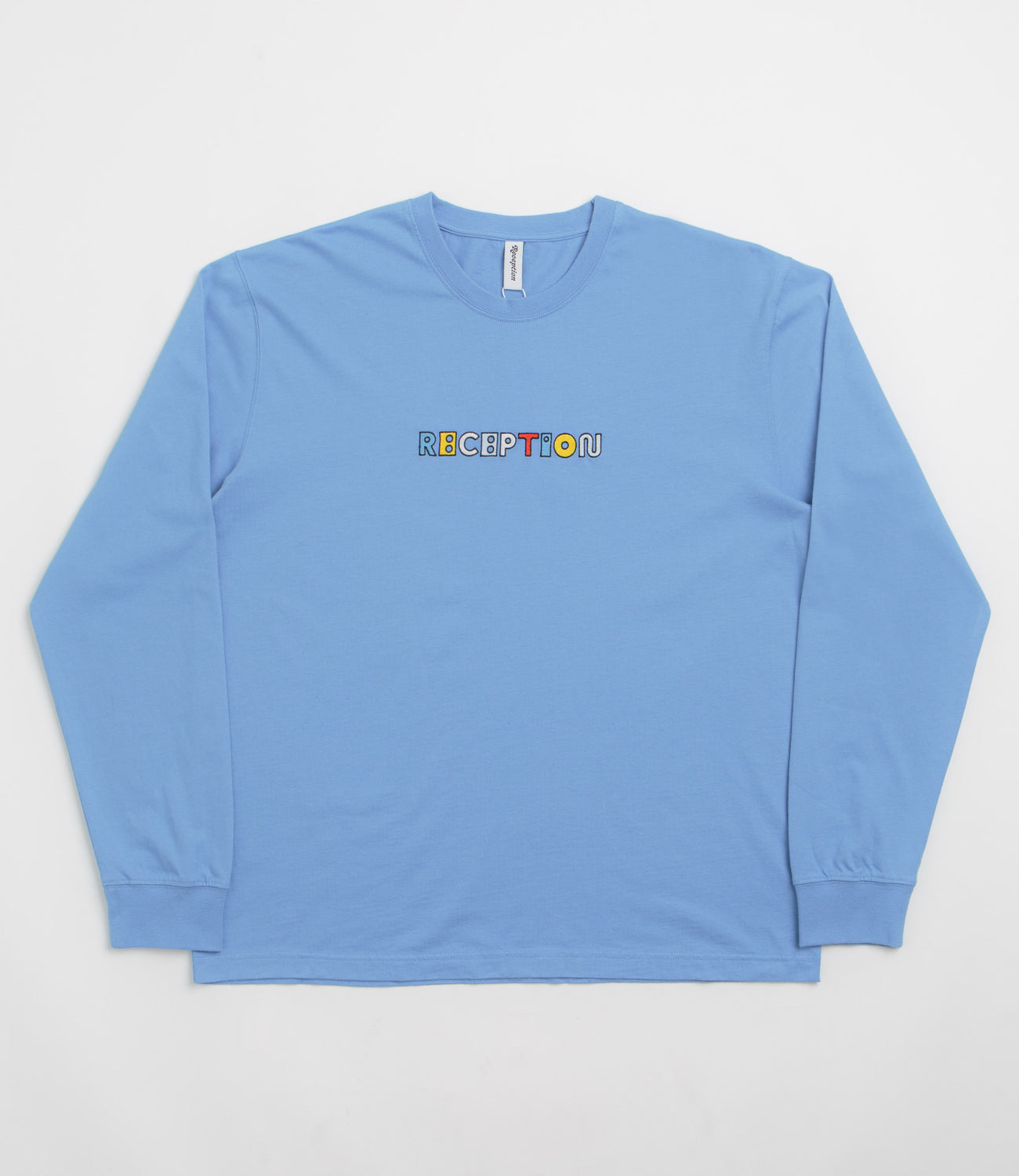 Reception Motto Long Sleeve T-Shirt in Granada Blue. Tailored to a regular fitting from 100% cotton, this midweight Reception t-shirt is styled with a flexible rib knit collar and ribbed cuffs. Finished with a straight cut hem, this blue Reception t-shirt is finished with a woven side seam flag label and with embroidered centre chest branding.