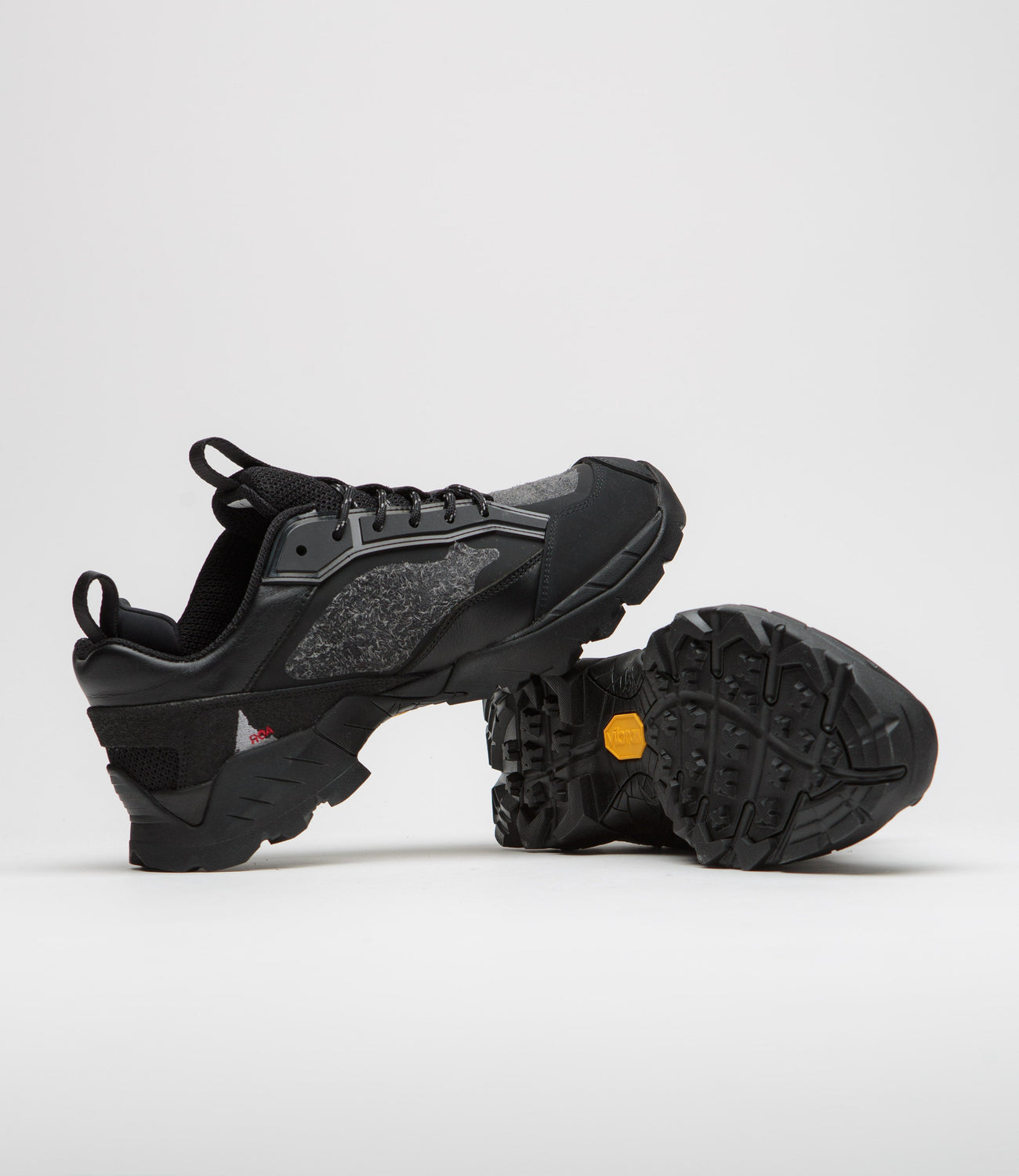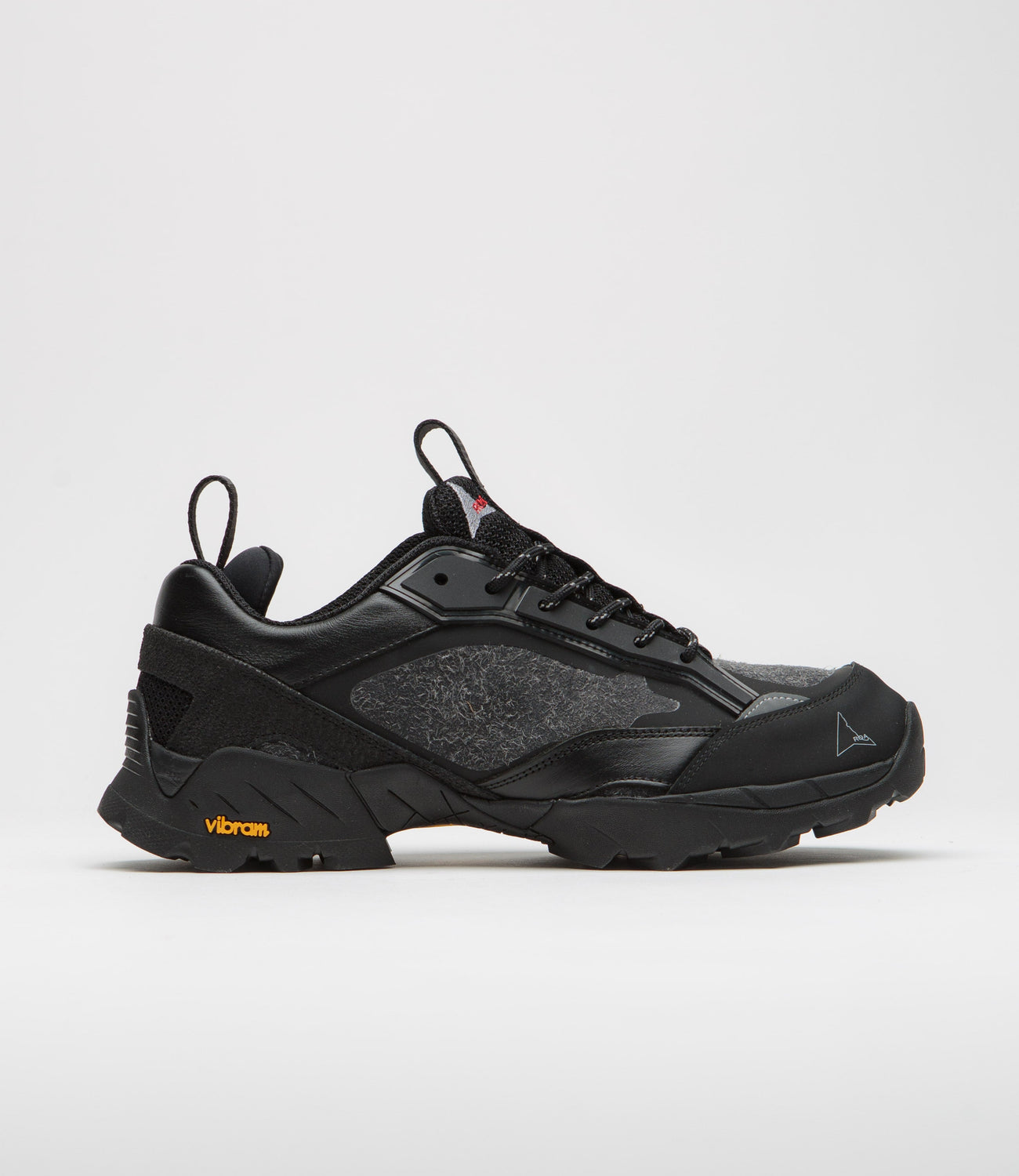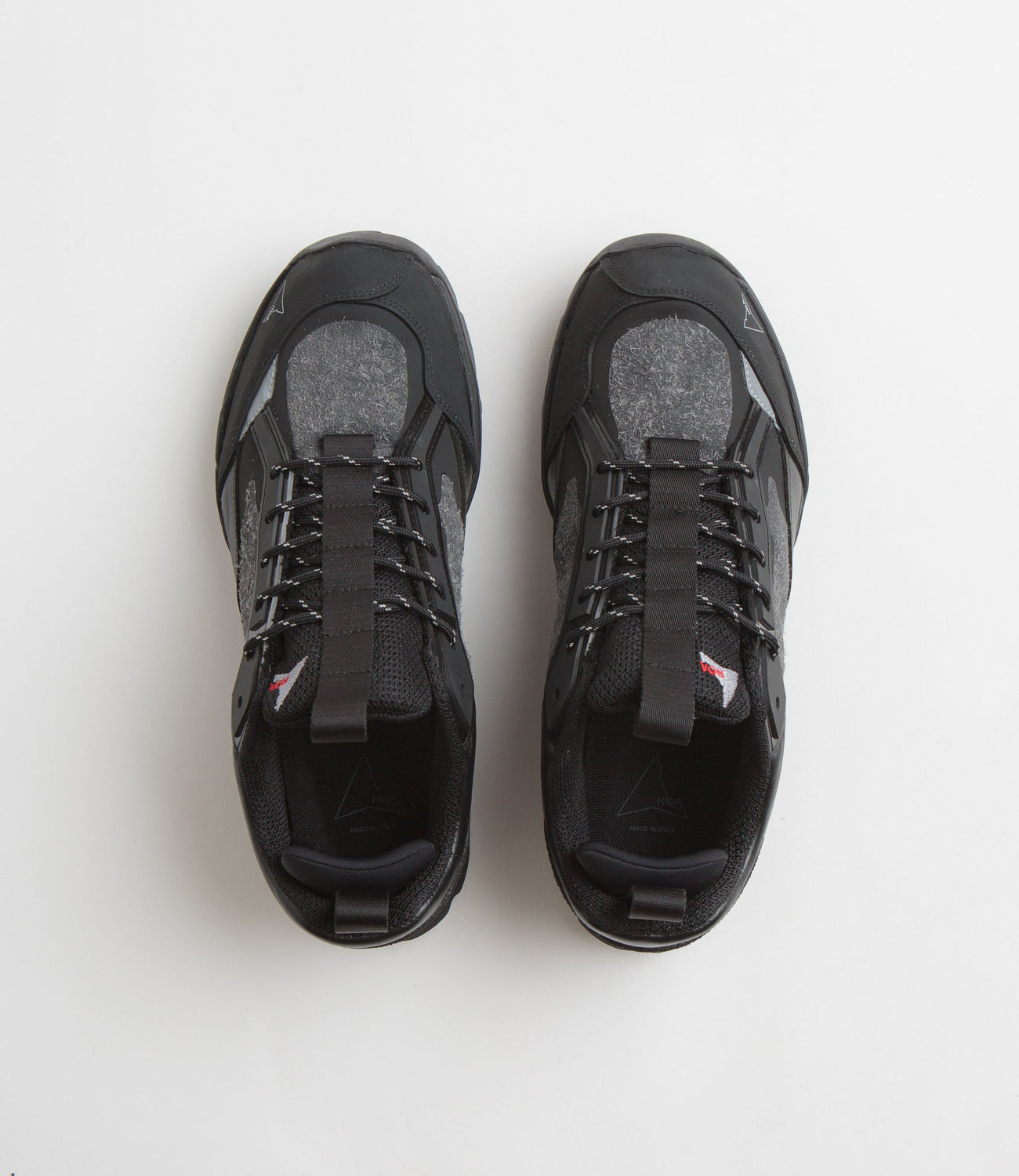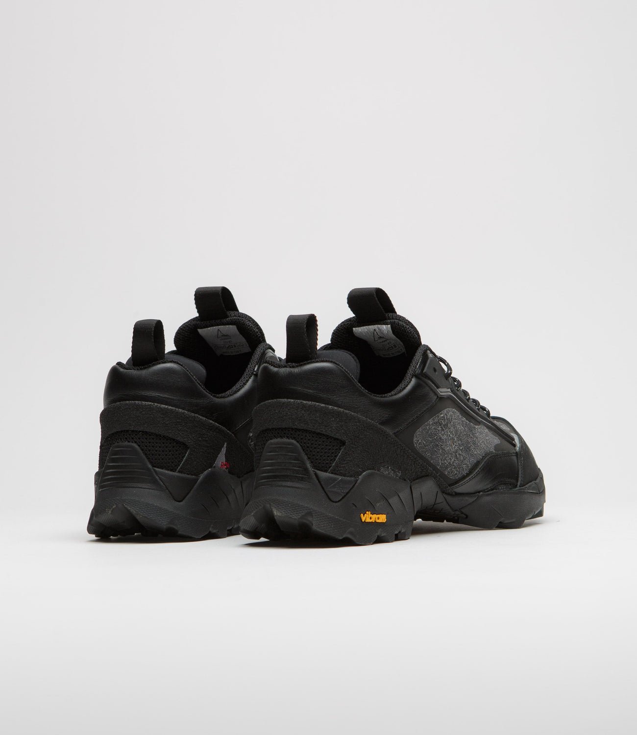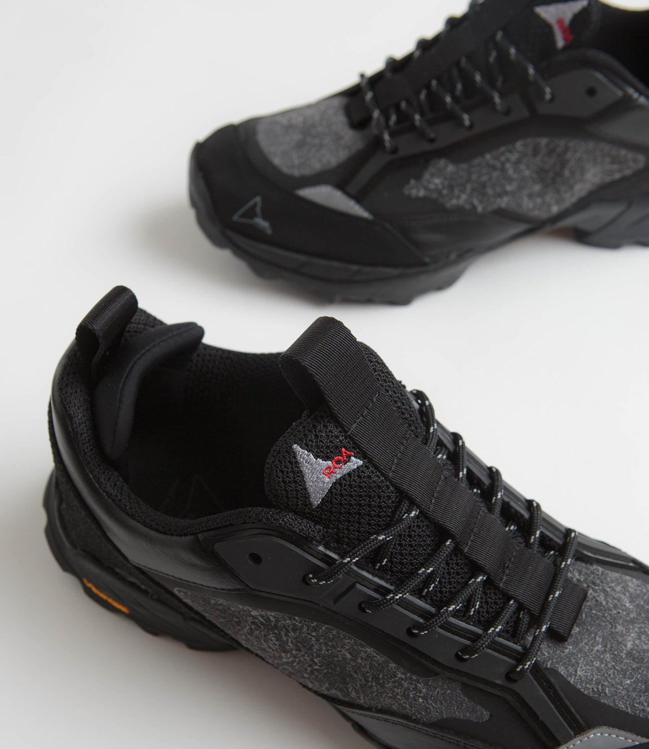 ROA Lhakpa Shoes in Black. A hiking hybrid designed with water-repellent rough suede panels, this ROA Lhakpa is designed with mesh underlays and a rubberised toe cap. Featuring a hiking style lacing system, a Vibram® outsole and a Vibram® Megagrip Toothed tread, this black ROA Lhakpa also features mirrored woven pull tabs. Finished with printed ROA forefoot logos, printed insoles and with an embroidered, padded tongue.