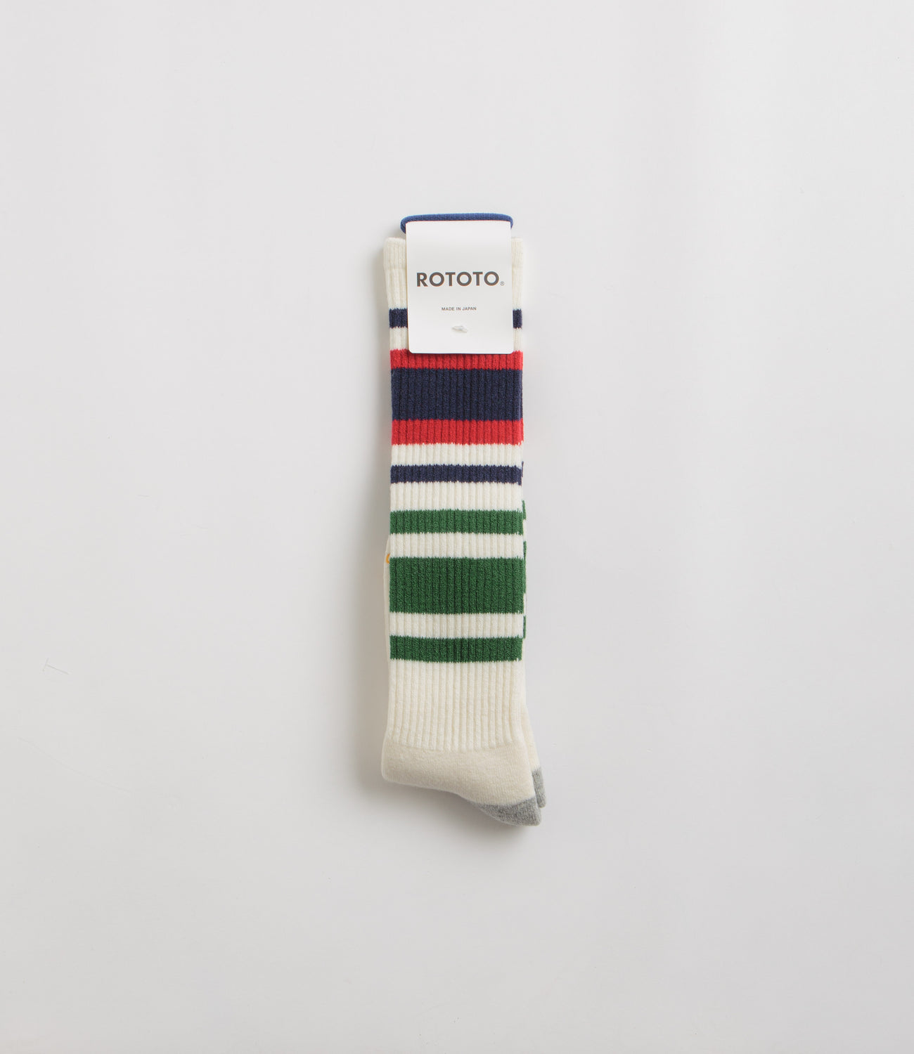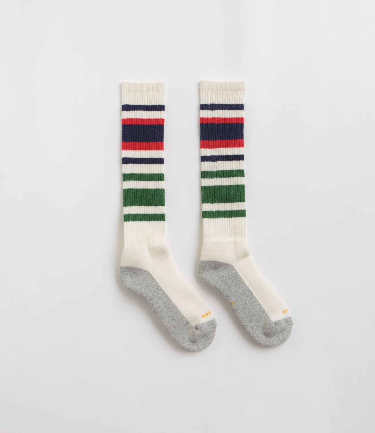 RoToTo Multi Oldschool Socks in Navy and Red. Made from an acrylic-wool blend, these extended length RoToTo socks are designed with striped uppers. Finished with ribbed cuffs in a shade of off-white with red, blue and green stripe detailing.