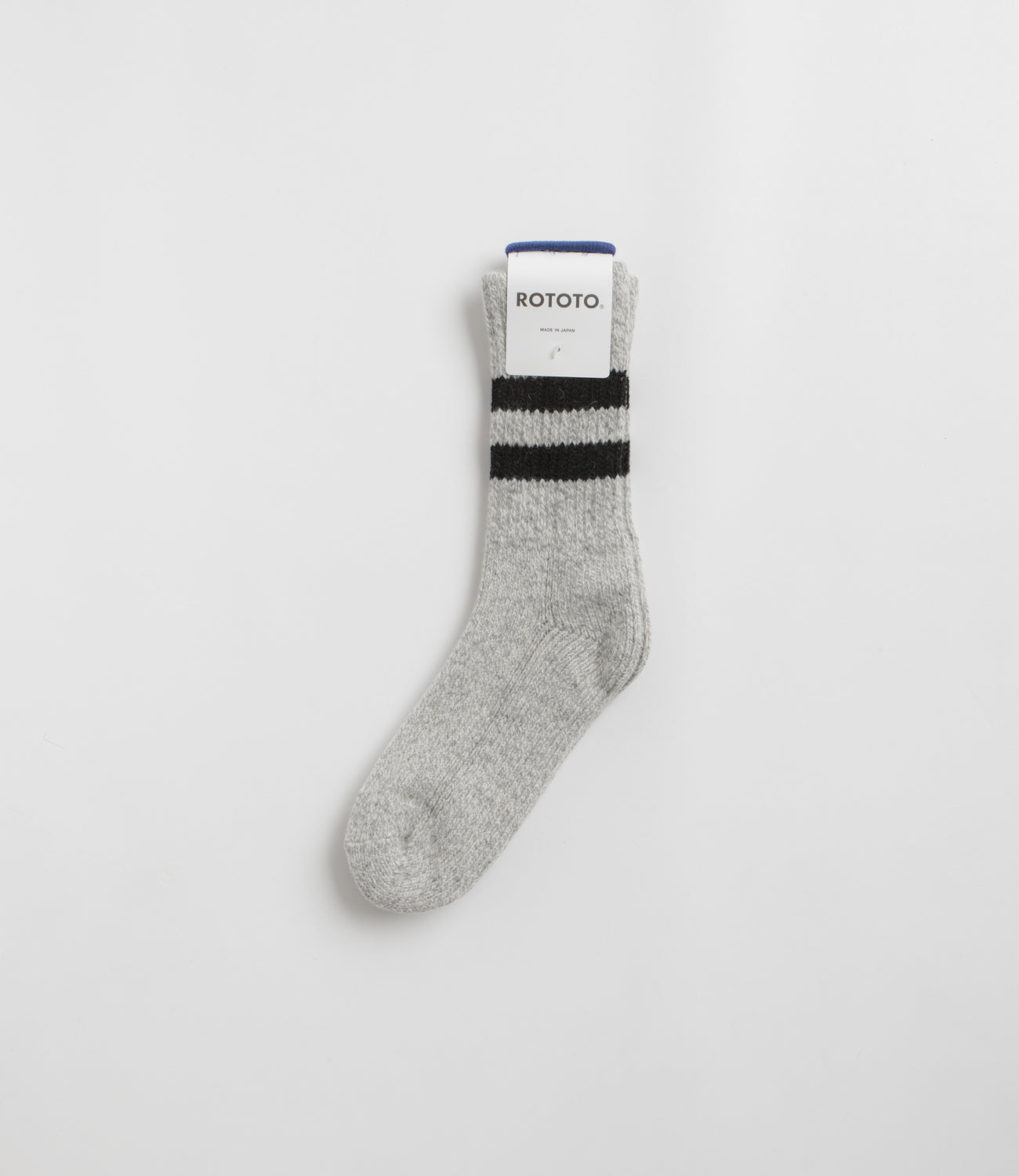 RoToTo Retro Winter Socks in Grey and Black. Made from a wool-acrylic blend, these crew length RoToTo socks are styled with ribbed cuffs. Finished in a shade of grey with contrasting black stripes.
