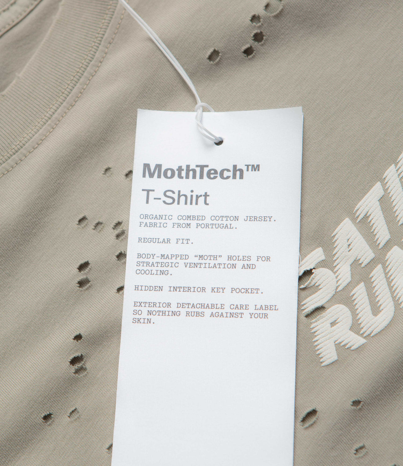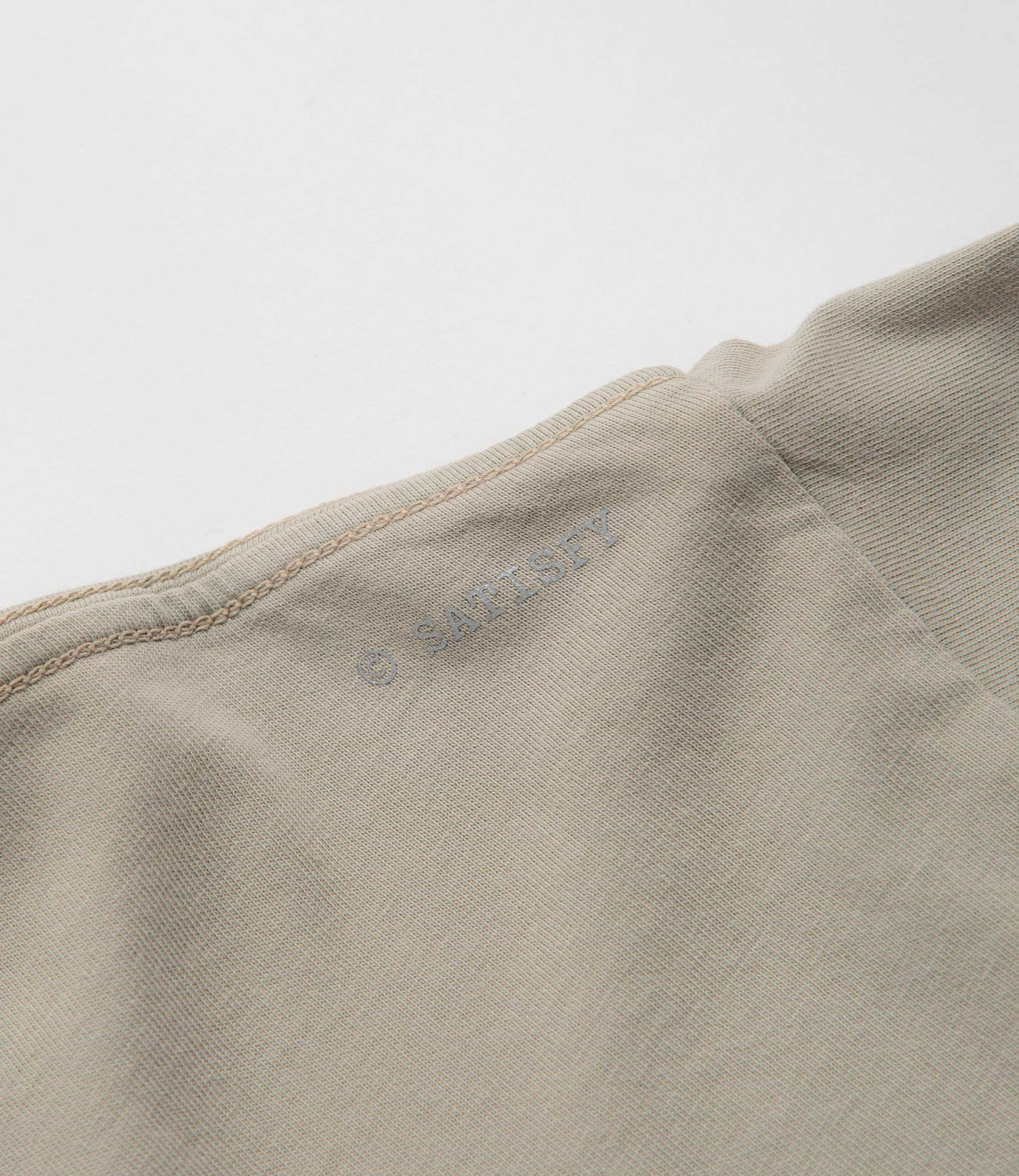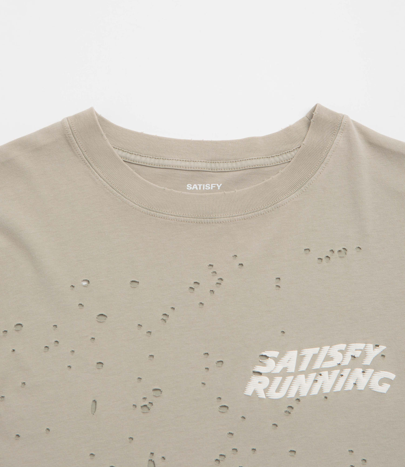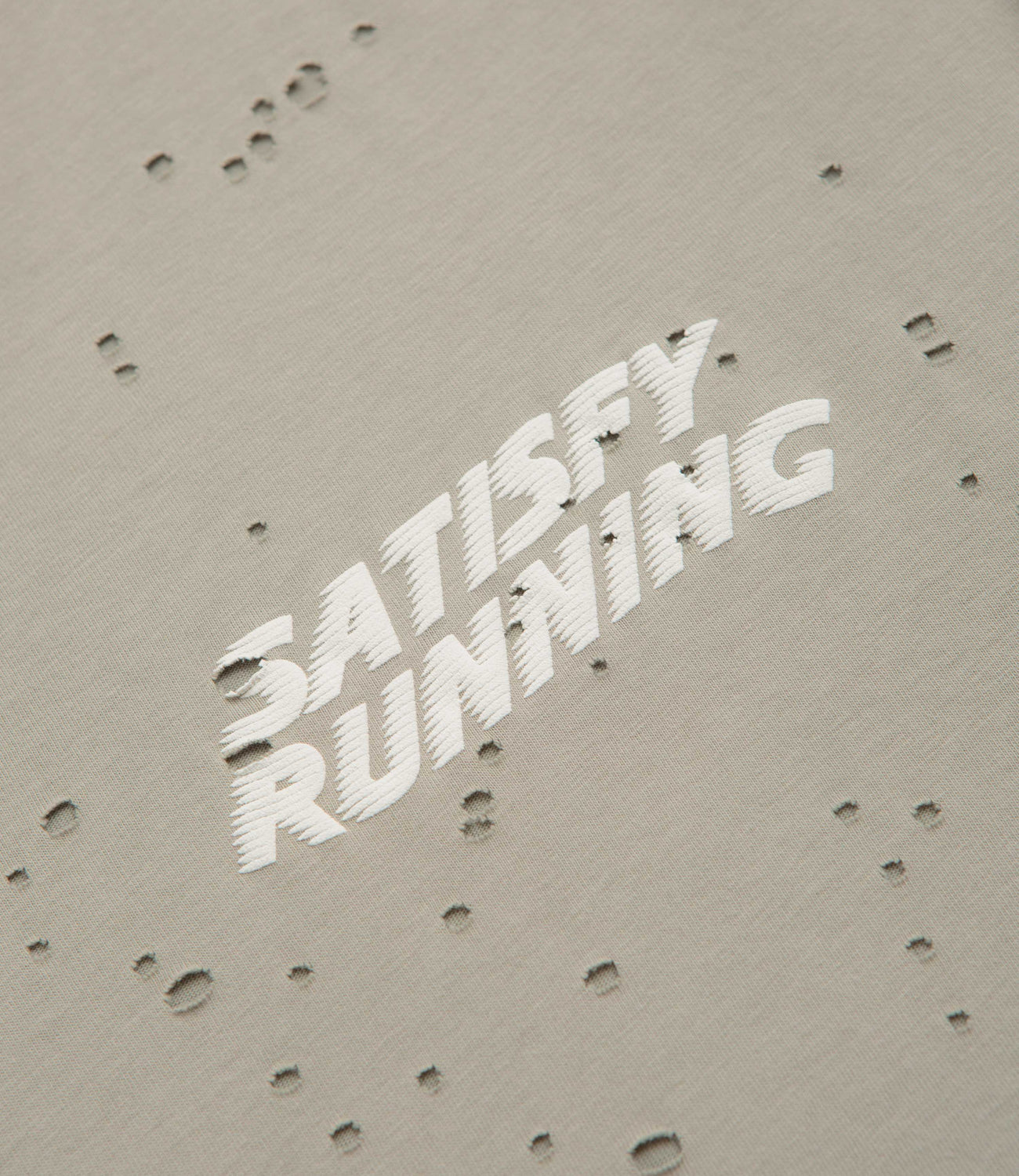 Satisfy MothTech T-Shirt in Aged Sage. Regular fitting and made from 100% organic cotton combed jersey, this Satisfy t-shirt is designed with body-mapped MothTech™ ventilation holes. Featuring a flexible rib knit collar, a straight cut hem and puffy print graphics, this green Satisfy t-shirt is finished with a concealed inner pocket and with a detachable care label.
